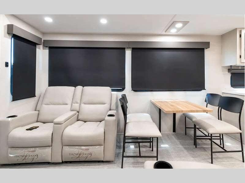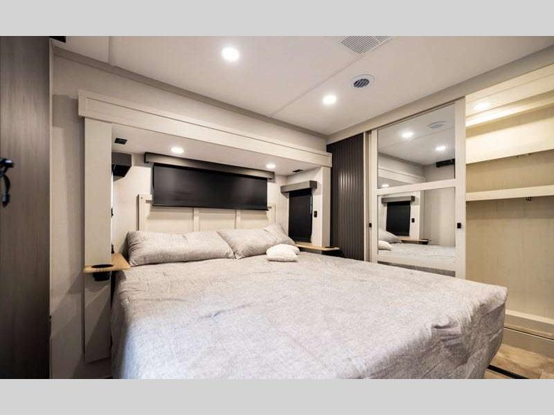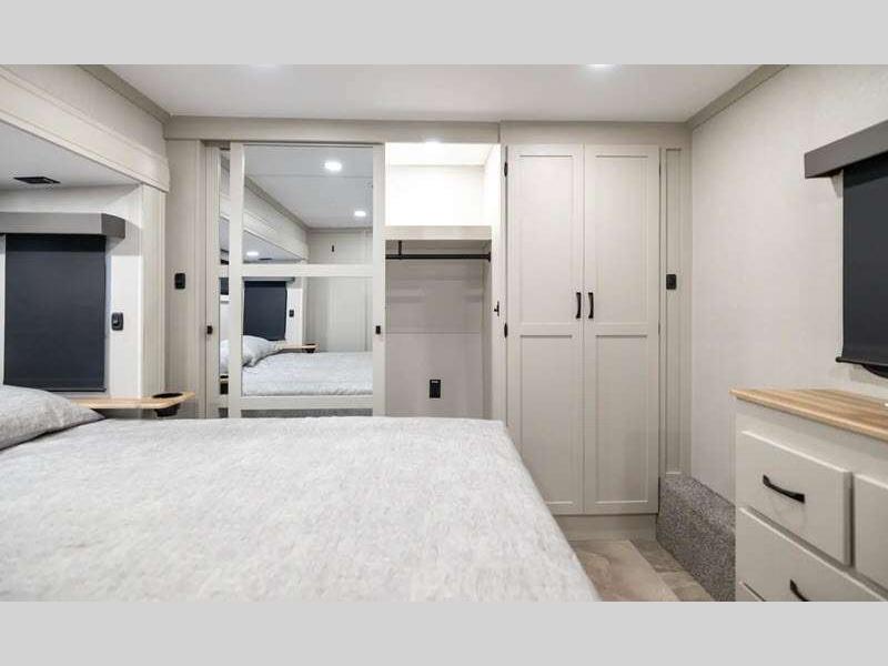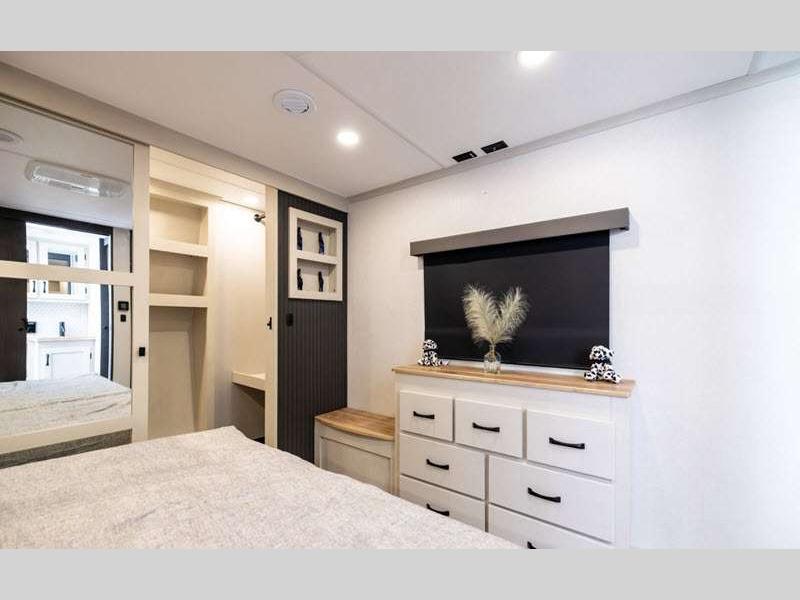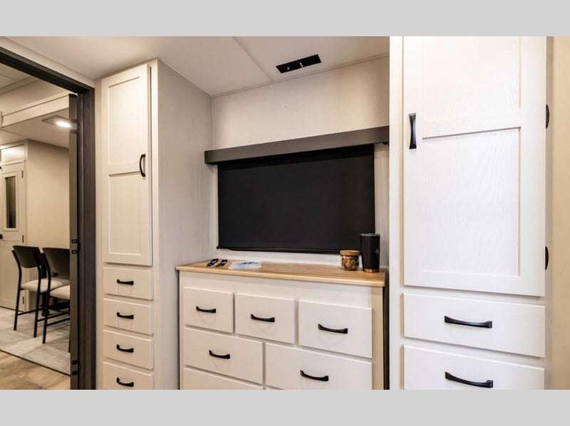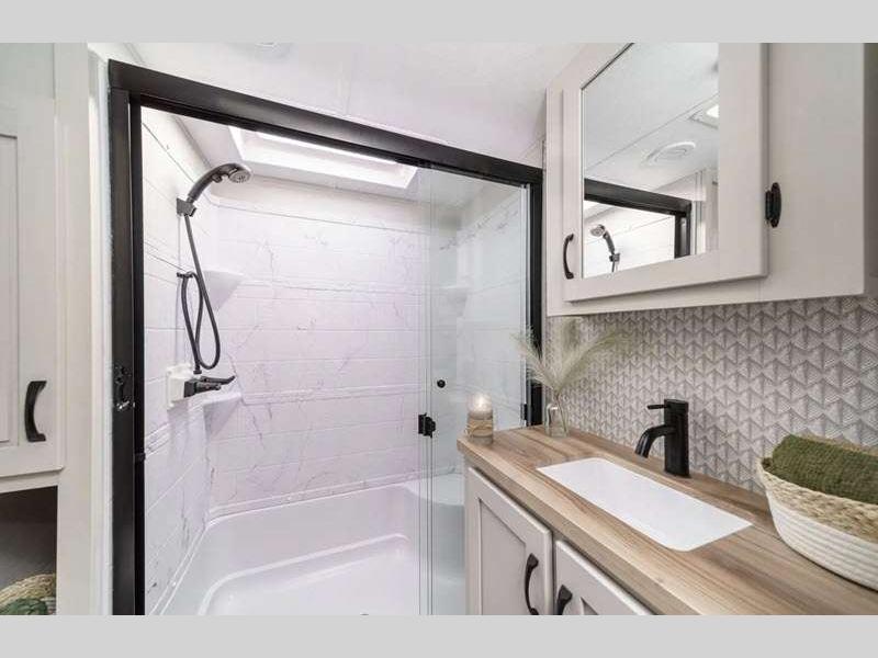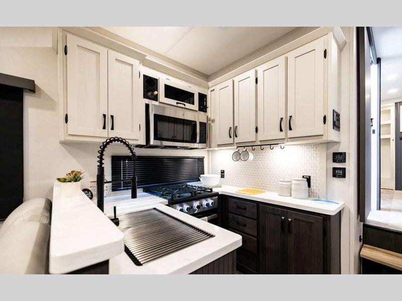The Tri-Tex powder coated frame technology is up to 5X more weather resistant, and the Road Guardian Package features self-adjusting brakes and anti-lock braking safety system that is also smart app friendly helping with shorter and more stable stopping distance. Each model includes a gear driven 6-point electric auto-leveling system, so you spend less time setting up and more time relaxing. You'll be pleasantly surprised to find at-home amenities throughout these fifth wheels, including solid surface countertops in the kitchen, slow rise roller night shades, a full-size shower with sliding glass doors, and so much more!