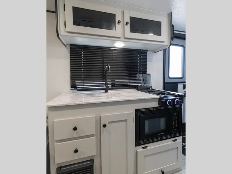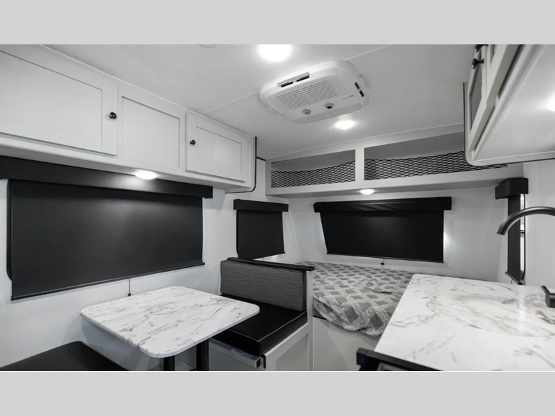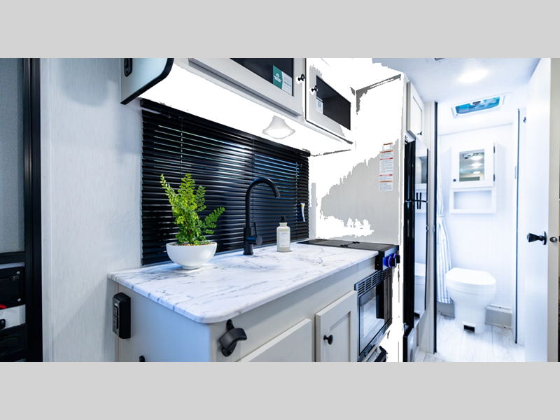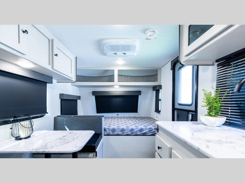 This cute, but mighty travel trailer features a true Aluma-cage construction with dual layer Azdel vacuum-bonded fiberglass exterior. The fiberglass front cap features LED lighting and a window for a great view of your surroundings. There is an insulated floor with seamless decking, four stabilizer jacks to make setup super easy in camp, a quick disconnect LP hook-up for convenience, as well as an outside shower. Plenty of storage can be found both inside and out with magnetic baggage door catches to keep things secure. You will also appreciate the power awning with LED light, and with the available wilderness package, you can enjoy an upgraded cast iron griddle and prep bar for easy outdoor cooking.