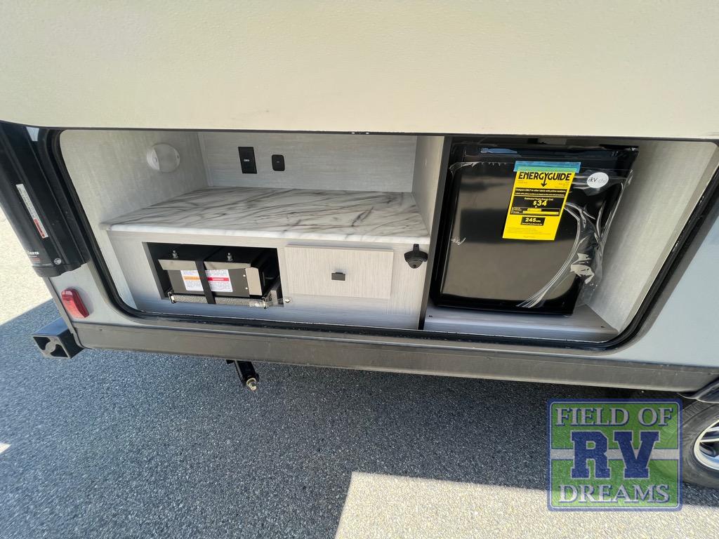 Double-size bunks make any camping trip fun, so pack your bags and head out! When you arrive at the campground you can make a quick lunch on the outdoor camp kitchen, and unload the exterior pass-through storage. A fully-equipped kitchen indoors includes a three burner cooktop, a microwave oven, plus a stainless steel sink with a flush-mount cover for added counter space. You will love having your own full bath on board, as well as a front bedroom with a queen bed and dual wardrobes.