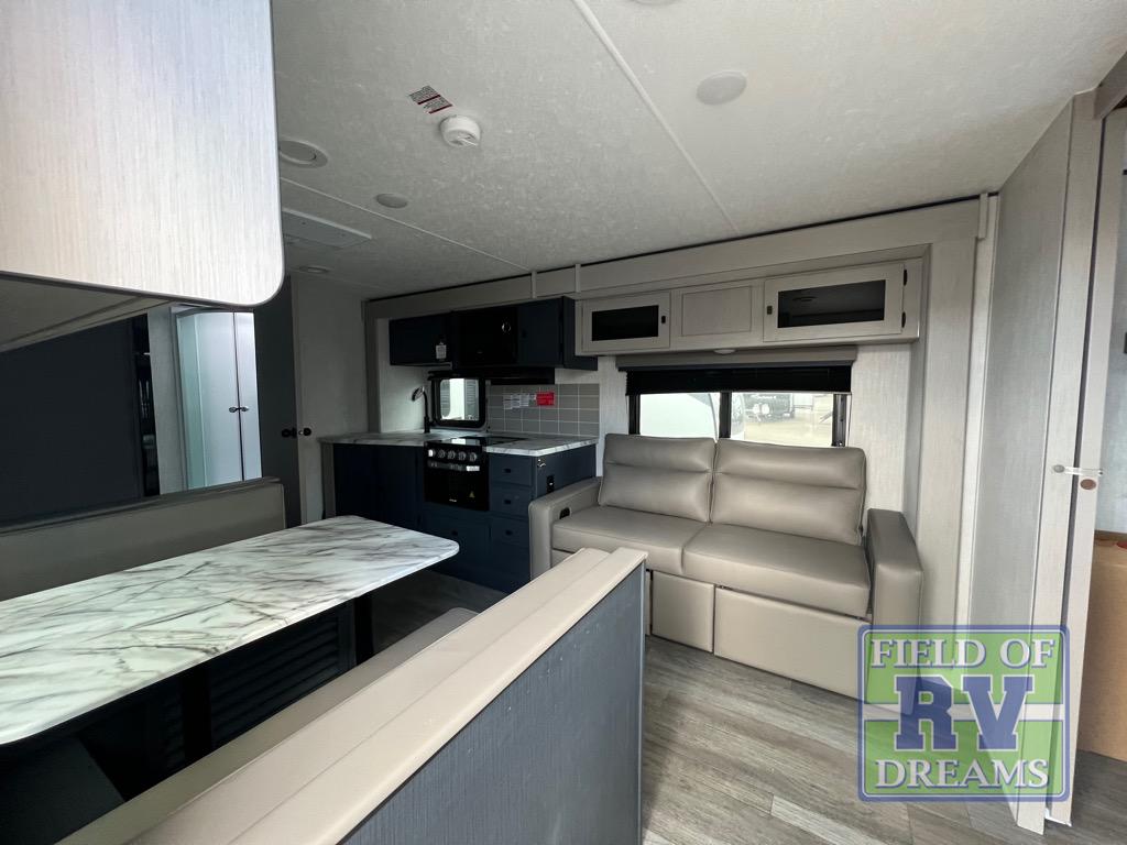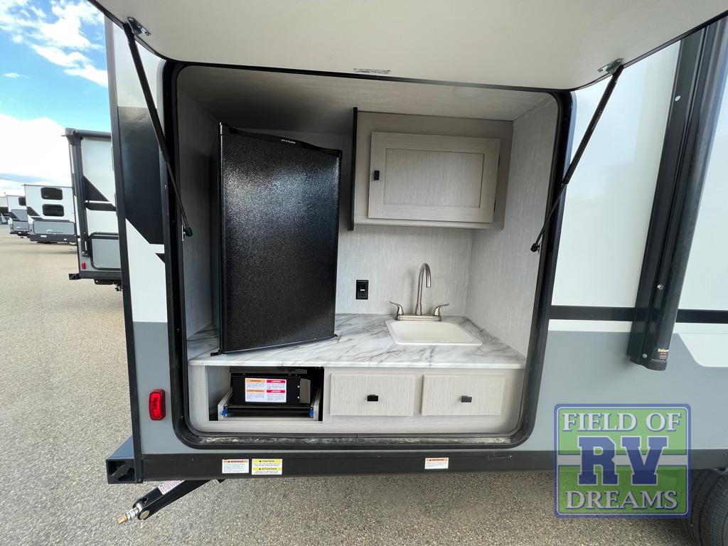 Escape the city life for relaxing weekend in this spacious travel trailer. A large slide out provides plenty of space to relax on the sofa or dine at the booth dinette. The full rear bath will allow you to stay clean throughout your trip. The chef can choose to cook indoors on the three burner cooktop, or head outdoors to cook on the outside kitchen! And when it's time to turn in for the night you'll have your own private bedroom up front with a queen bed and dual wardrobes, and any guests you have can sleep on the sofa and booth dinette!