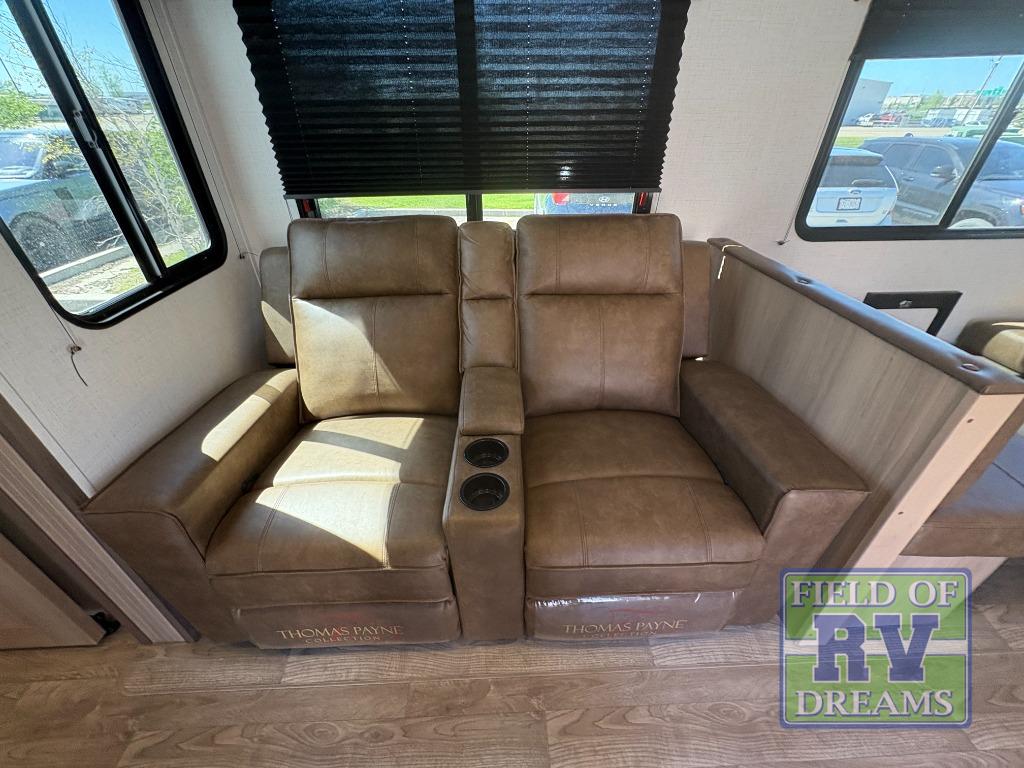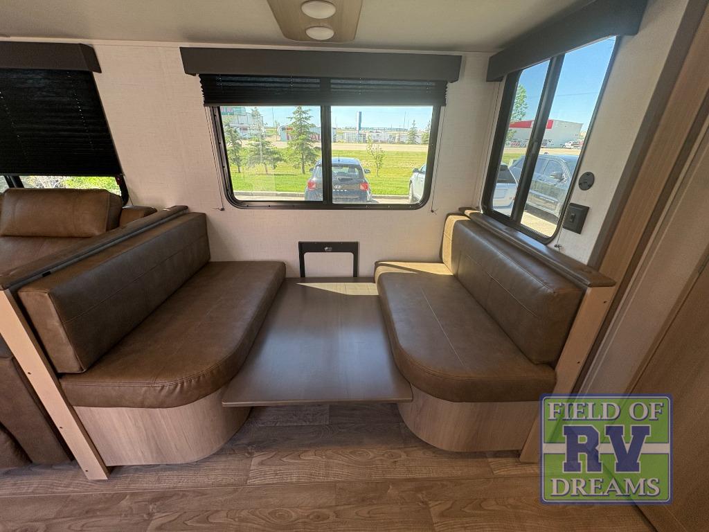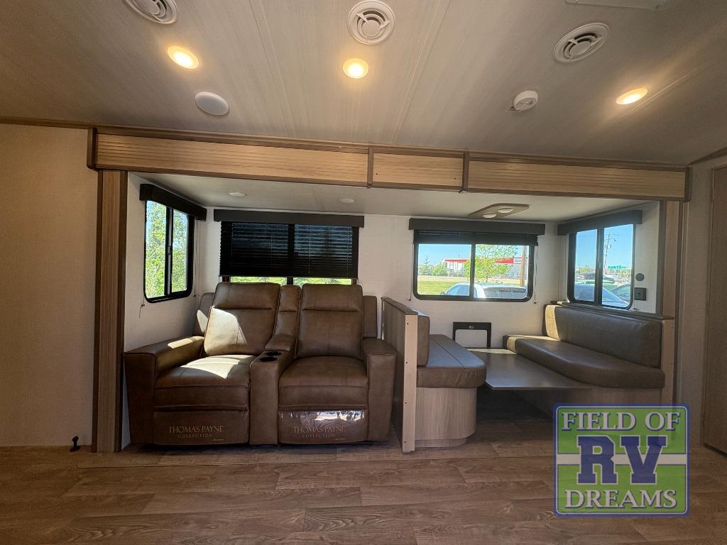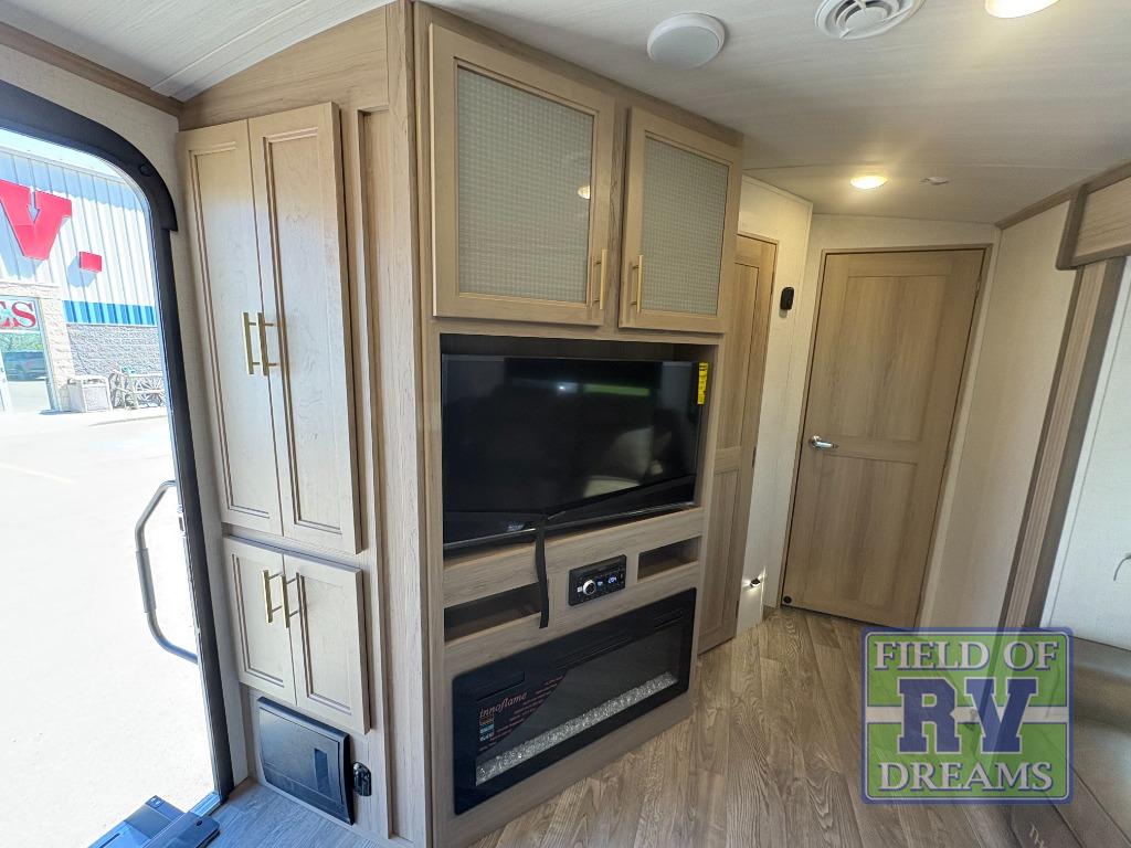 Come see all that this travel trailer has to offer! You will get a good night's rest each night on the 72" x 75" king bed slide, and your furry friend can sleep in there too with the built-in pet kennel storage underneath. There is even one of the dual entry doors to the unit, and an entrance into the dual entry bathroom which has a 34" radius shower to freshen up in every morning. Head to the front kitchen to brew a cup of coffee at the coffee bar then start frying up some eggs on the three burner cooktop and grab some oatmeal from the walk-in pantry. You can enjoy your meals at the booth dinette and then read the morning newspaper in comfort on the sofa sleeper across from the entertainment center with a 36" fireplace. The sofa sleeper can be switched out for optional theater seating, and the booth dinette can be switched out for the optional table and chairs!