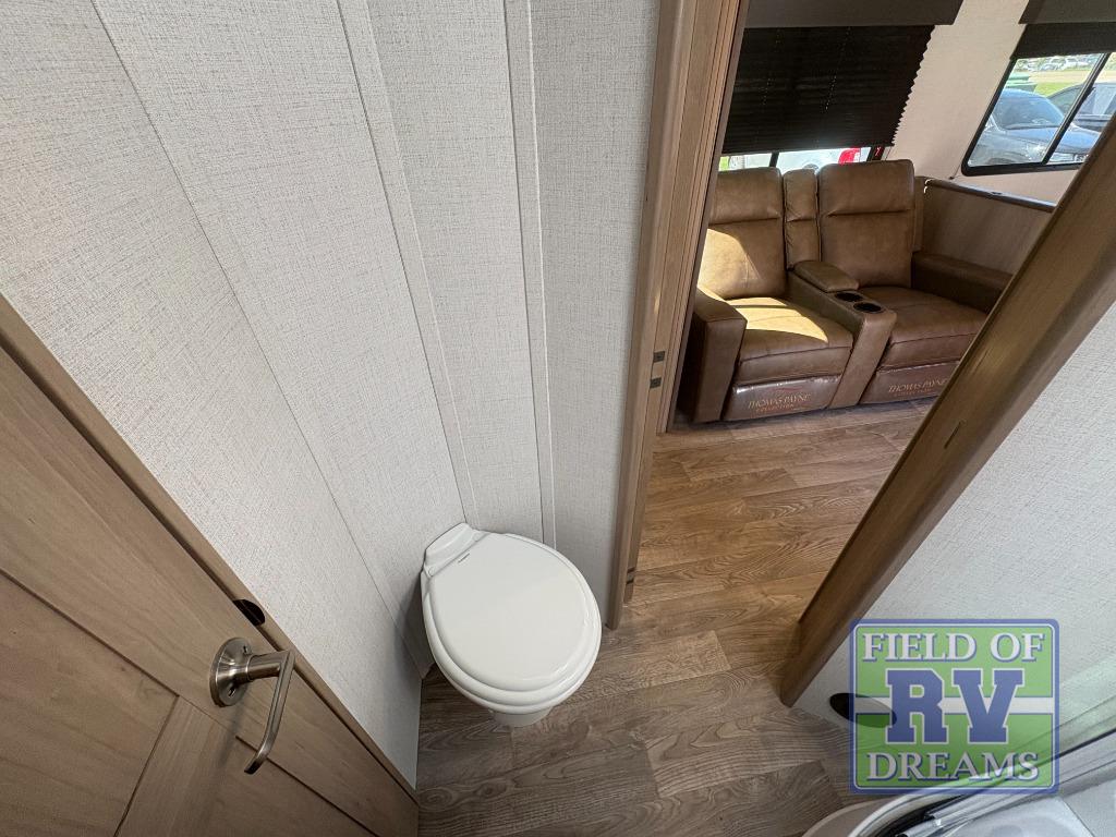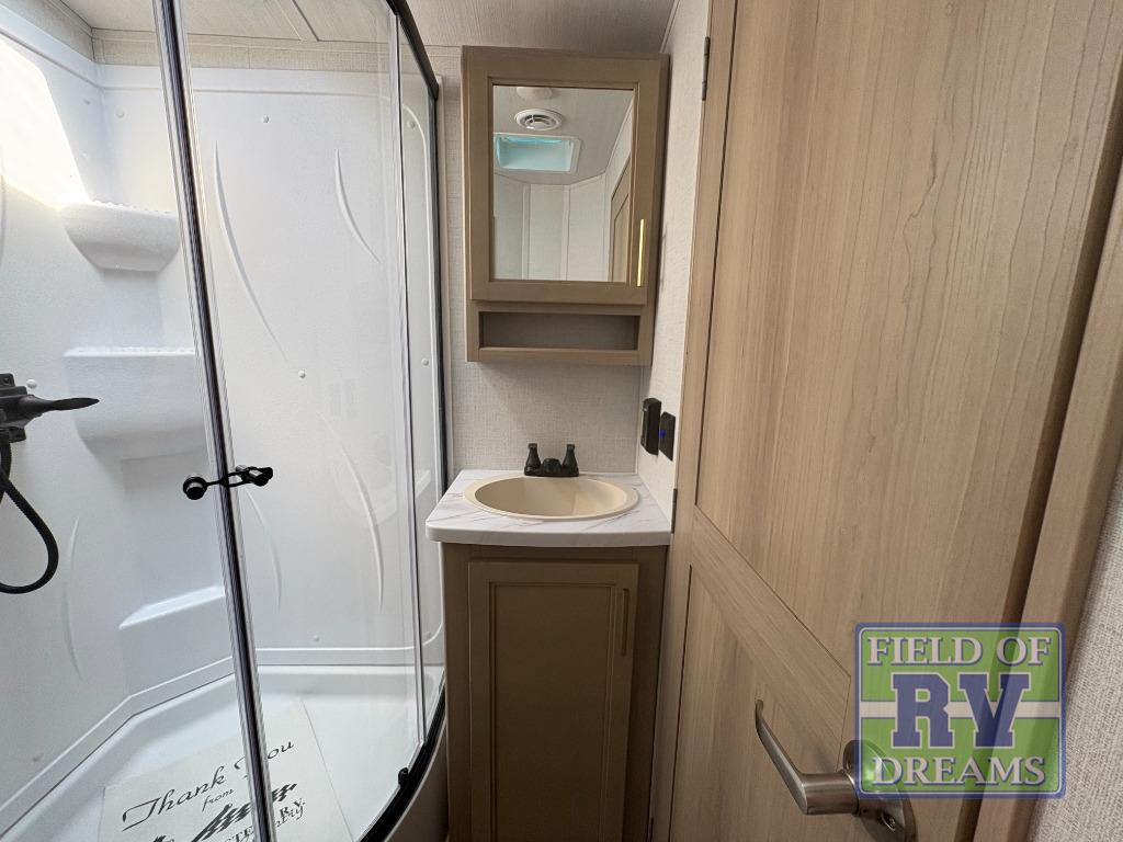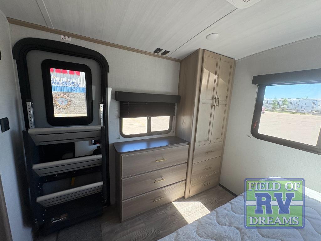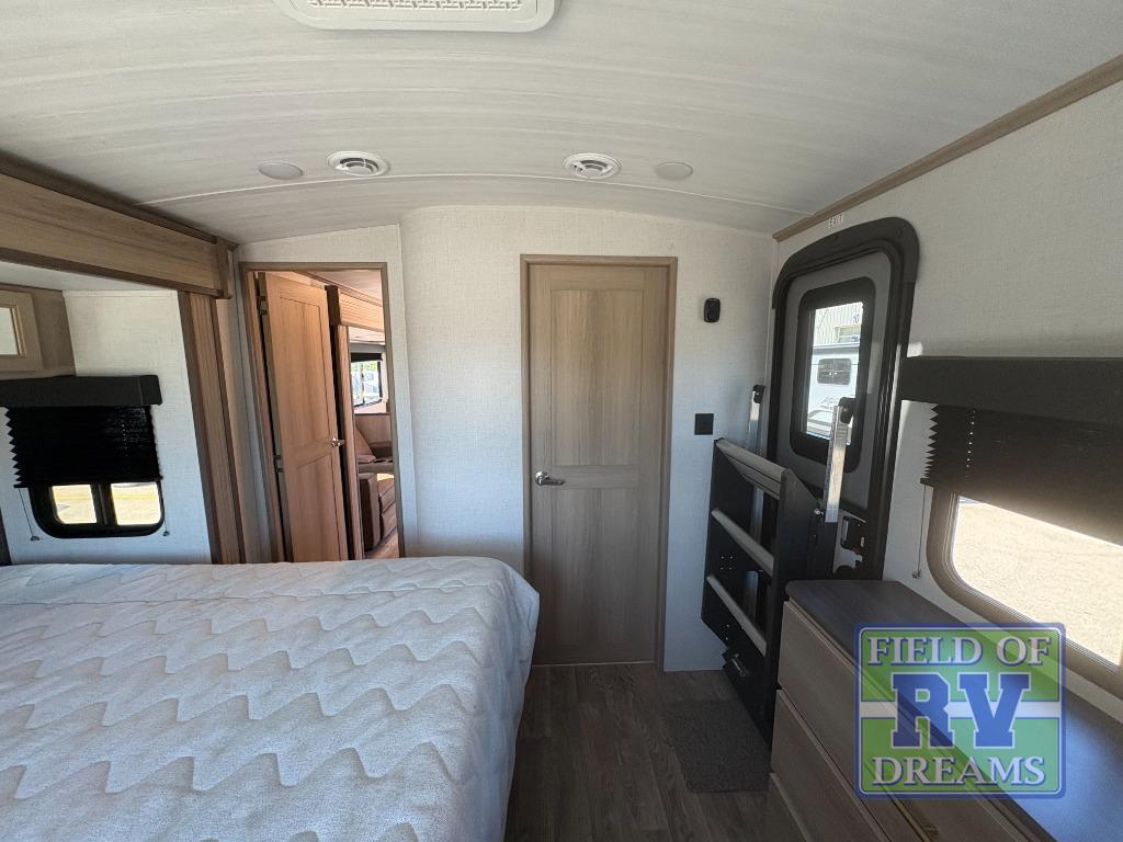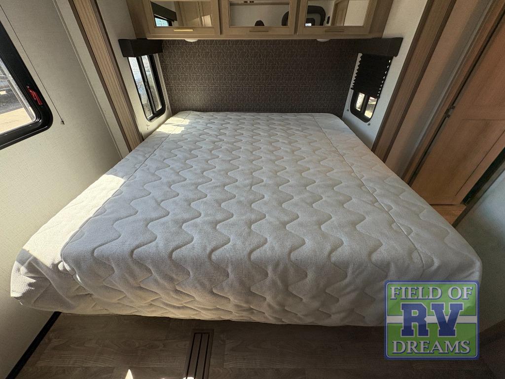 Come see all that this travel trailer has to offer! You will get a good night's rest each night on the 72" x 75" king bed slide, and your furry friend can sleep in there too with the built-in pet kennel storage underneath. There is even one of the dual entry doors to the unit, and an entrance into the dual entry bathroom which has a 34" radius shower to freshen up in every morning. Head to the front kitchen to brew a cup of coffee at the coffee bar then start frying up some eggs on the three burner cooktop and grab some oatmeal from the walk-in pantry. You can enjoy your meals at the booth dinette and then read the morning newspaper in comfort on the sofa sleeper across from the entertainment center with a 36" fireplace. The sofa sleeper can be switched out for optional theater seating, and the booth dinette can be switched out for the optional table and chairs!
