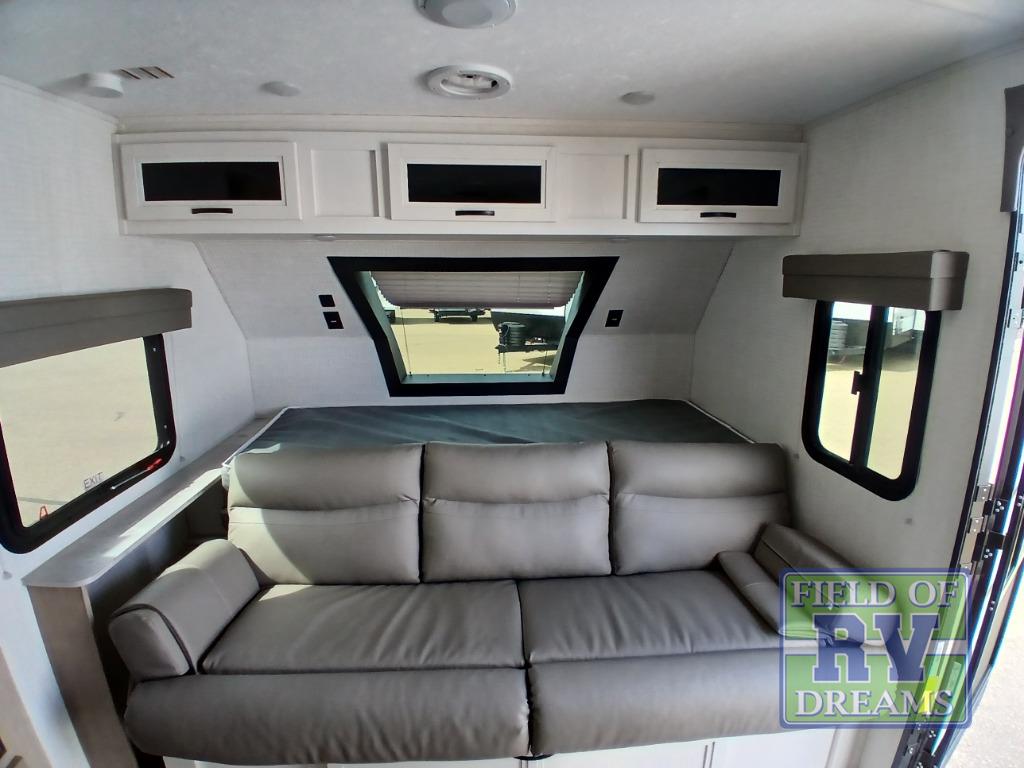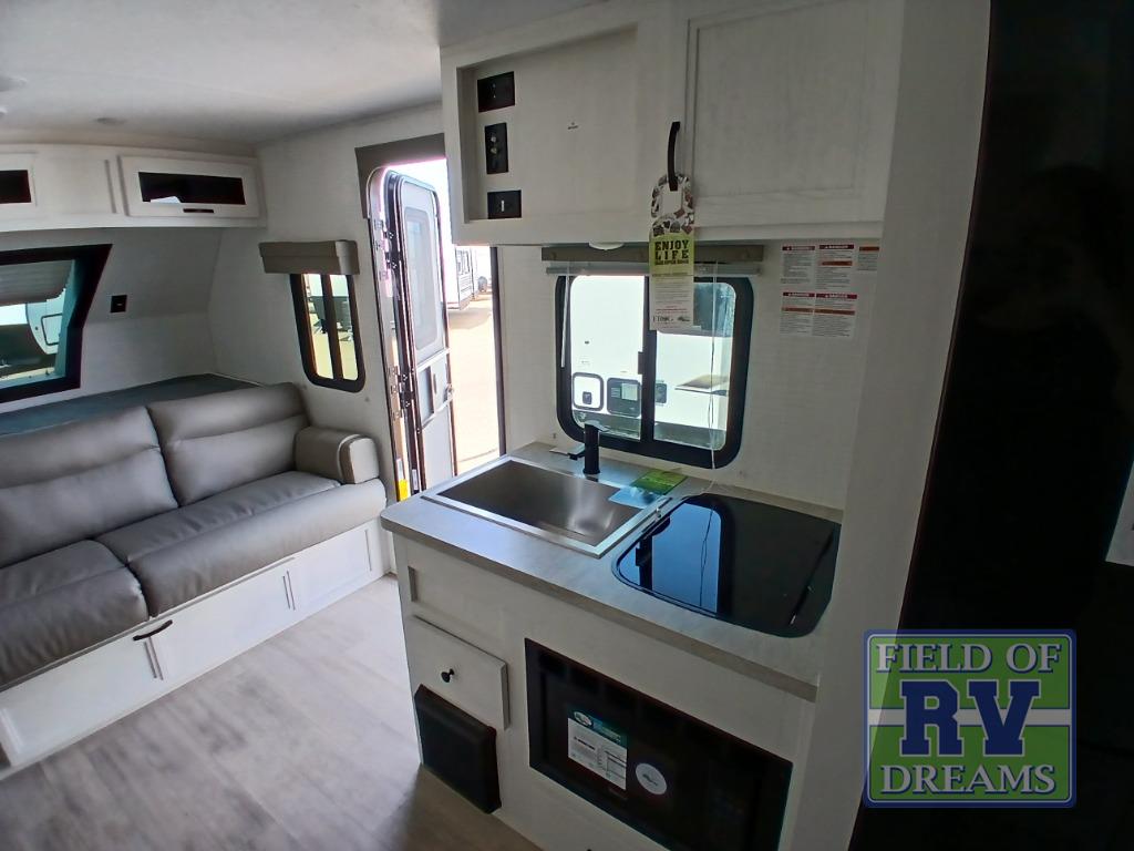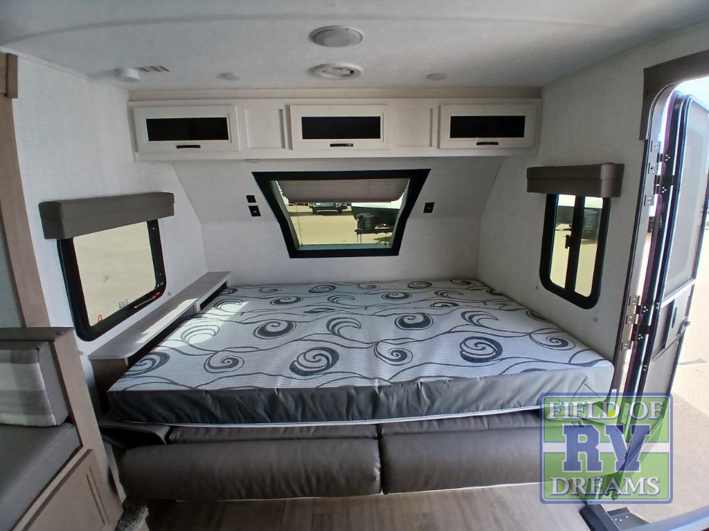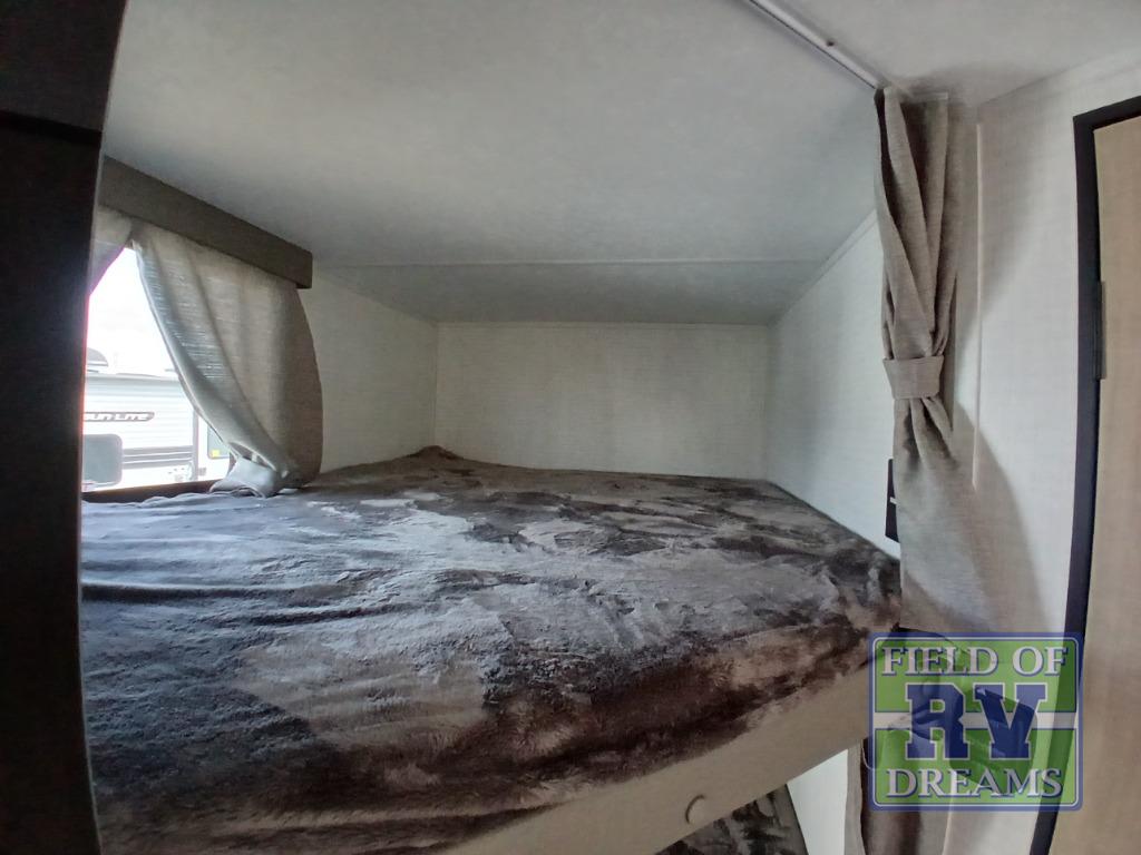 This is the perfect lightweight travel trailer that can sleep seven with the added double-size bunks. While the little ones or your guests sleep here, you will enjoy the front queen-size Murphy bed each night. In the morning, just fold up the bed to relax on the sofa and enjoy more floor space. There is also a booth dinette slide out where you can dine each day, or you can head outdoors to sit under the 17' power awning with an LED light. A two burner cooktop and microwave oven will let you prepare meals each day, and the 10 cu. ft. 12V refrigerator will keep your cold items fresh. There is even an outdoor refrigerator so you can keep cold drinks stocked and an outside storage compartment under the bunks!