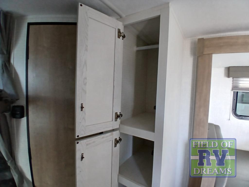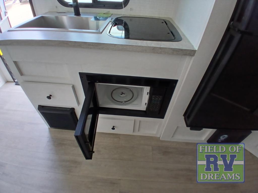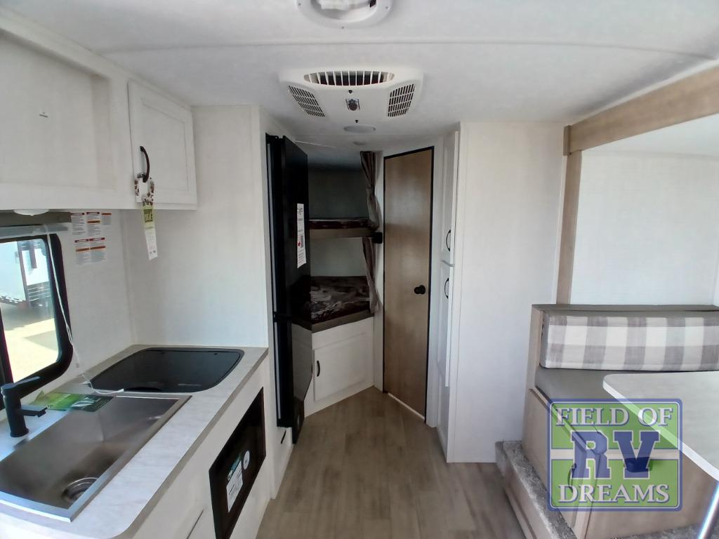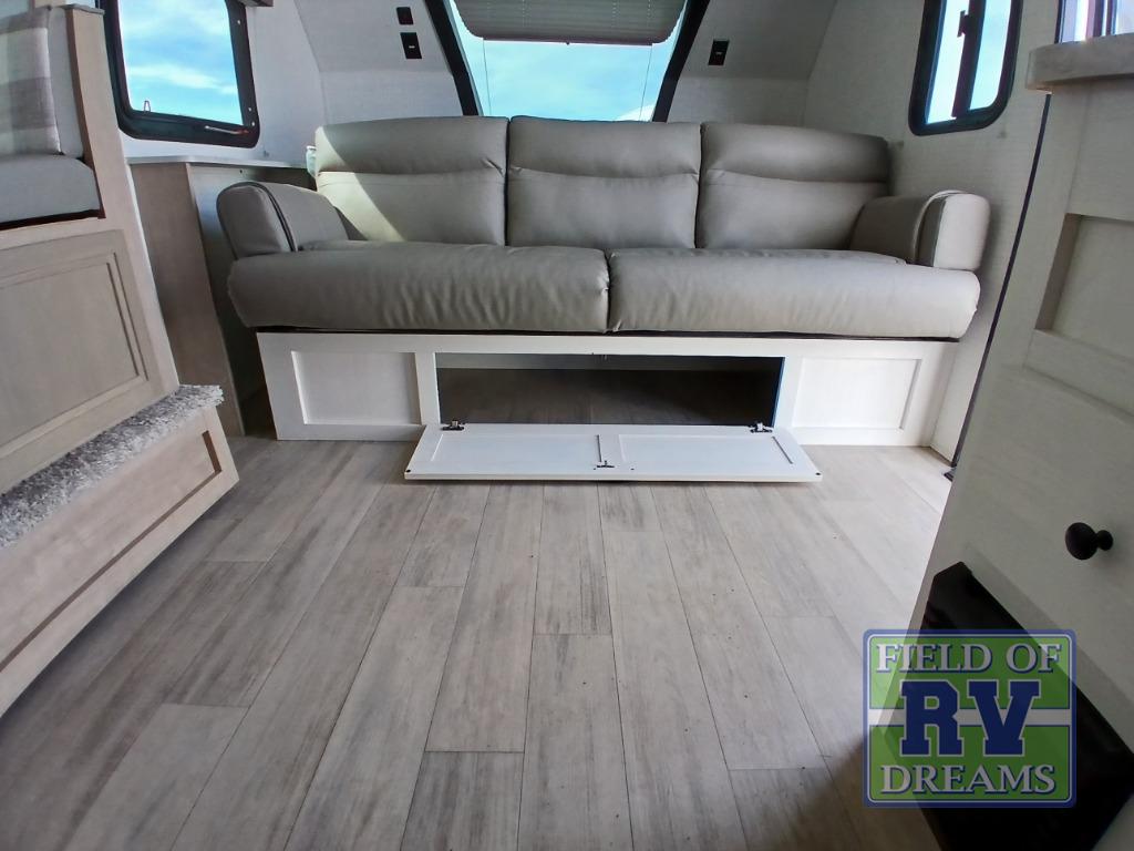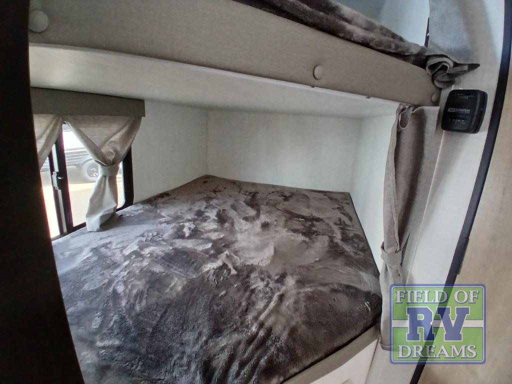 This is the perfect lightweight travel trailer that can sleep seven with the added double-size bunks. While the little ones or your guests sleep here, you will enjoy the front queen-size Murphy bed each night. In the morning, just fold up the bed to relax on the sofa and enjoy more floor space. There is also a booth dinette slide out where you can dine each day, or you can head outdoors to sit under the 17' power awning with an LED light. A two burner cooktop and microwave oven will let you prepare meals each day, and the 10 cu. ft. 12V refrigerator will keep your cold items fresh. There is even an outdoor refrigerator so you can keep cold drinks stocked and an outside storage compartment under the bunks!