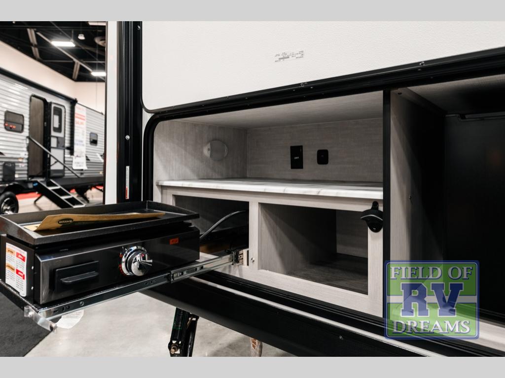 This travel trailer offers versatility with a front Murphy bed! Depending on what time of day you enter the unit will determine whether you see the bed or the sofa. There is a rear corner double bed bunk above a lower flip up double bed and a booth dinette that can transform into an extra sleeping space when you're not using it to enjoy a meal or play a card game. Everyone can stay clean with tub/shower in the rear corner bathroom and keep their bellies full with the two burner cooktop and 8 cu. ft. 12V refrigerator. You can even cook outdoors with the exterior camp kitchen while staying protected by the power awning with LED lighting!