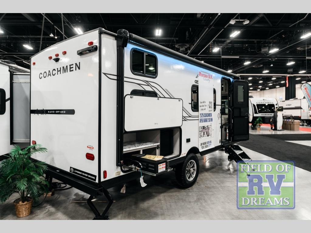 You will find comfort, convenience, and a sturdy construction with each of these Coachmen RV Apex Nano travel trailers! They are held together with an aluma-cage construction, an I-beam chassis, plus vacuum-bonded laminated dual Azdel fiberglass walls for double the protection against the elements. The 200-watt solar panel with a 30 amp control charger is included within the Off-Grid Package, along with two 20 lb. LP tanks, a high velocity power roof vent, plus 12V outlets to keep you powered up. More exterior feature include a hot/cold shower, four stabilizer jacks, a power awning with LED lighting, and magnetic baggage door catches to easily pack and unload your gear. You will love the interior of your Apex Nano with Congoleum residential flooring, one-piece seamless edge countertops, matte black hardware in the galley, and a hand-crafted wood medicine cabinet in the bath.