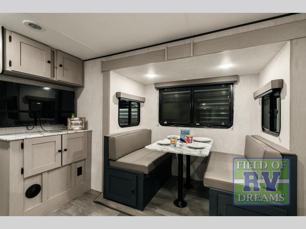 The whole gang will love weekend stays at the campground in this double slide out trailer! The little ones or your guests can take the rear corner bunkhouse that includes flip-up bunks. You'll have the queen bed with super storage up front all to yourselves, and the dual wardrobes plus overhead cabinet will help keep your space tidy. The chef of your group will have a three burner cooktop and an air fryer to cook meals, and there is a booth dinette with a table for dining space. In the evening, you can stay in to watch a movie LED Smart TV, or head outdoors to relax under the power awning.