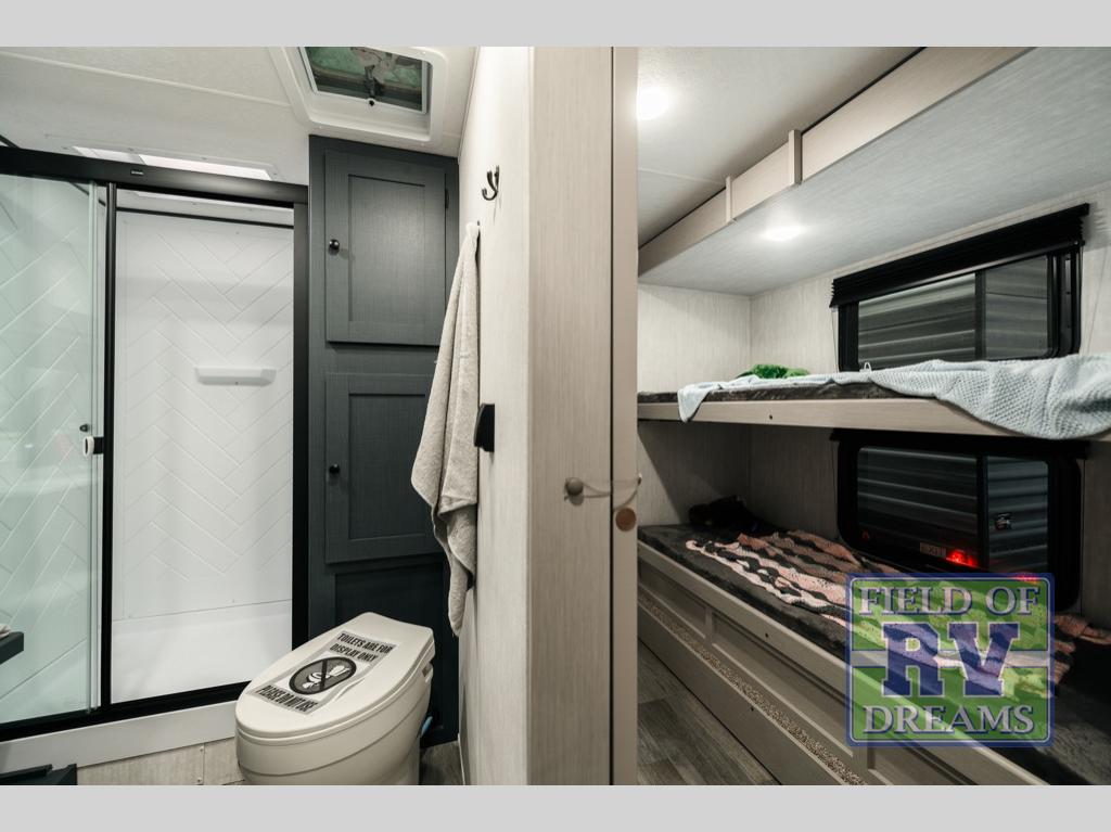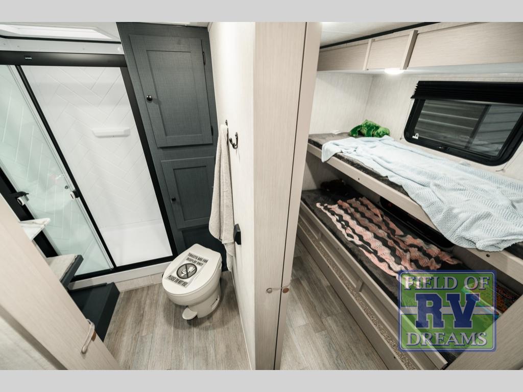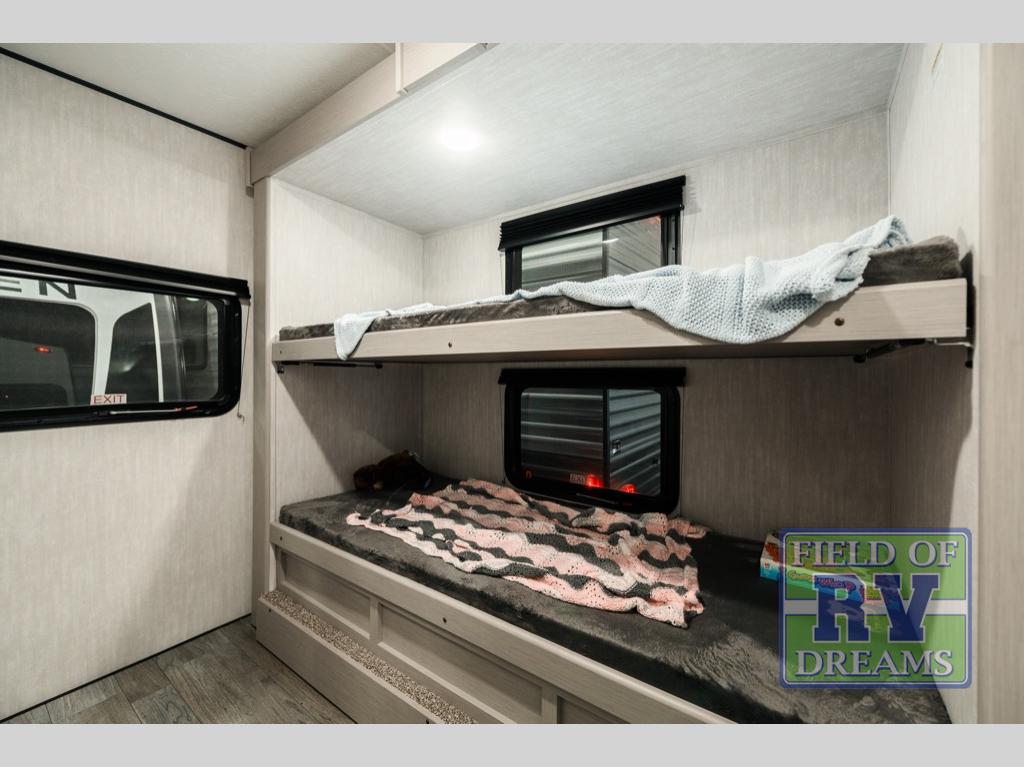 The whole gang will love weekend stays at the campground in this double slide out trailer! The little ones or your guests can take the rear corner bunkhouse that includes flip-up bunks. You'll have the queen bed with super storage up front all to yourselves, and the dual wardrobes plus overhead cabinet will help keep your space tidy. The chef of your group will have a three burner cooktop and an air fryer to cook meals, and there is a booth dinette with a table for dining space. In the evening, you can stay in to watch a movie LED Smart TV, or head outdoors to relax under the power awning.