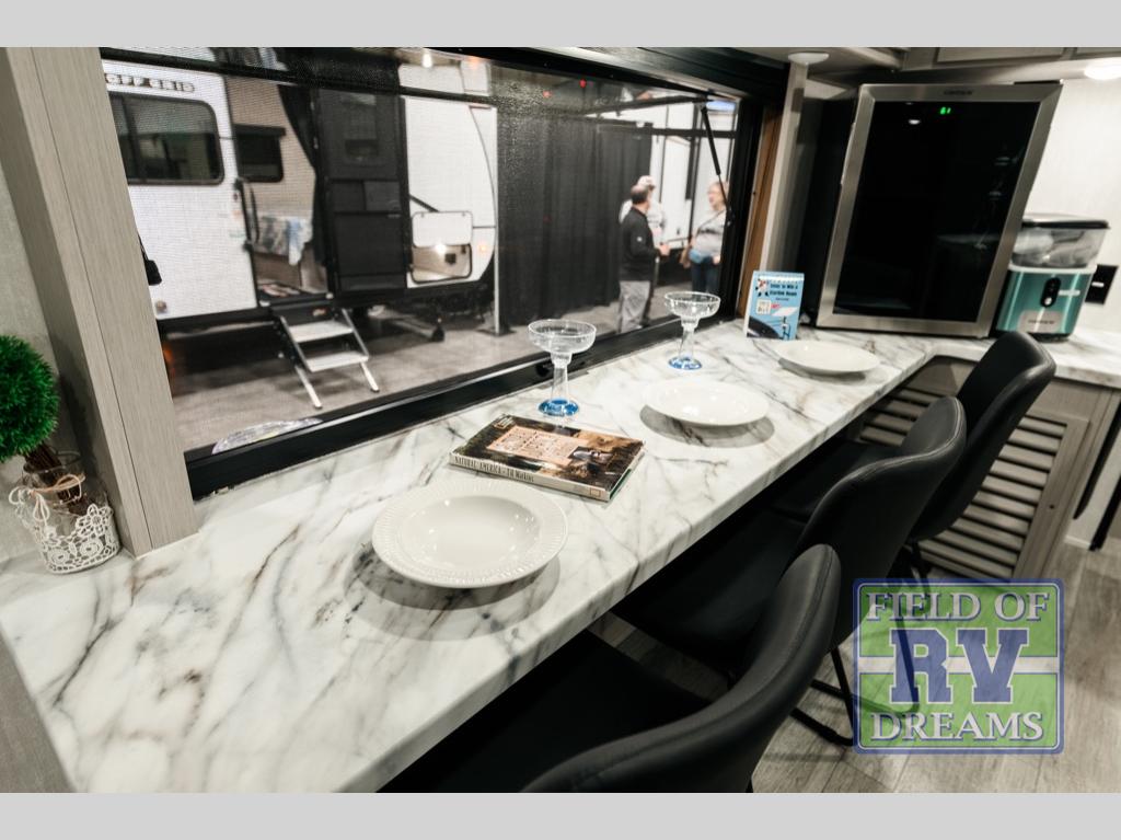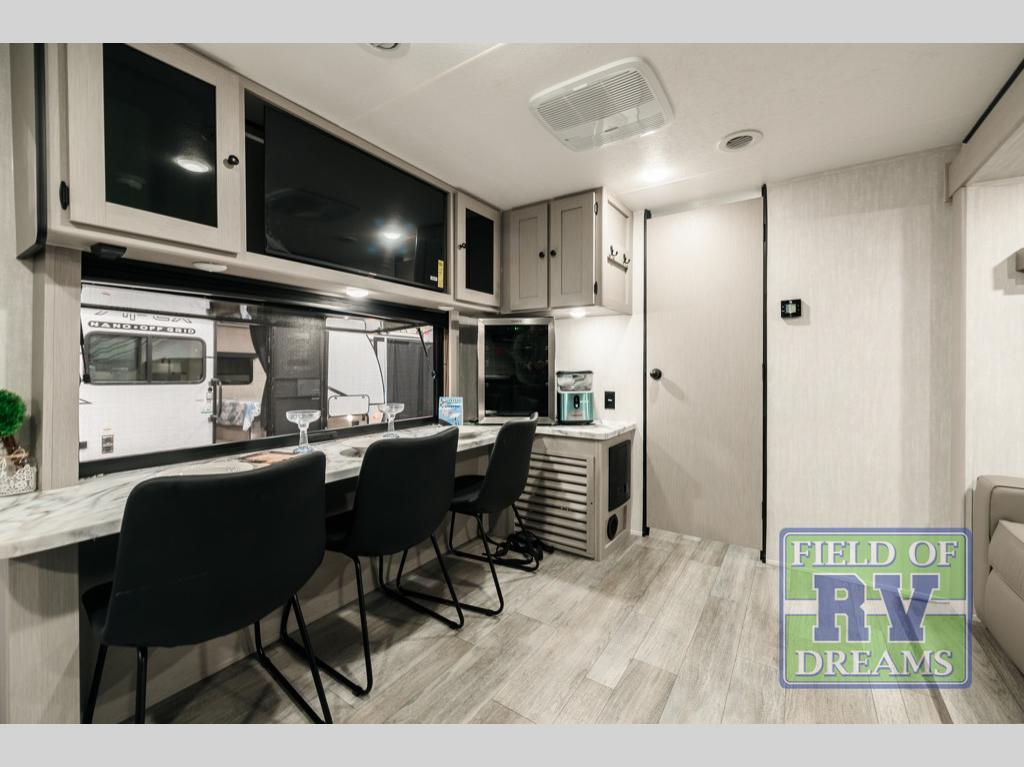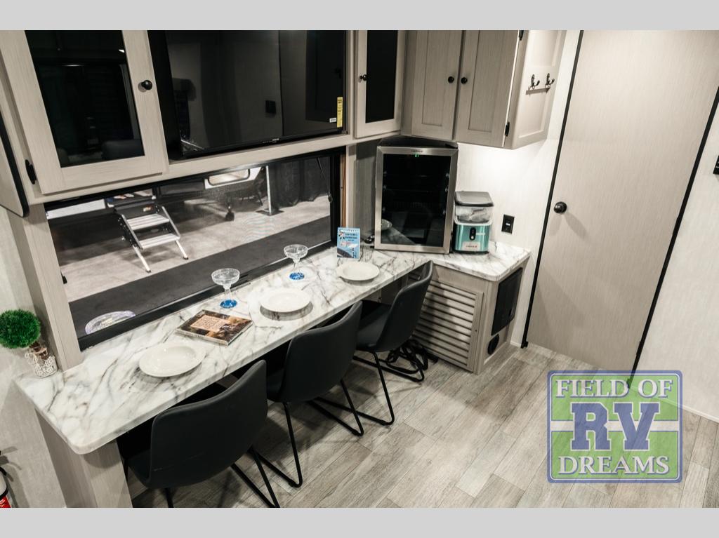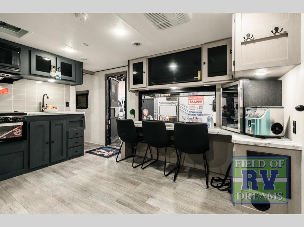You will love this travel trailer front bedroom. Ideal for you and your partner, this bedroom is fitted with a 60x80 queen bed with super storage, dual wardrobes beside the bed and a over head cabinet. On the kitchen area you will find a 12V refrigerator, pantry, three burner cooktop and a bar countertop with stools, for have a nice drink on a hot day, in addition, you or your guests can rest on the 68" trifold sofa. Take a relaxing bath in the full bathroom furnished with 34" shower and overhead cabinets. You will also love the outdoor kitchen, perfect to have a meal while admiring nature.