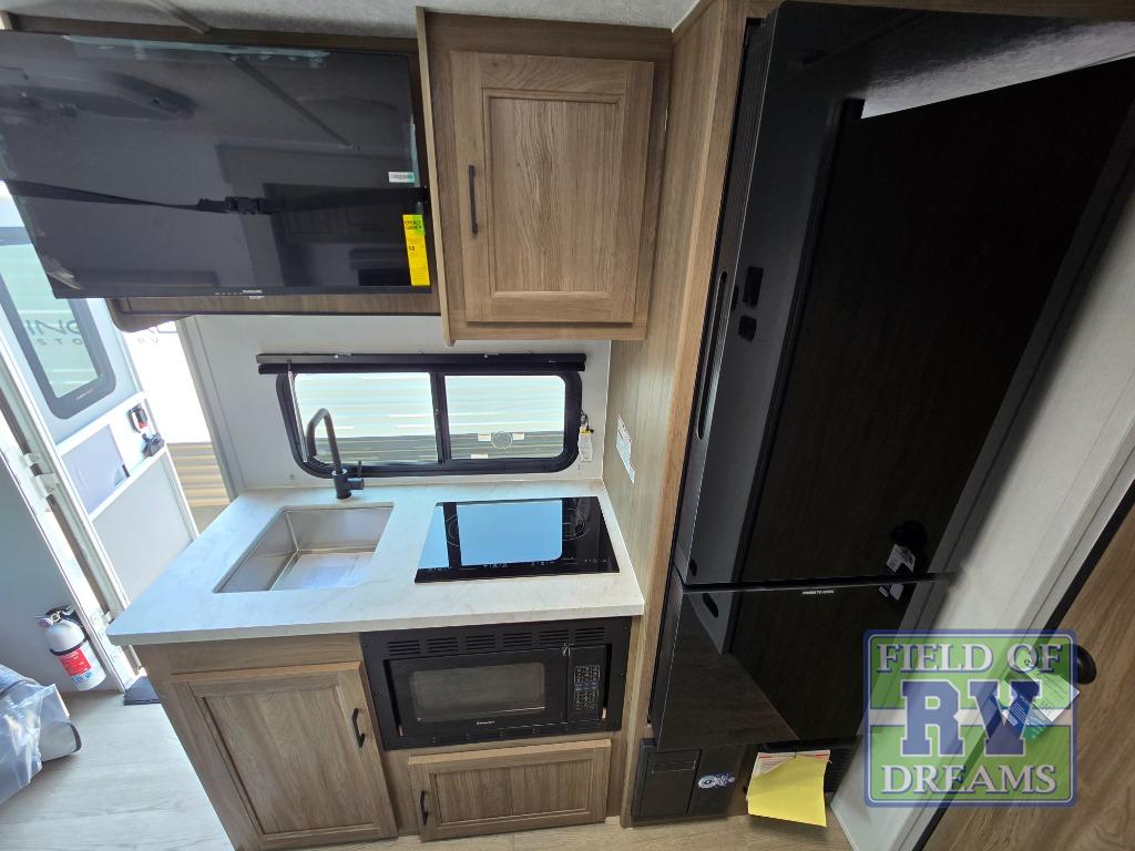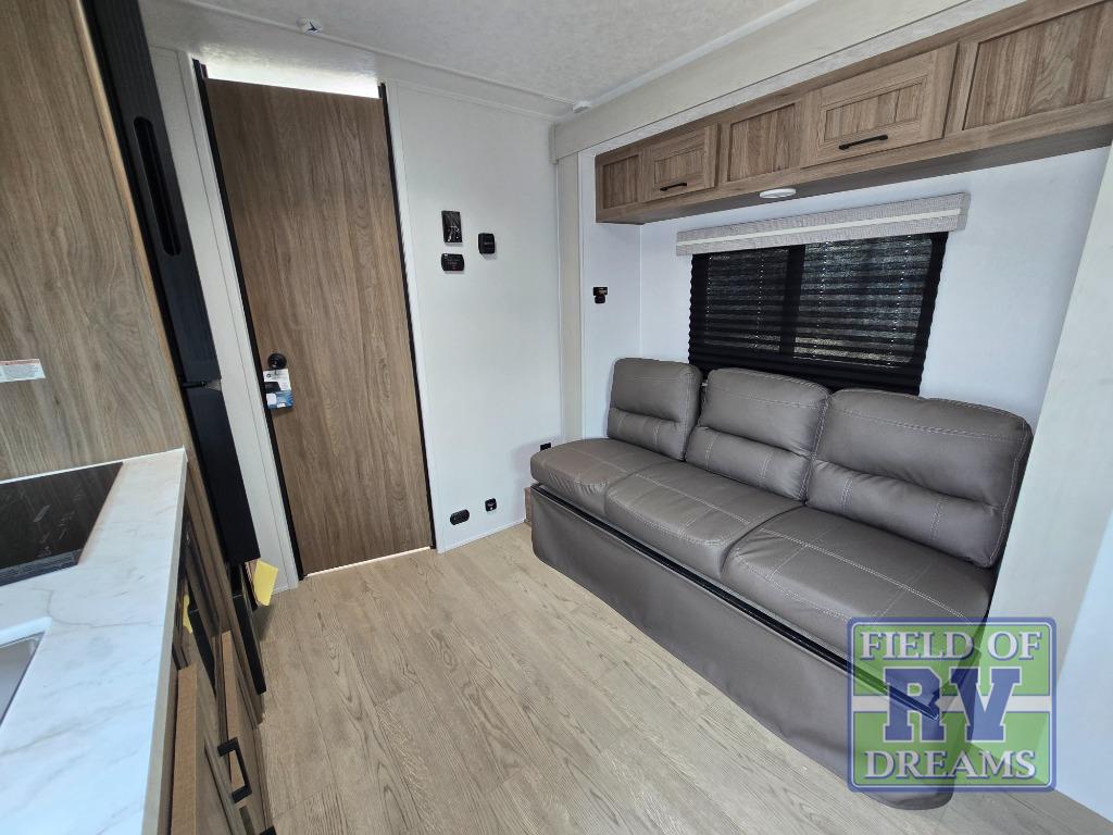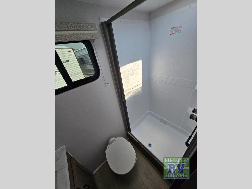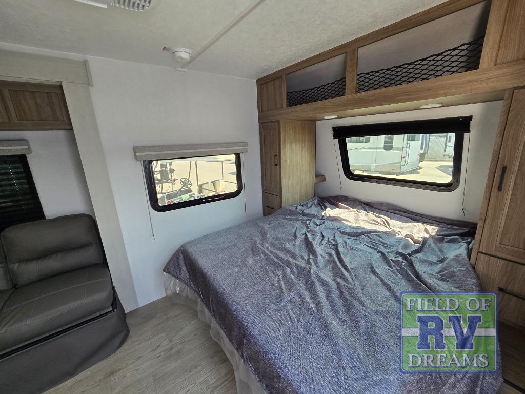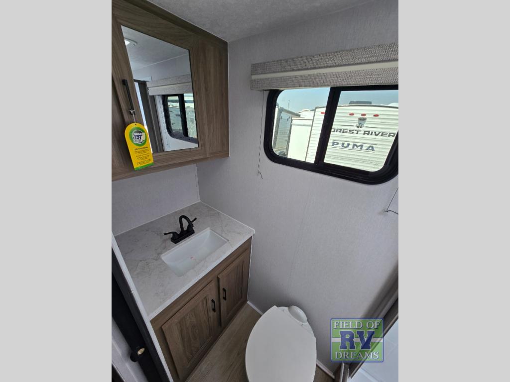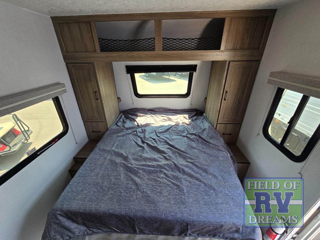 You'll love spending time at the campground in this single slide out travel trailer! The 54" x 80" front bed includes vaulted underbed storage to keep your luggage or extra blankets out of the way, plus there are dual bedside wardrobes for your clothes. A sofa with a free-standing table will provide a place to relax and dine, and the full kitchen includes a dual-burner cooktop and microwave oven to cook meals each day. This unit also features a full rear bath, complete with a 30" x 36" shower, a toilet, and a sink with a medicine cabinet for your necessities.