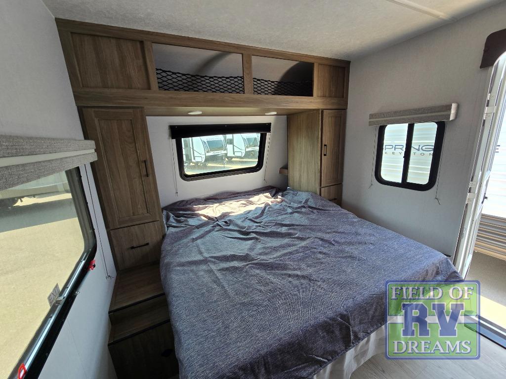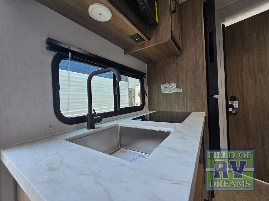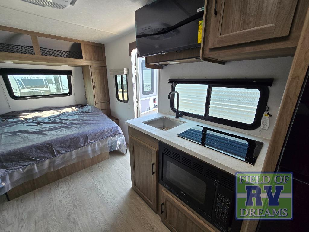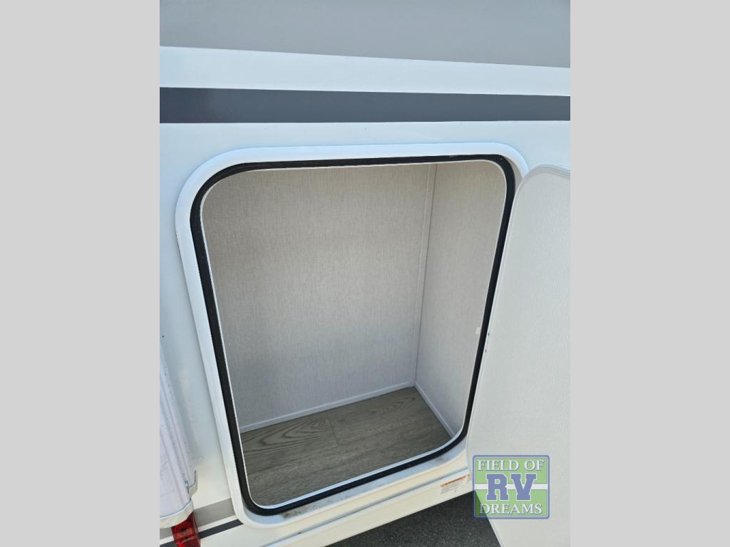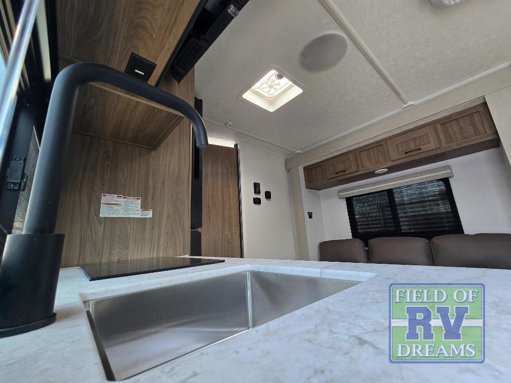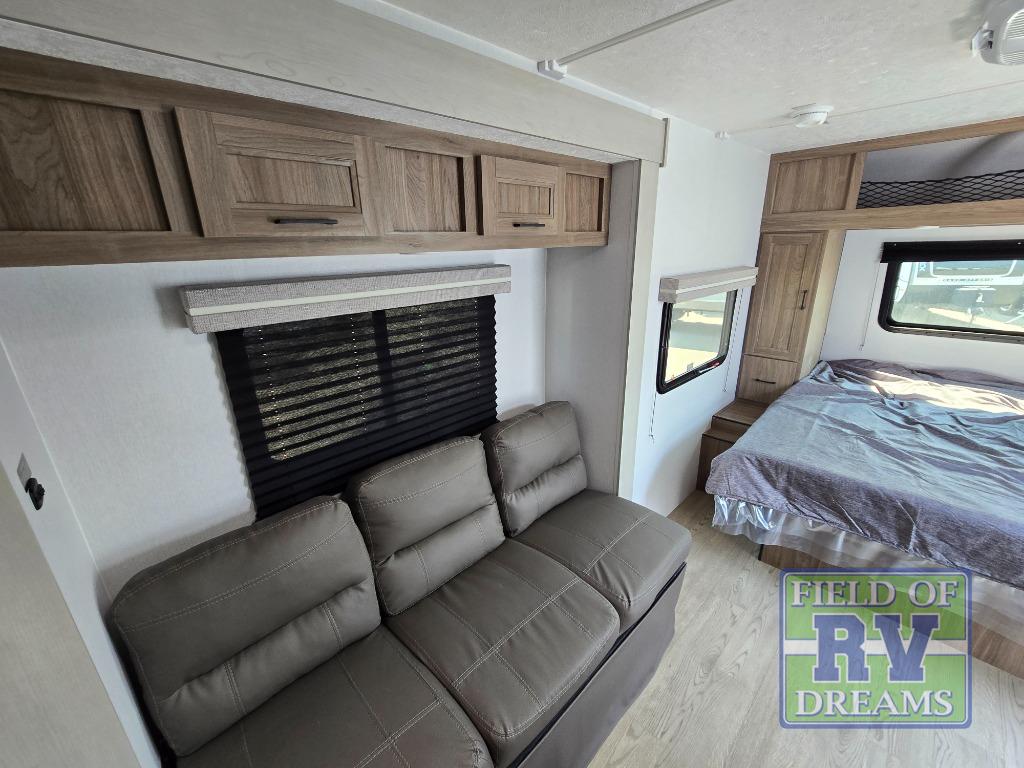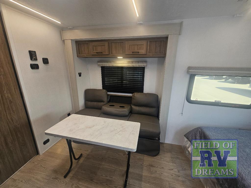 You'll love spending time at the campground in this single slide out travel trailer! The 54" x 80" front bed includes vaulted underbed storage to keep your luggage or extra blankets out of the way, plus there are dual bedside wardrobes for your clothes. A sofa with a free-standing table will provide a place to relax and dine, and the full kitchen includes a dual-burner cooktop and microwave oven to cook meals each day. This unit also features a full rear bath, complete with a 30" x 36" shower, a toilet, and a sink with a medicine cabinet for your necessities.
