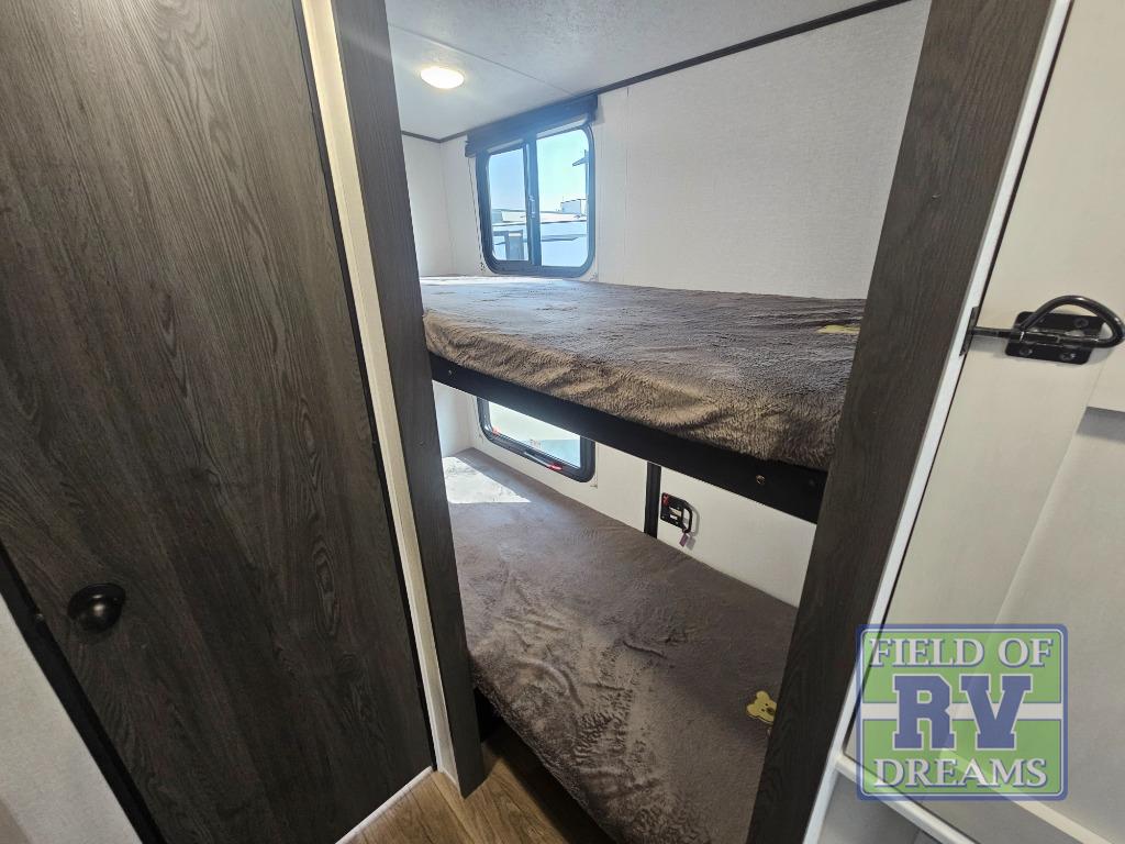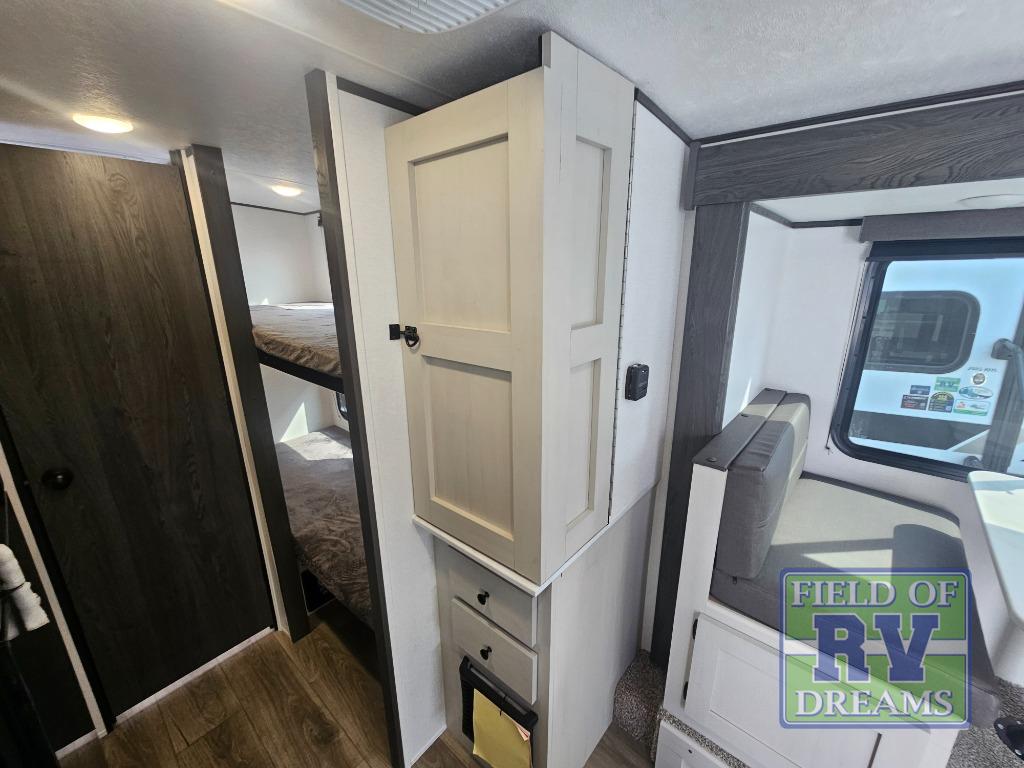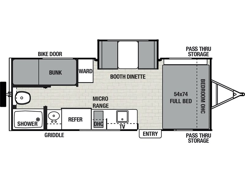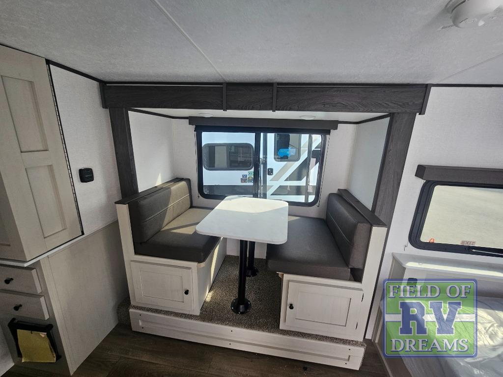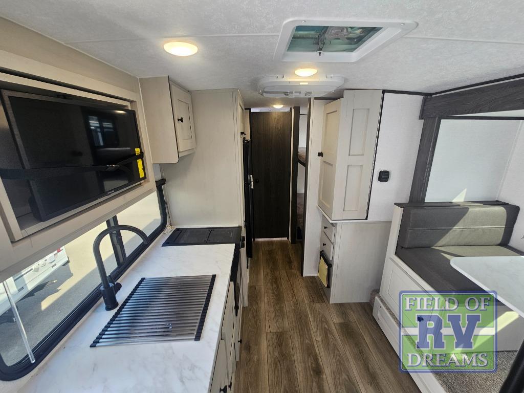 The Family Friendly 19BHB features our Popular Spinning Inside / Outside Refrigerator, Inside / Outside TV, a Coffee Bar Pullout Pantry, Under Bunk Storage with a Cargo Door, and a Slideout with a Booth Dinette.