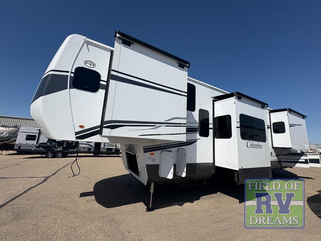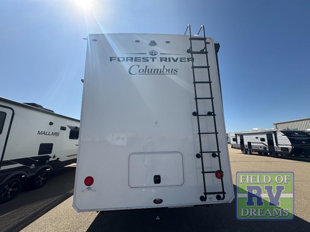 Experience a different camping life with residential furnishings and high end features in each one of these Palomino Columbus fifth wheels! The 101" wide body lets you walk around more throughout and the all-welded aluminum-frame superstructure has a snap-in ceiling molding to hold up through every adventure. Don't leave any of your gear behind either when you can easily store it in the climate controlled drop frame storage area. On the exterior, you'll find a heated utility convenience center, an outside sprayer to keep the dirt outside where it belongs, and magnetic compartment door holds to keep them from falling on you as you grab your items. Plus, there are some modern features that will really seal the deal like the Wi-Fi Booster with 4G LTE capability prep, upgraded true solid-surface countertops, power theater seating with USB charging, and a 260W solar panel for off-grid camping!