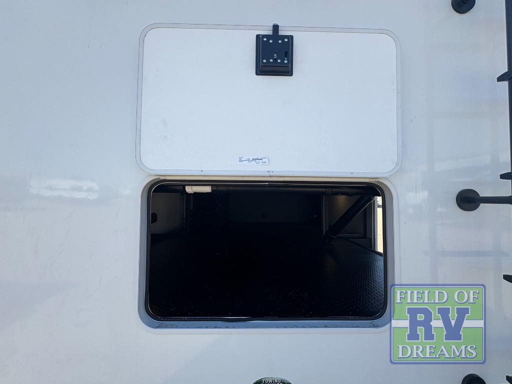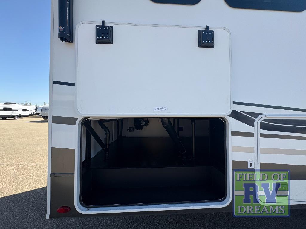 The front kitchen in this fifth wheel is a chef's dream come true while camping! There is generous counter space up front and beside the range, plus a pantry and 12V 18 cu. ft. 3-door refrigerator with ice. There is also a hi-top table with two bar stools that overlooks the living area. Inside the living area there are opposing sofa sleeper slides and power theater seating across from an entertainment center with a 50" Smart TV. A mid-coach half bath is easily accessible, and the full rear bath with dual bath sinks will create a master bedroom you are sure to love. There is a king bed slide out, a wardrobe, hamper, and a TV/storage.