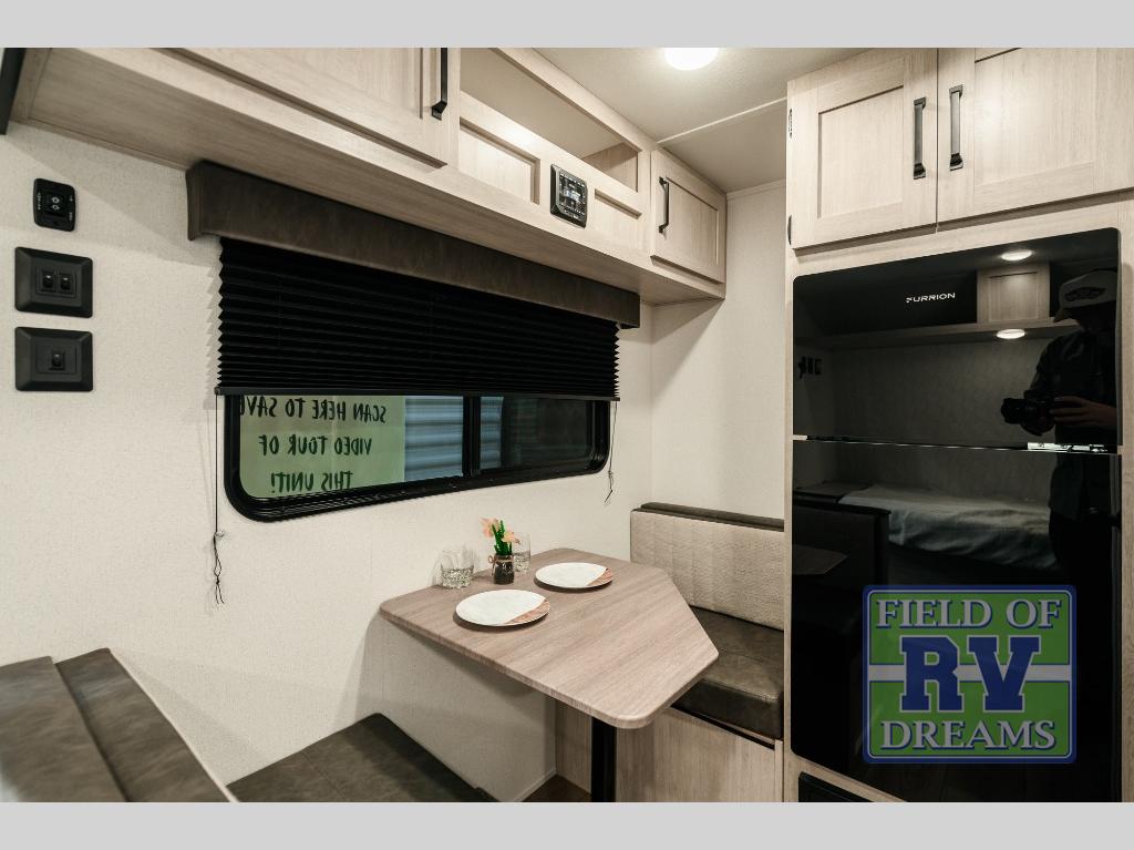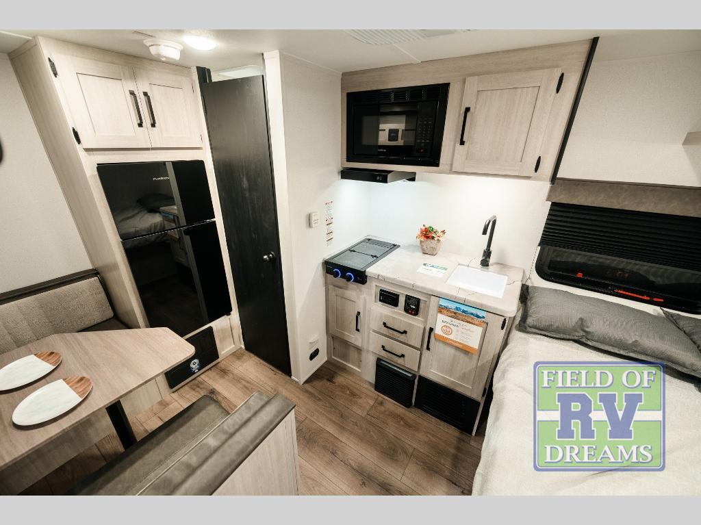 It will be so easy to enjoy camping trips in this single axle travel trailer! There is a front RV queen bed with flip-up storage at the foot of the bed for your belongings, and any additional guests can sleep on the booth dinette with an open shelf above. A full kitchen includes a stainless two burner cooktop and stainless microwave to cook meals each day, and the 4.3 cu. ft. 12V black glass refrigerator will keep your food fresh. And a private bath includes a shower with a seat for added comfort!