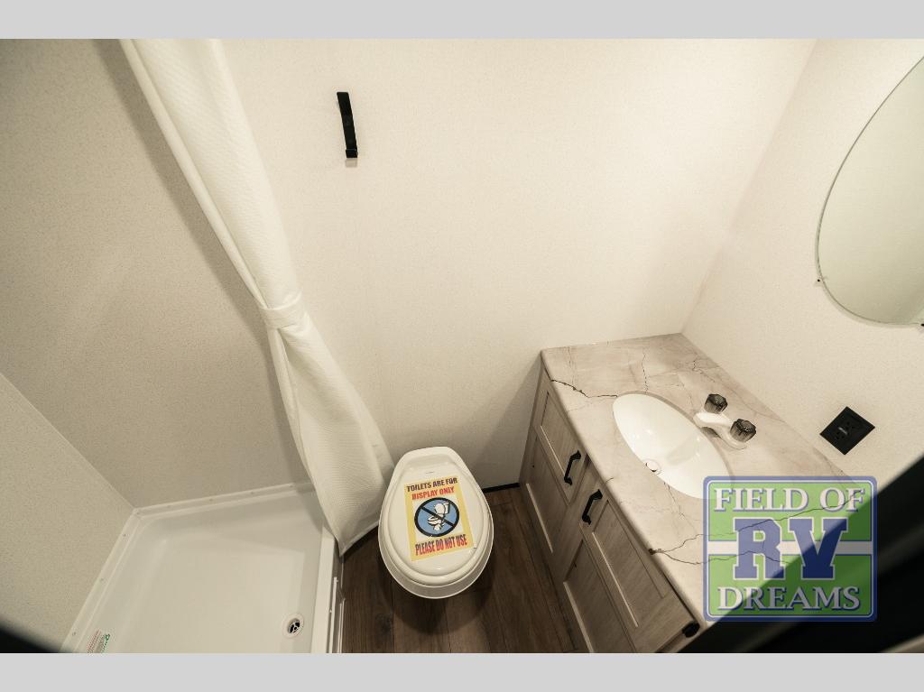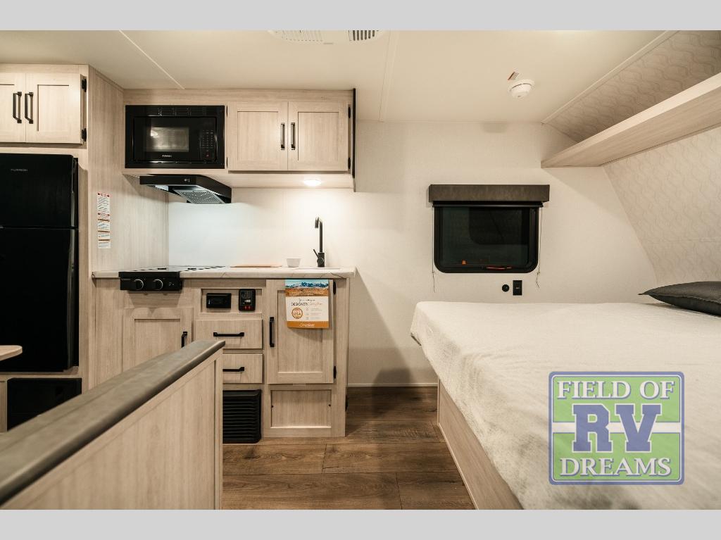 This single axle travel trailer is one you won't want to pass up! There is a front RV queen bed with a bedside shirt closet and overhead shelf for your things, and one more adult or two little ones can sleep on the booth dinette. A full kitchen includes a stainless two burner cooktop and stainless microwave to cook meals each day, and the 4.3 cu. ft. 12V black glass refrigerator will keep your food fresh. This model also includes a full rear bath with a toilet, sinks, and 36" x 30" shower for easy cleaning up!