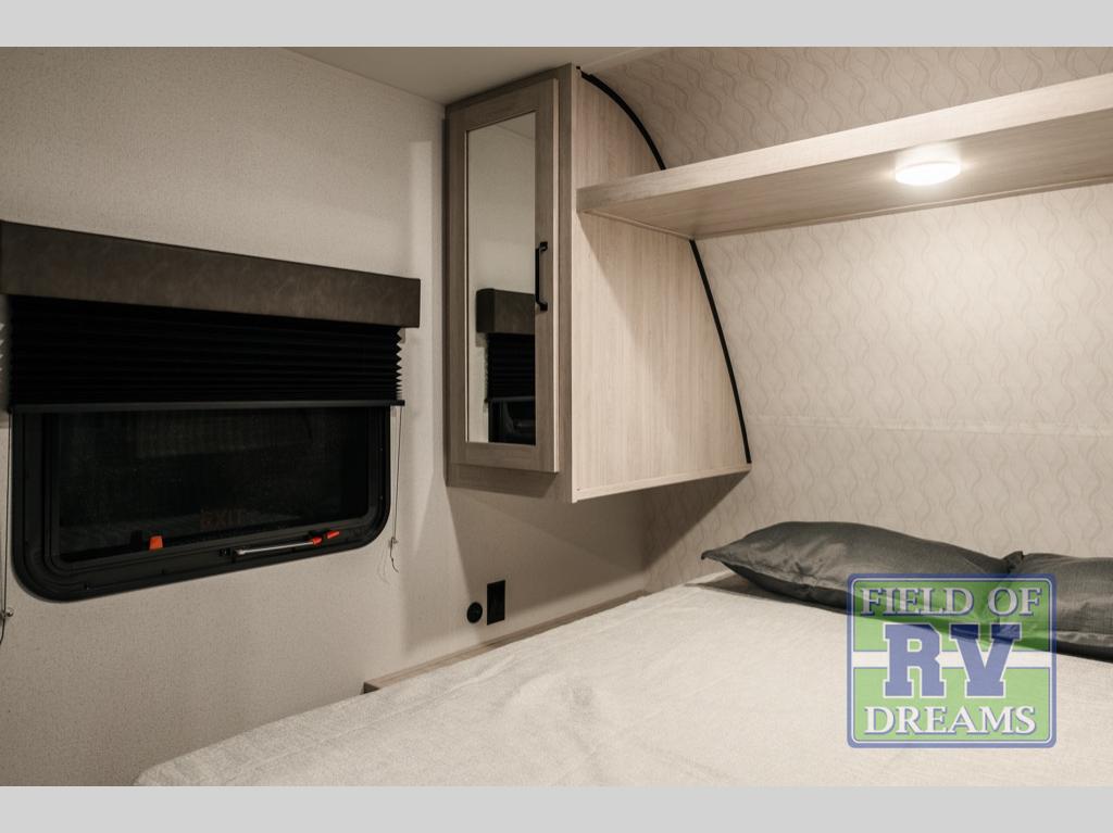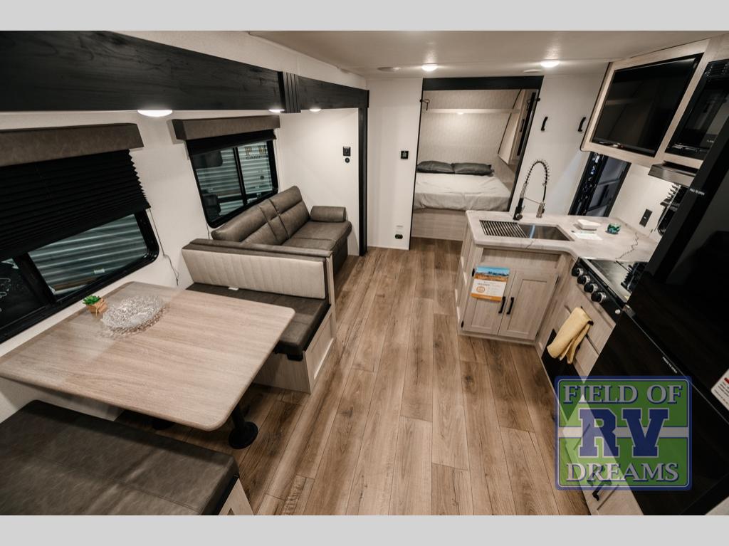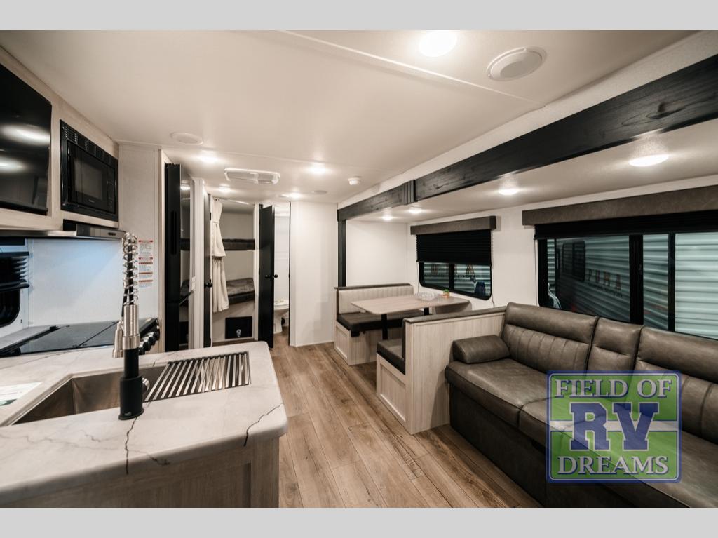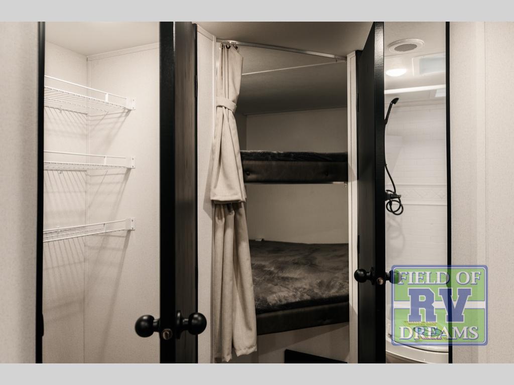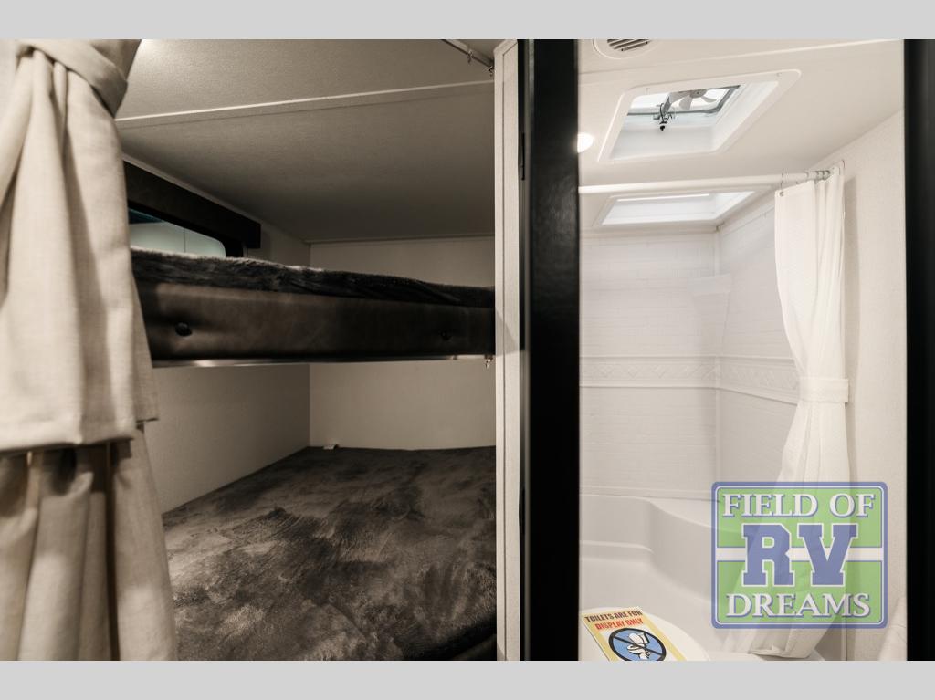 If you're looking for more space, this double axle unit features a large slide so you can walk about freely. Here, you'll find the booth dinette and sofa, which sit across from the optional TV if you want to enjoy movie nights. The full kitchen includes a stainless microwave and three burner cooktop to make meals, plus a pantry and 12V refrigerator for food storage. And an optional outside kitchen with a griddle can be added if you enjoy cooking outdoors! The kids or your guests will love the double-size bunks, and the full bath right beside the bunks includes a shower a seat for added comfort.