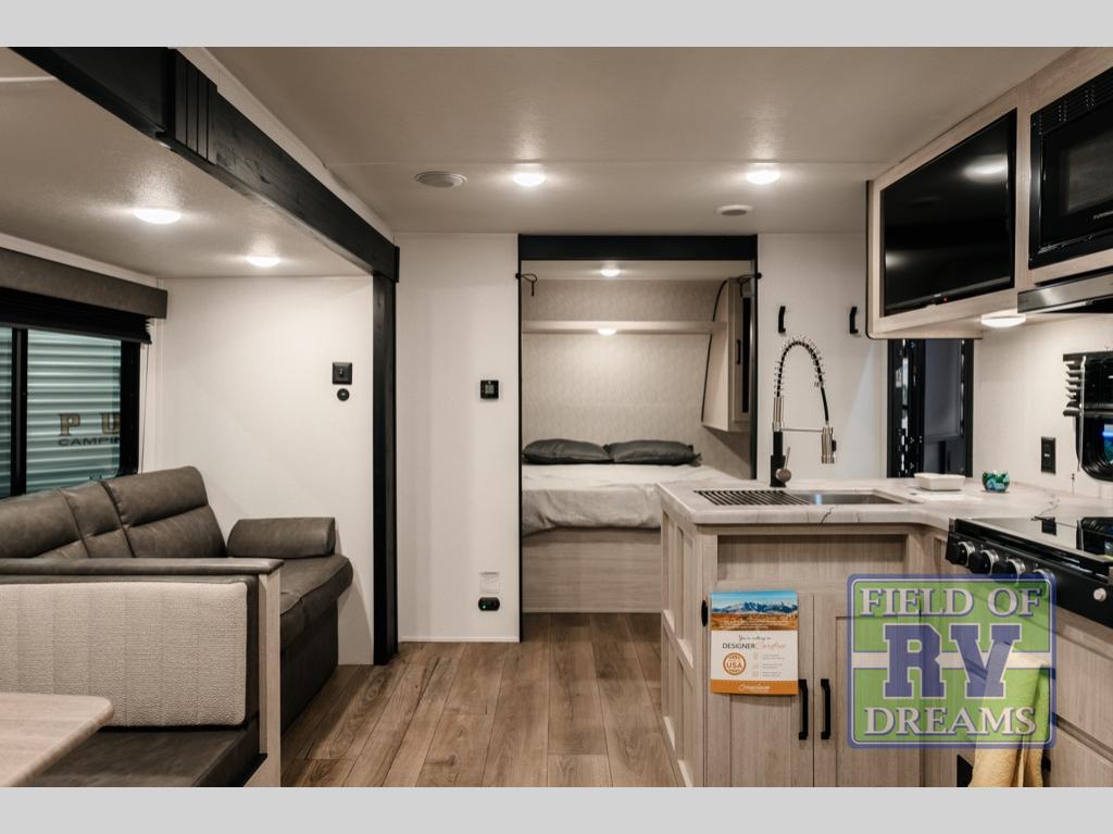 The Puma Camping Edition by Palomino offer an affordable travel trailer for rookie campers or seasoned RVers! They are built with 5/8" tongue and groove plywood flooring and a front diamond plate for added protection. There are also exterior clamp style door latches, back up camera prep, and 20 lb. LP bottles. Head inside to find Thermofoil countertops with a smooth drop edge, bedroom USB ports and outlets, and a GE appliance and kitchen package.