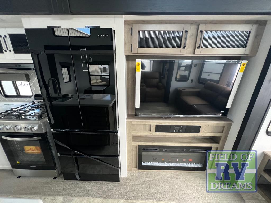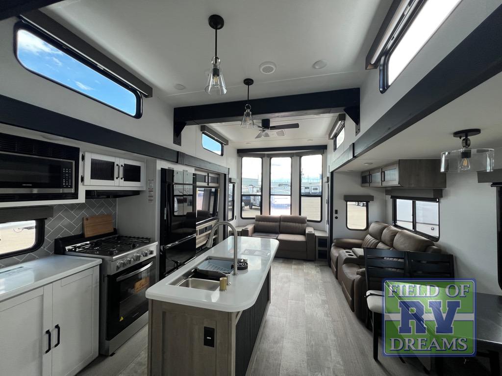 Wherever your destination may be, you can be sure to enjoy it to the fullest with this trailer in tow! With two entry doors, you can enter in through the rear private bedroom or the main living area. The bedroom includes a king bed slide out, a wardrobe/closet to keep your clothes organized, plus a closet with the option to add washer and dryer prep. Just outside this room are steps that lead to the large loft area with a 58" x 58" bunk mat and a cabinet on one side, plus two 32" x 69" bunk mats on the other. There is also a cabinet and a wardrobe/closet for plenty of storage space. Once you've headed back downstairs, you can relax on the dual recliners, front sofa, or free-standing table with a bench and two seats. And the chef of your group will love the kitchen with its residential style refrigerator and pantry, kitchen island, and four burner cooktop!