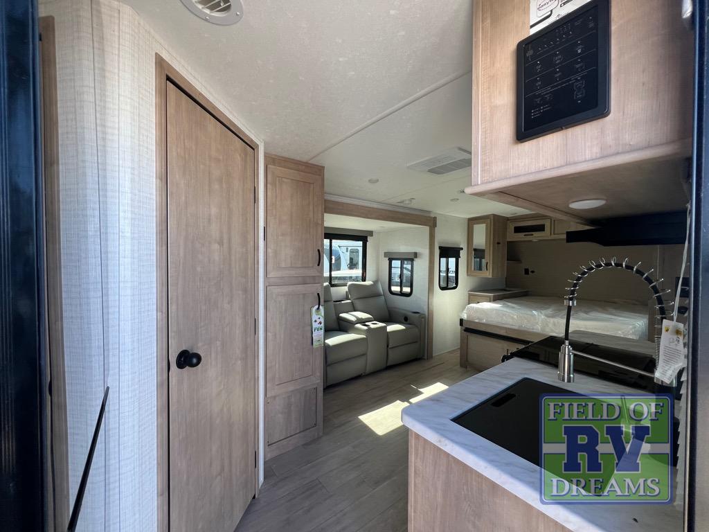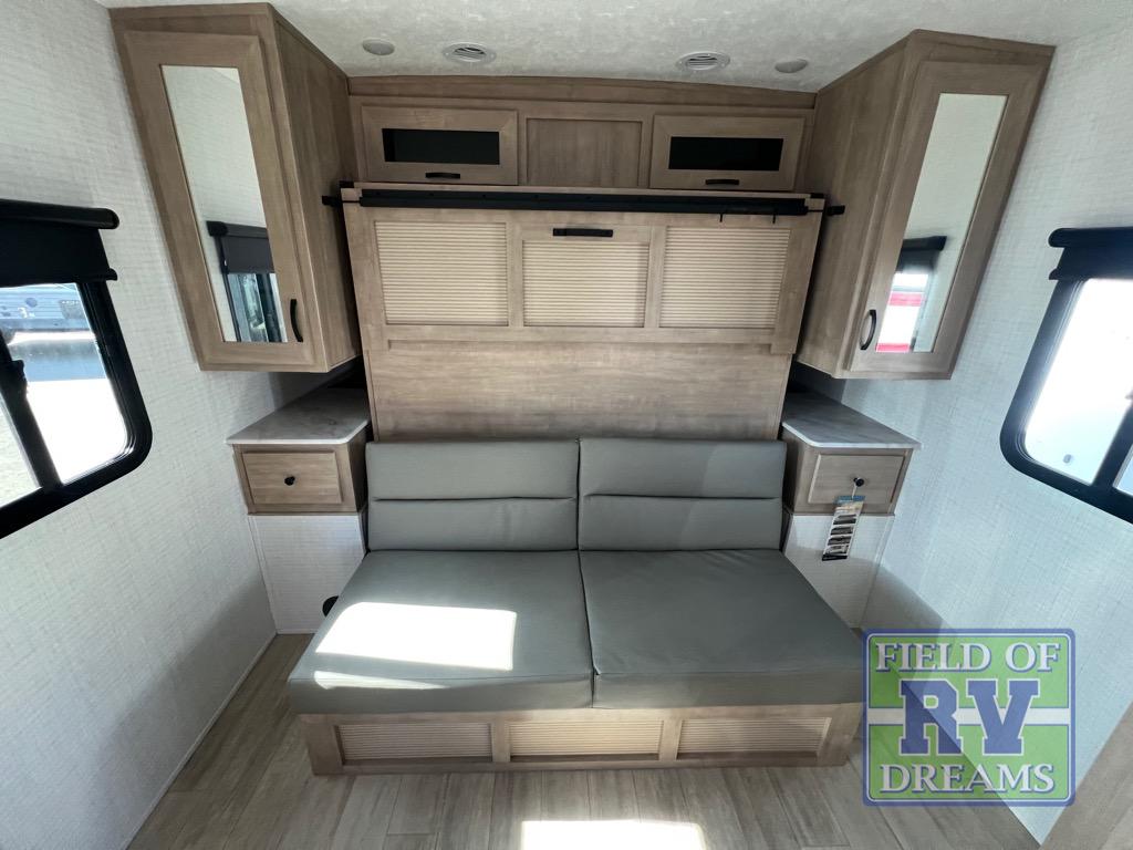 This trailer allows you to camp in comfort at your favorite RV sites thanks to the slide out sofa, and the front queen Murphy bed to sleep on with dual wardrobes to store your clothing! When the bed is put away, you can relax on the jack-knife sofa with storage below for extra blankets or board games. The galley kitchen includes amenities such as a microwave and cooktop to cook meals, plus an 11 cu. ft. electric refrigerator and pantry for food storage. The rear corner full bath offers a space-savings radius shower and linen storage, and there is an entry closet to keep the main area tidy.