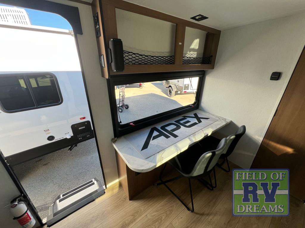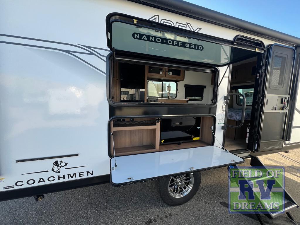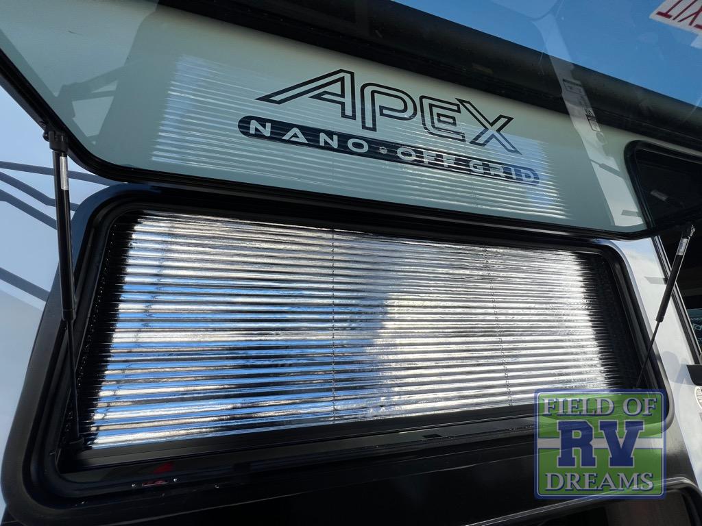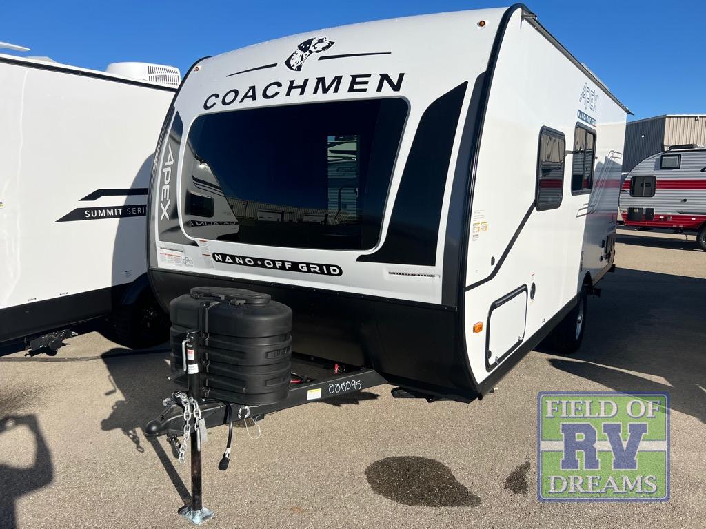 You will find comfort, convenience, and a sturdy construction with each of these Coachmen RV Apex Nano travel trailers! They are held together with an aluma-cage construction, an I-beam chassis, plus vacuum-bonded laminated dual Azdel fiberglass walls for double the protection against the elements. The 400-watt solar panel with a 30 amp control charger is included, along with two 20 lb. LP tanks, a high velocity power roof vent, plus 12V outlets to keep you powered up. More exterior features include a hot/cold shower, four stabilizer jacks, a power awning with LED lighting, and radius thumb latch baggage doors to easily pack and unload your gear. You will love the interior of your Apex Nano with Congoleum residential flooring, one-piece seamless edge countertops, matte black hardware in the galley, and a hand-crafted wood medicine cabinet in the bath.