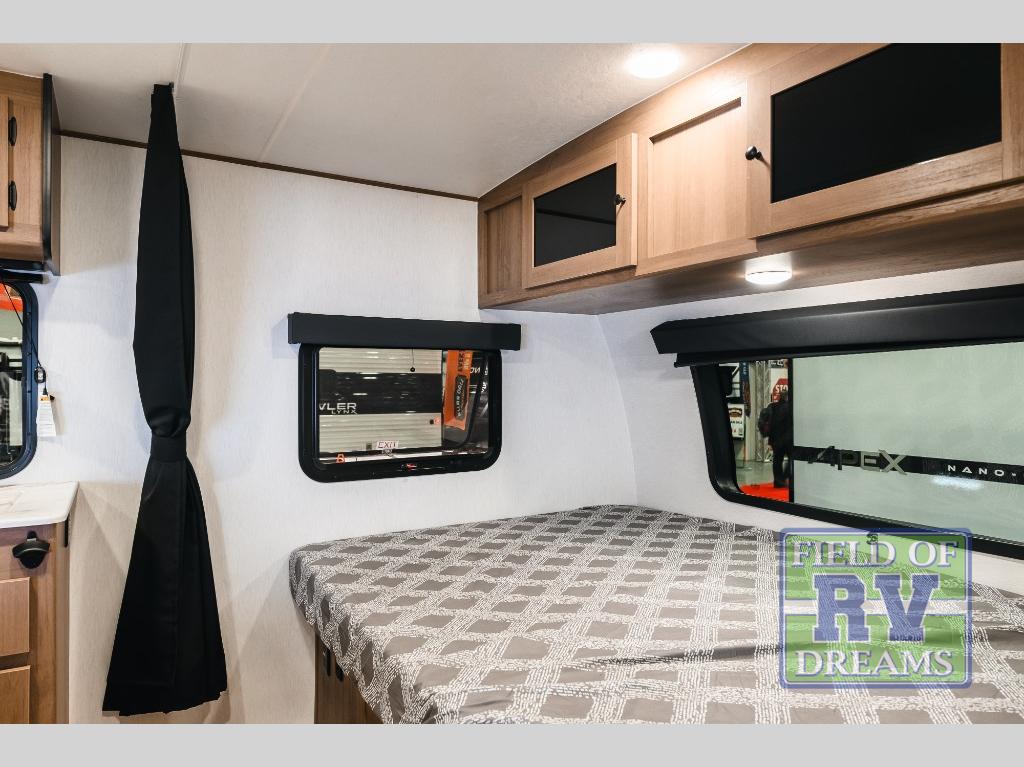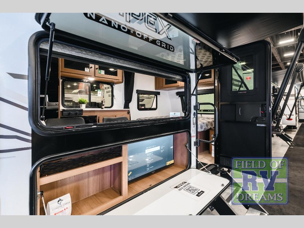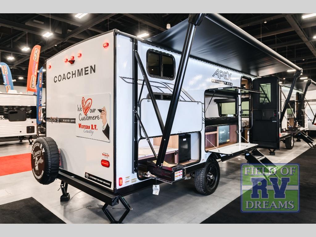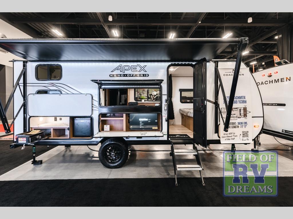 You will find comfort, convenience, and a sturdy construction with each of these Coachmen RV Apex Nano travel trailers! They are held together with an aluma-cage construction, an I-beam chassis, plus vacuum-bonded laminated dual Azdel fiberglass walls for double the protection against the elements. The 400-watt solar panel with a 30-amp control charger is included, along with two 20 lb. LP tanks, a high velocity power roof vent, plus 12V outlets to keep you powered up. More exterior features include a hot/cold shower, four stabilizer jacks, a power awning with LED lighting, and radius thumb latch baggage doors to easily pack and unload your gear. You will love the interior of your Apex Nano with Congoleum residential flooring, one-piece seamless edge countertops, matte black hardware in the galley, and a hand-crafted wood medicine cabinet in the bath.