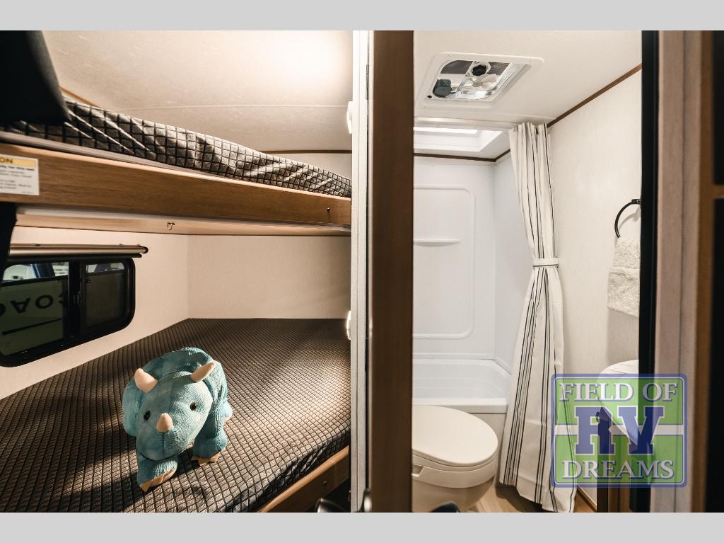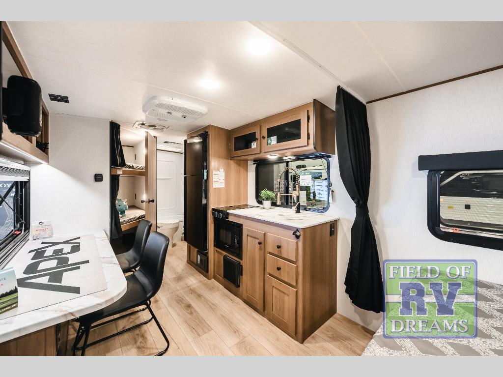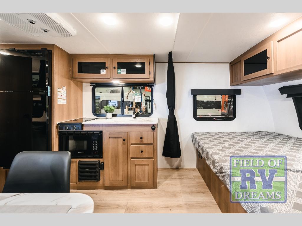 As you step into this versatile travel trailer, you'll be greeted by a front Murphy bed that offers the best of both worlds, a comfortable place to sleep at night and a cozy sofa for daytime lounging. Convenient storage is provided with a wardrobe at the foot of the bed and a nightstand on the other side for your essentials. In the center, the kitchen is fully equipped with a 10-cu. ft. refrigerator, a 2-burner cooktop, and an air fryer microwave, giving you all the tools you need to prepare your favorite meals. Across from the kitchen, a counter with chairs offers a welcoming space to dine, work, or gather. Toward the rear, double bed bunks provide additional sleeping space, with the lower bunk flipping up to reveal extra storage for your gear. Rounding out the layout is a full bathroom in the rear corner, featuring a tub/shower combo so you can enjoy the comfort and convenience of bathing right inside your trailer.
