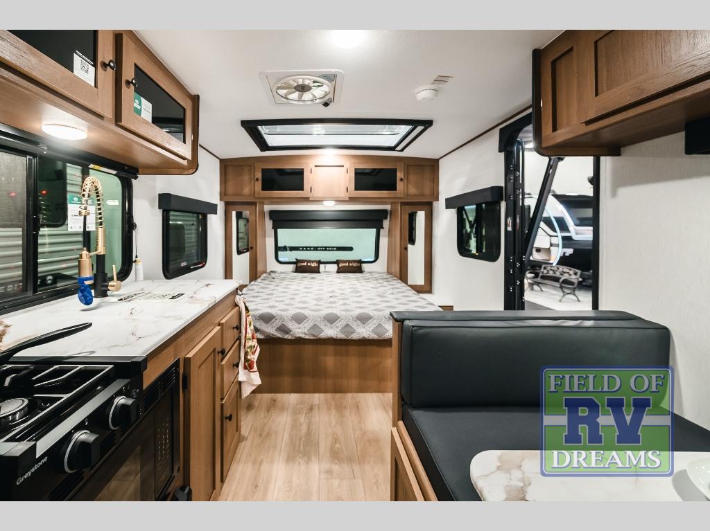 Easily head out to the campgrounds with this easy to tow trailer that offers indoor amenities to keep you fed, cleaned and relaxed! The galley kitchen provides a microwave, two burner cooktop and a pantry, plus a 10-cu. ft. 12V refrigerator all at your fingertips, and the rear full bathroom gives you a shower, wardrobe and more! You can eat your meals inside at the booth dinette which also provides sleeping space for one, and the walk-around queen-size bed up front with two wardrobes will allow you to sleep well while away from home.