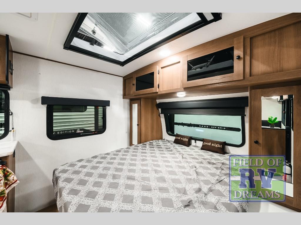 You will find comfort, convenience, and a sturdy construction with each of these Coachmen RV Apex Nano travel trailers! They are held together with an aluma-cage construction, an I-beam chassis, plus vacuum-bonded laminated dual Azdel fiberglass walls for double the protection against the elements. The 400-watt solar panel with a 30-amp control charger is included, along with two 20 lb. LP tanks, a high velocity power roof vent, plus 12V outlets to keep you powered up. More exterior features include a hot/cold shower, four stabilizer jacks, a power awning with LED lighting, and radius thumb latch baggage doors to easily pack and unload your gear. You will love the interior of your Apex Nano with Congoleum residential flooring, one-piece seamless edge countertops, matte black hardware in the galley, and a hand-crafted wood medicine cabinet in the bath.