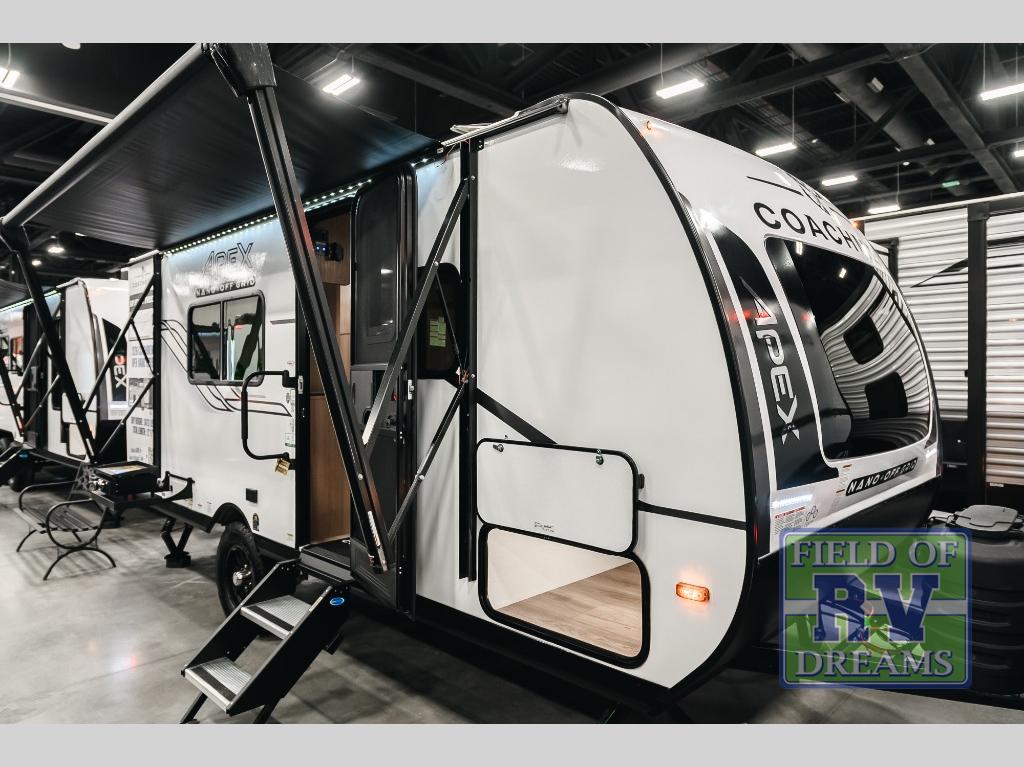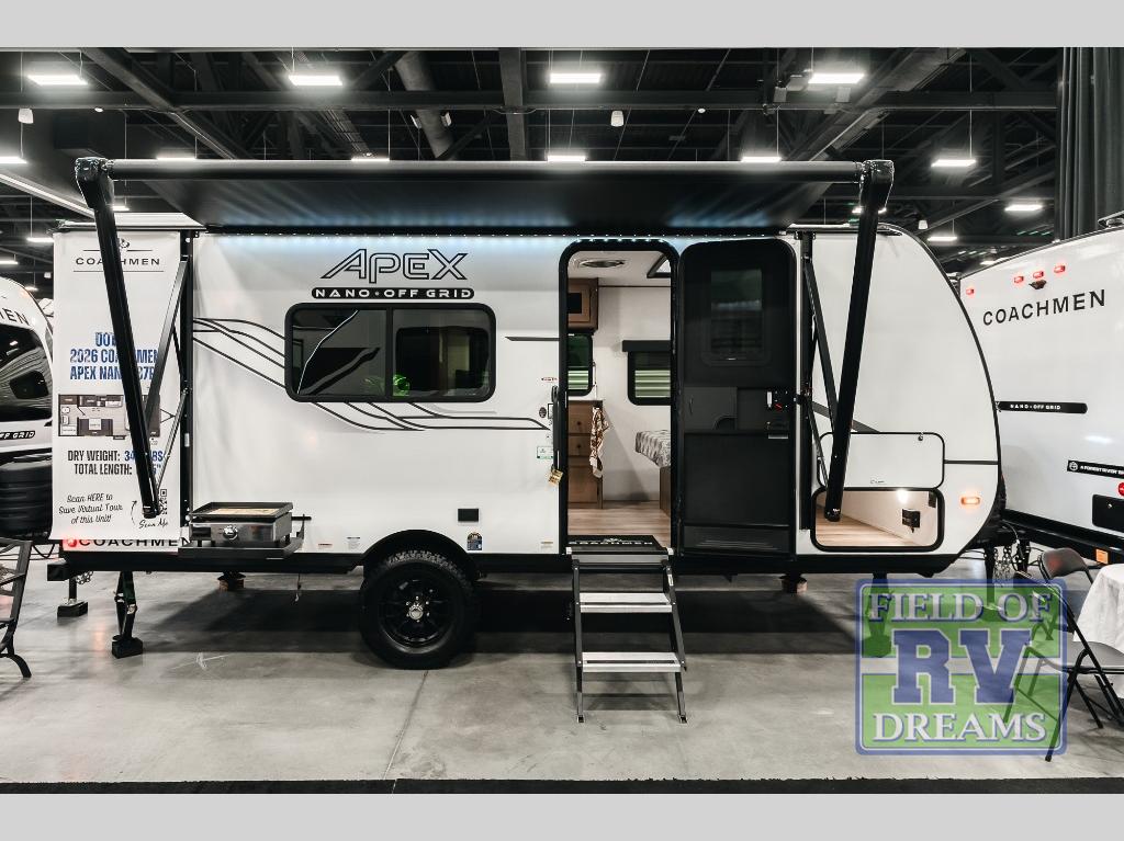 You will find comfort, convenience, and a sturdy construction with each of these Coachmen RV Apex Nano travel trailers! They are held together with an aluma-cage construction, an I-beam chassis, plus vacuum-bonded laminated dual Azdel fiberglass walls for double the protection against the elements. The 400-watt solar panel with a 30-amp control charger is included, along with two 20 lb. LP tanks, a high velocity power roof vent, plus 12V outlets to keep you powered up. More exterior features include a hot/cold shower, four stabilizer jacks, a power awning with LED lighting, and radius thumb latch baggage doors to easily pack and unload your gear. You will love the interior of your Apex Nano with Congoleum residential flooring, one-piece seamless edge countertops, matte black hardware in the galley, and a hand-crafted wood medicine cabinet in the bath.