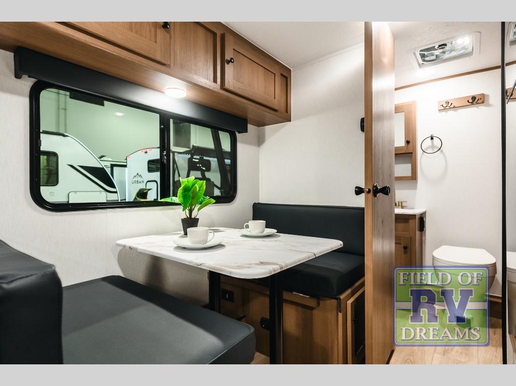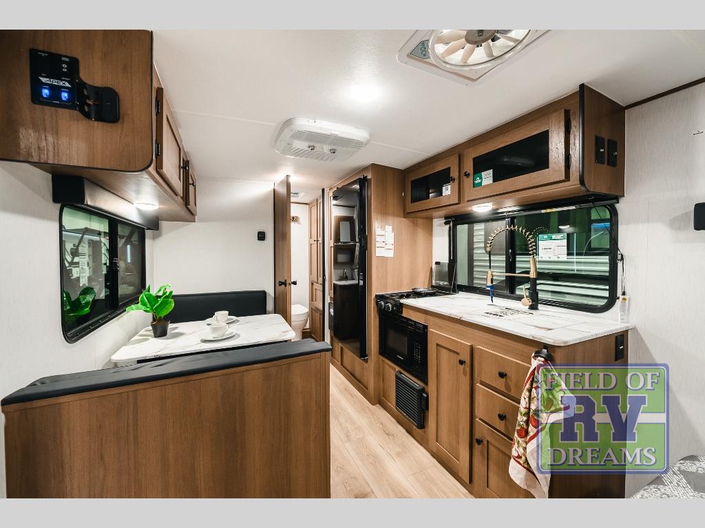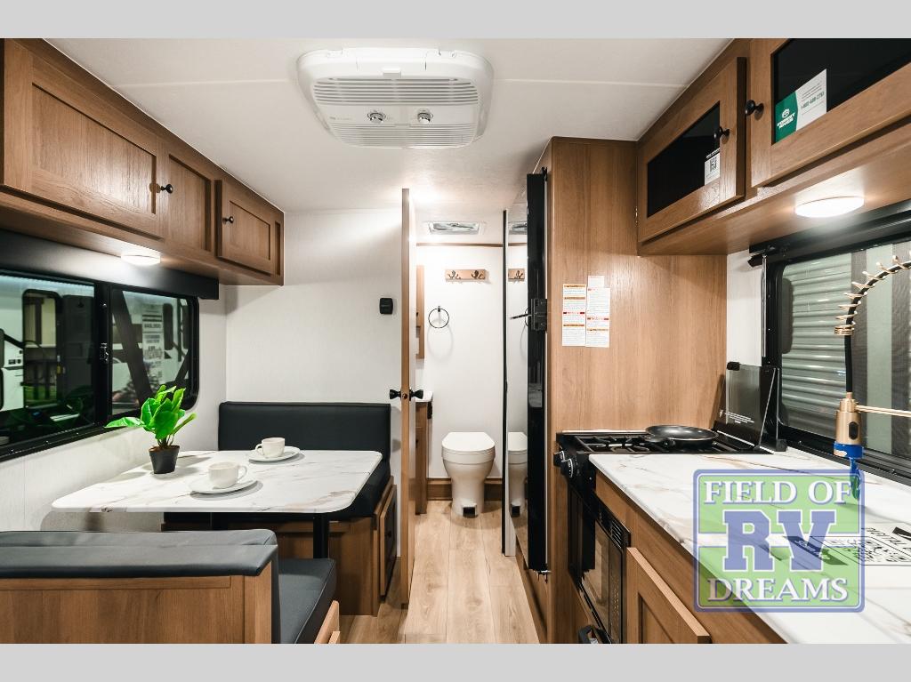 Easily head out to the campgrounds with this easy to tow trailer that offers indoor amenities to keep you fed, cleaned and relaxed! The galley kitchen provides a microwave, two burner cooktop and a pantry, plus a 10-cu. ft. 12V refrigerator all at your fingertips, and the rear full bathroom gives you a shower, wardrobe and more! You can eat your meals inside at the booth dinette which also provides sleeping space for one, and the walk-around queen-size bed up front with two wardrobes will allow you to sleep well while away from home.