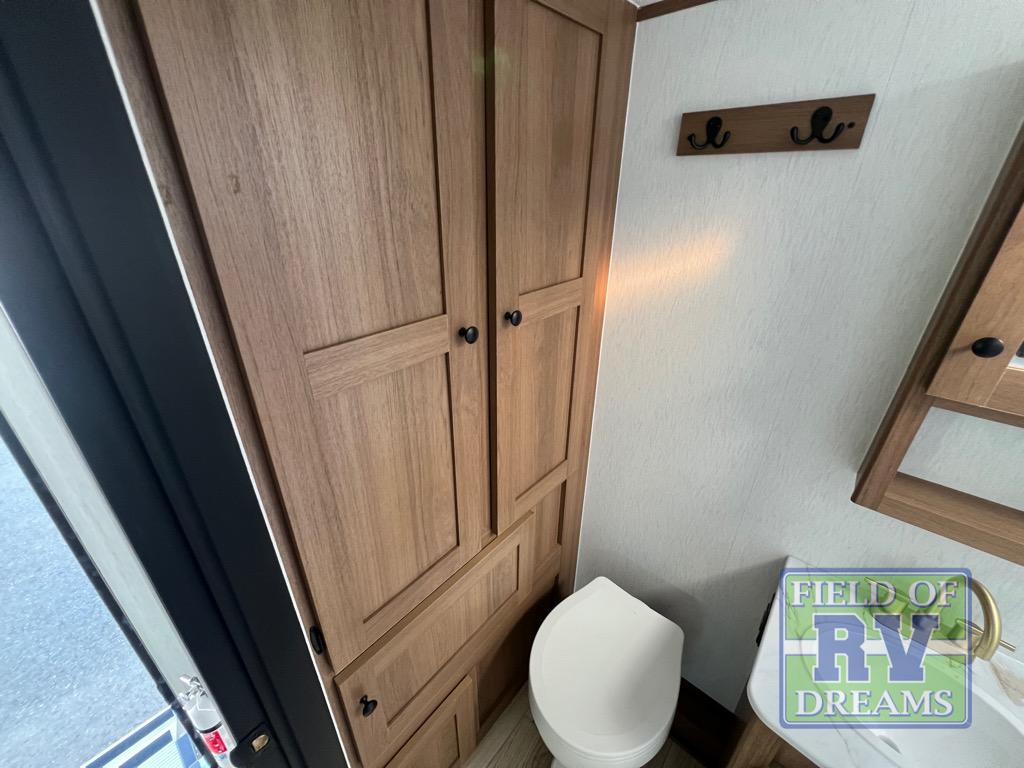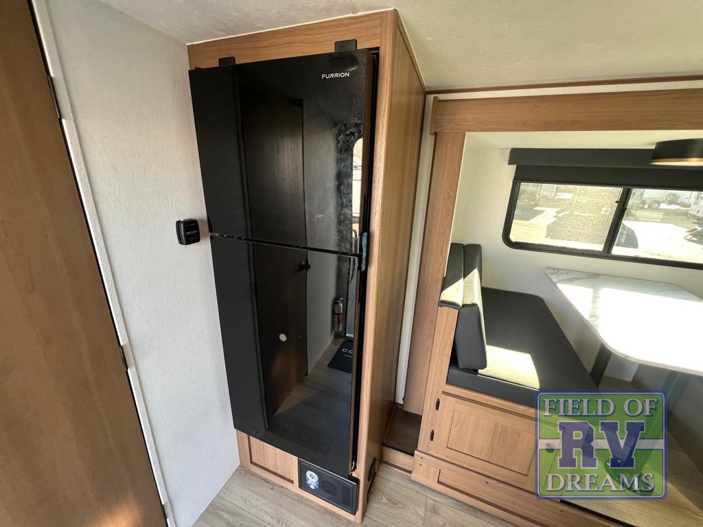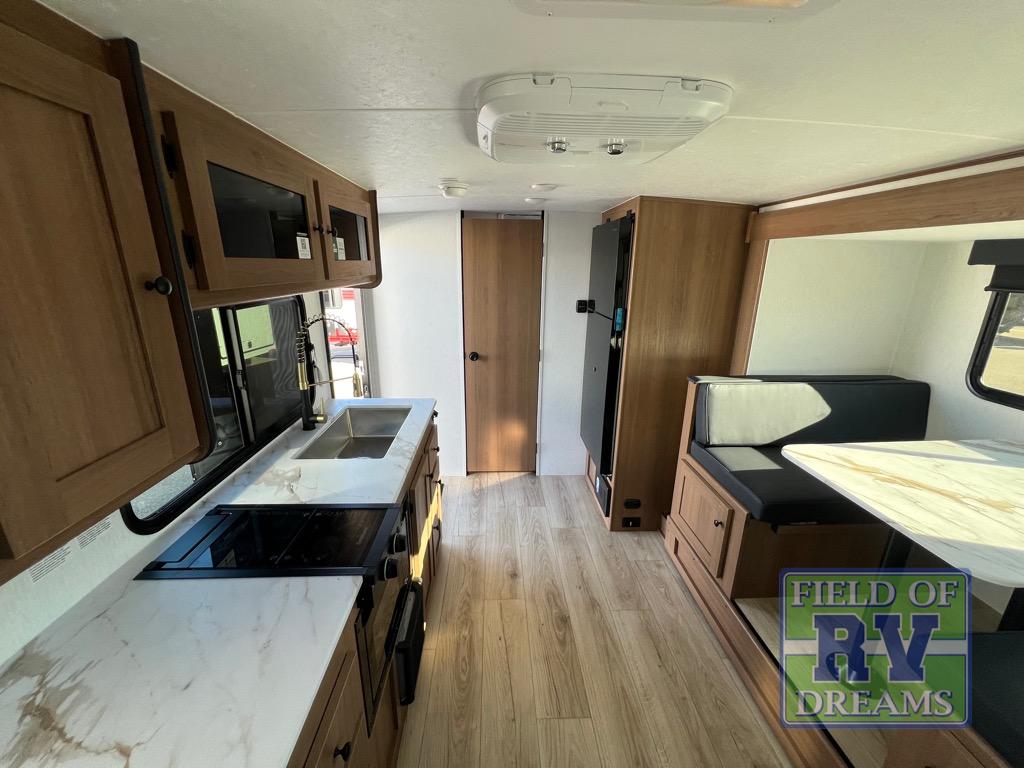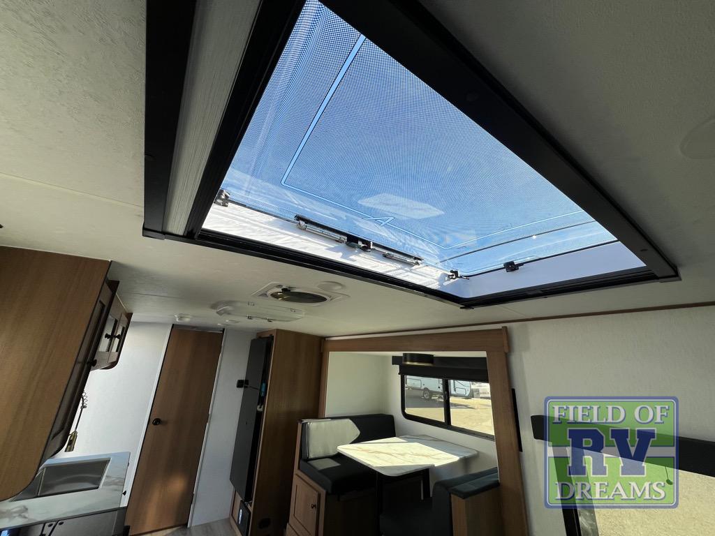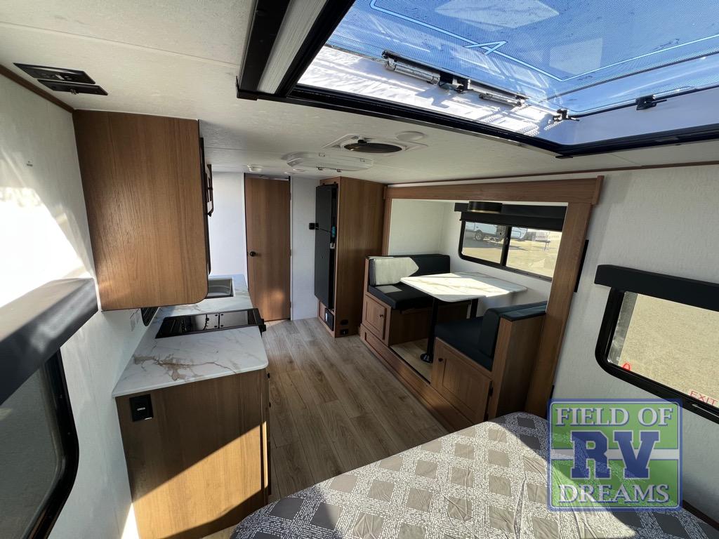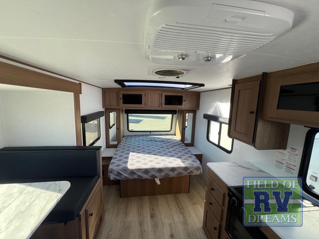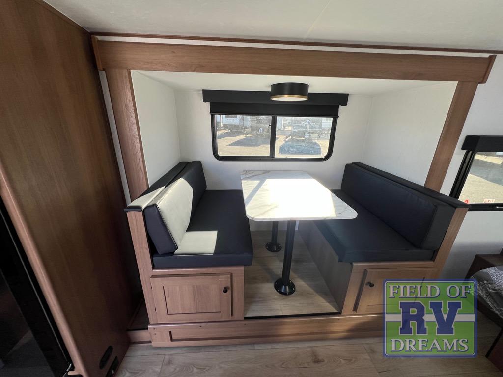 Whether you camp with friends, family or solo, this trailer gives you space for all with a spacious main living and kitchen area thanks to the booth dinette slide! The rear full bath offers a shower, sink, toilet and a wardrobe so you can get ready in privacy. A two burner cooktop and microwave underneath will let you make meals each day, and the 12V refrigerator will be perfect for perishables. The walk-around queen-size bed provides convenience when getting in and out of bed and there are two wardrobes and overhead cabinets to keep your belongings up and away. The power awning protects you from the elements when relaxing outside, and the exterior pass-through storage gives you a place to stow the outdoor equipment like camping chairs, tables, fishing poles and charcoal.