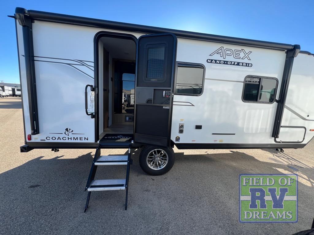 You will find comfort, convenience, and a sturdy construction with each of these Coachmen RV Apex Nano travel trailers! They are held together with an aluma-cage construction, an I-beam chassis, plus vacuum-bonded laminated dual Azdel fiberglass walls for double the protection against the elements. The 200-watt solar panel with a 30 amp control charger is included within the Off-Grid Package, along with two 20 lb. LP tanks, a high velocity power roof vent, plus 12V outlets to keep you powered up. More exterior feature include a hot/cold shower, four stabilizer jacks, a power awning with LED lighting, and magnetic baggage door catches to easily pack and unload your gear. You will love the interior of your Apex Nano with Congoleum residential flooring, one-piece seamless edge countertops, matte black hardware in the galley, and a hand-crafted wood medicine cabinet in the bath.