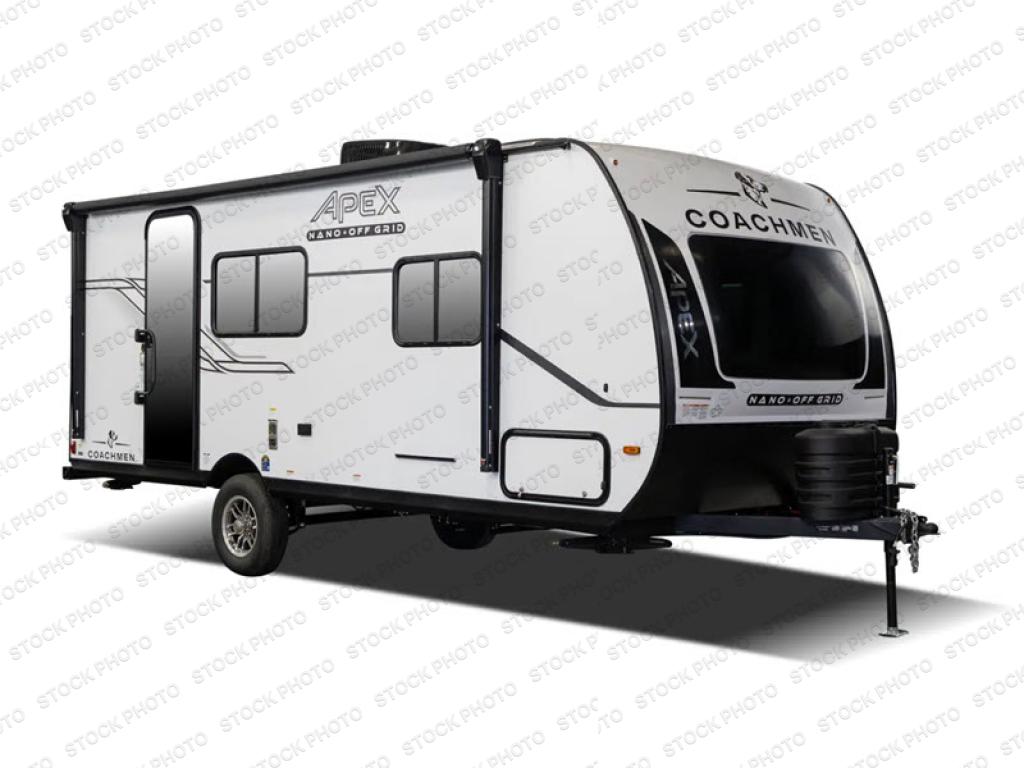 You will find comfort, convenience, and a sturdy construction with each of these Coachmen RV Apex Nano travel trailers! They are held together with an aluma-cage construction, an I-beam chassis, plus vacuum-bonded laminated dual Azdel fiberglass walls for double the protection against the elements. The 400-watt solar panel with a 30 amp control charger is included, along with two 20 lb. LP tanks, a high velocity power roof vent, plus 12V outlets to keep you powered up. More exterior features include a hot/cold shower, four stabilizer jacks, a power awning with LED lighting, and radius thumb latch baggage doors to easily pack and unload your gear. You will love the interior of your Apex Nano with Congoleum residential flooring, one-piece seamless edge countertops, matte black hardware in the galley, and a hand-crafted wood medicine cabinet in the bath.