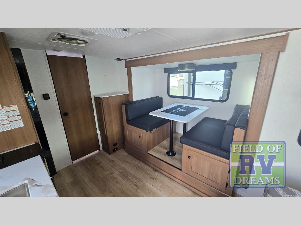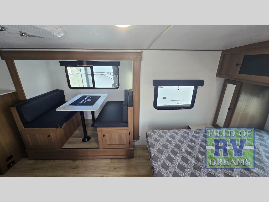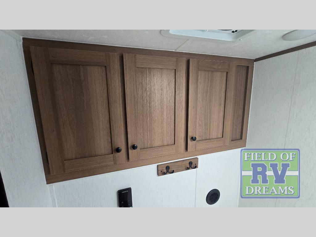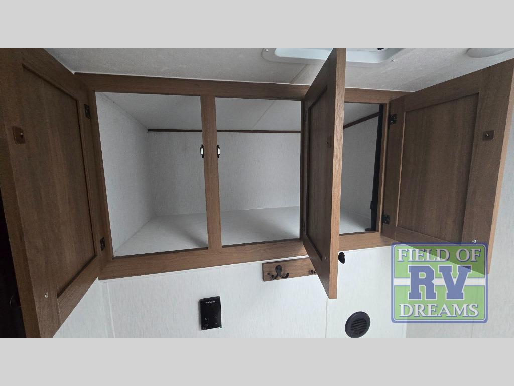 When you camp at RV parks, state parks or local campgrounds, you will love the easy setup after towing the trailer to your destination! The booth dinette slide and the power awning with LED lighting can quickly be set up so you can relax and unwind with your favorite person or people. You will have the choice of cooking inside with full amenities or outdoors on the outside kitchen, inside you will have a pantry to store all your dry goods and an air fryer microwave to heat up items. The rear bathroom includes a wardrobe and allows you privacy when inside, and the front walk-around queen-size bed or the Murphy bed option, allows you to sleep comfortably after hiking, walking or fishing. There are wardrobes at either side to allow for storing your clothes and essentials. And you will find more storage throughout for your clothing, plates, games and such, plus outside in the pass-through compartment.