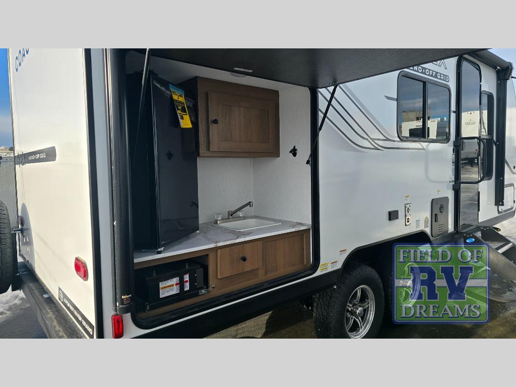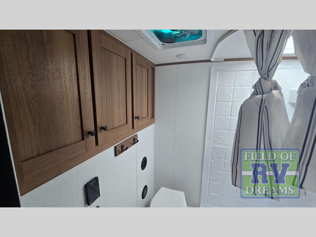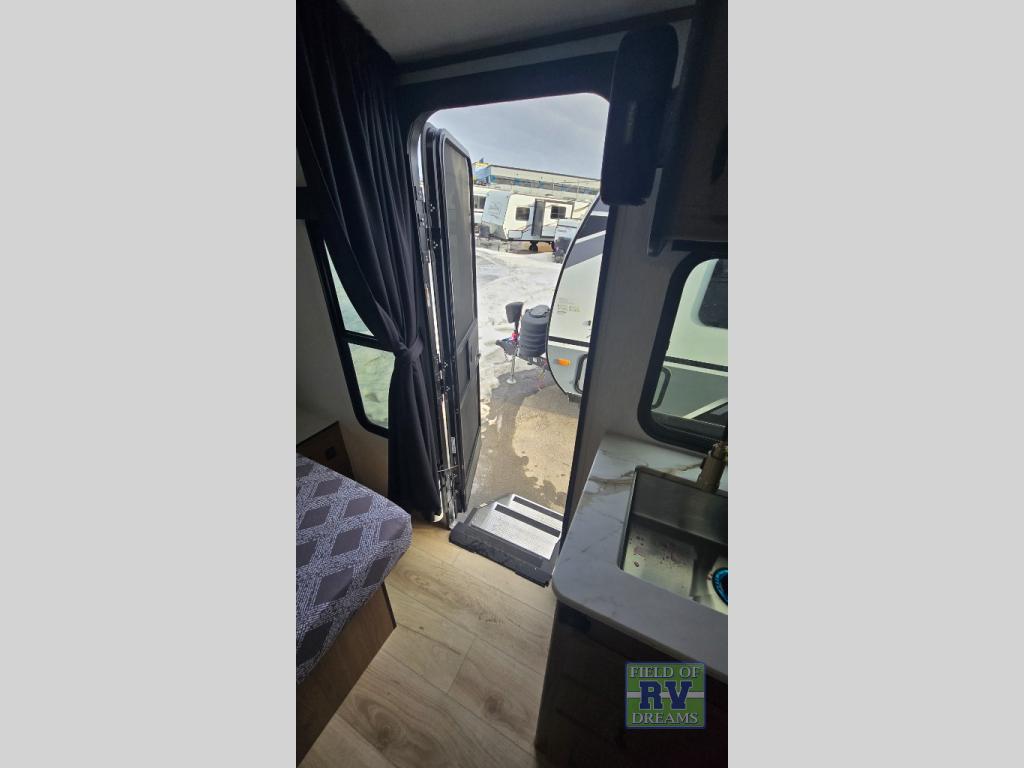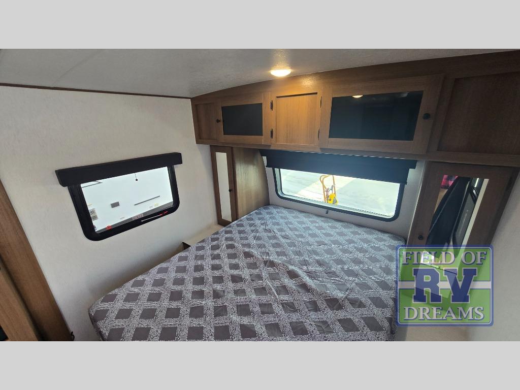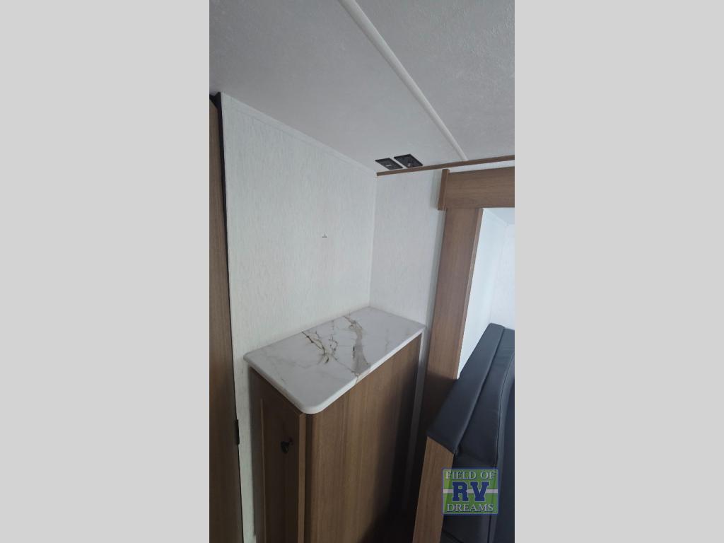 When you camp at RV parks, state parks or local campgrounds, you will love the easy setup after towing the trailer to your destination! The booth dinette slide and the power awning with LED lighting can quickly be set up so you can relax and unwind with your favorite person or people. You will have the choice of cooking inside with full amenities or outdoors on the outside kitchen, inside you will have a pantry to store all your dry goods and an air fryer microwave to heat up items. The rear bathroom includes a wardrobe and allows you privacy when inside, and the front walk-around queen-size bed or the Murphy bed option, allows you to sleep comfortably after hiking, walking or fishing. There are wardrobes at either side to allow for storing your clothes and essentials. And you will find more storage throughout for your clothing, plates, games and such, plus outside in the pass-through compartment.