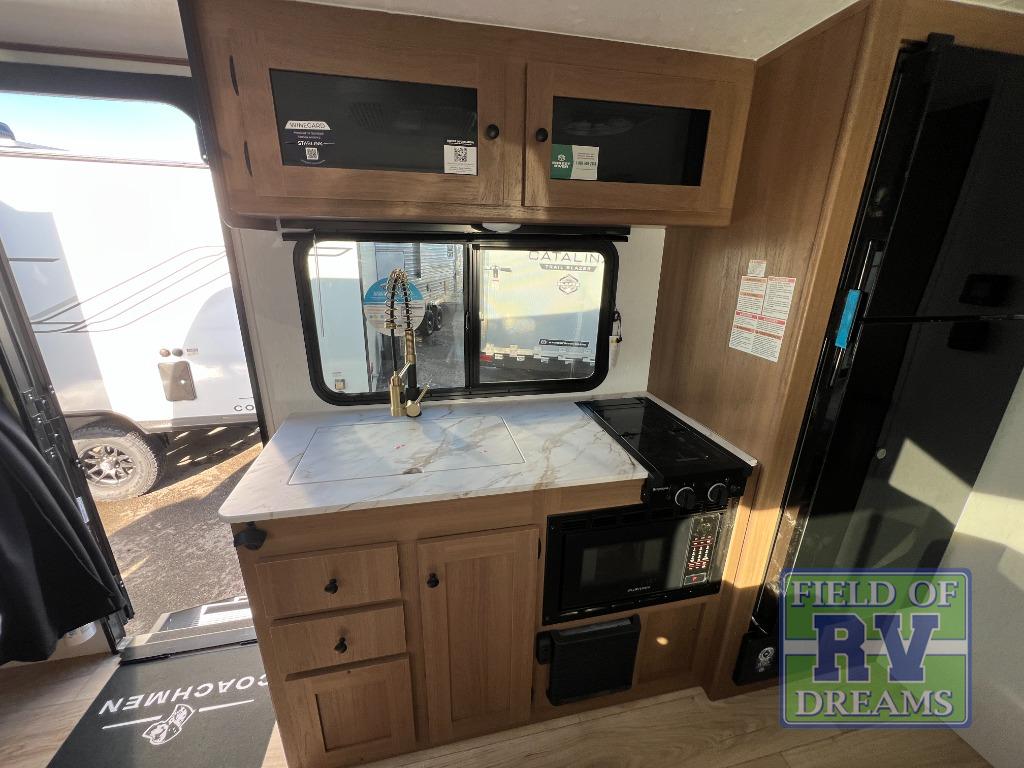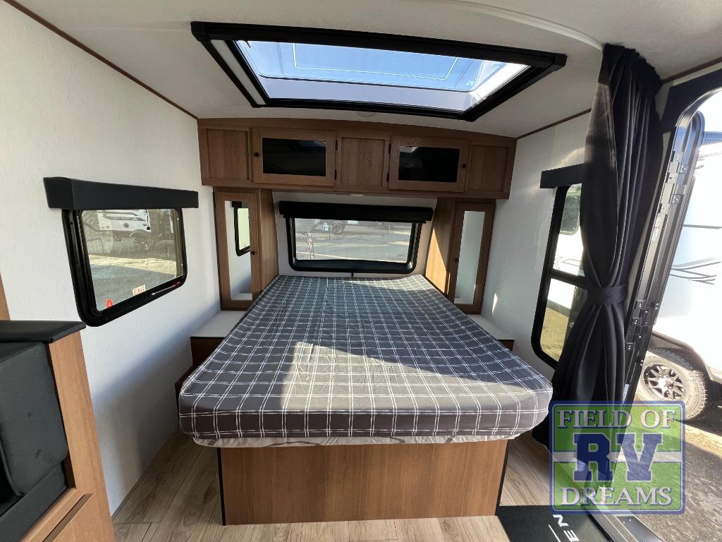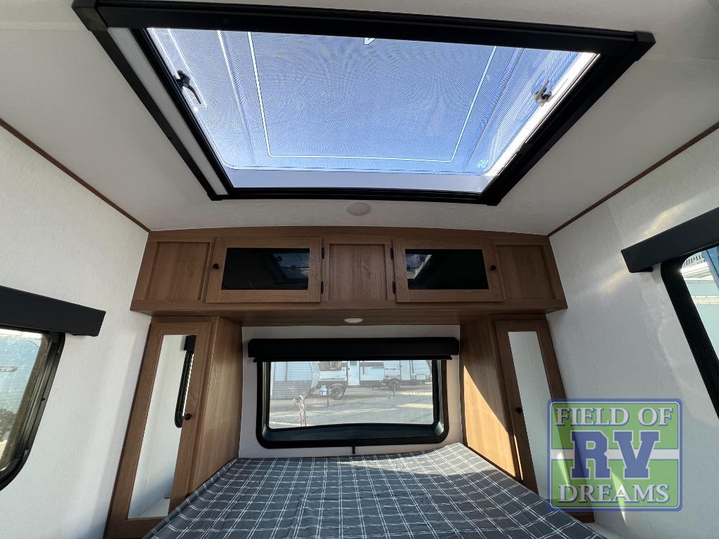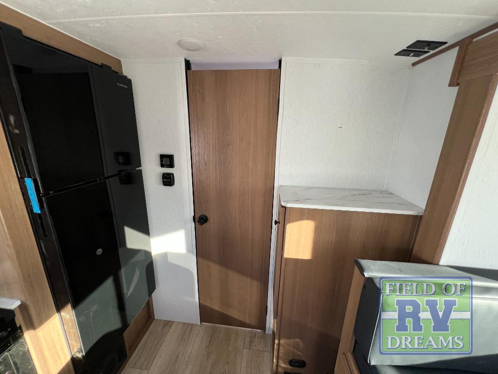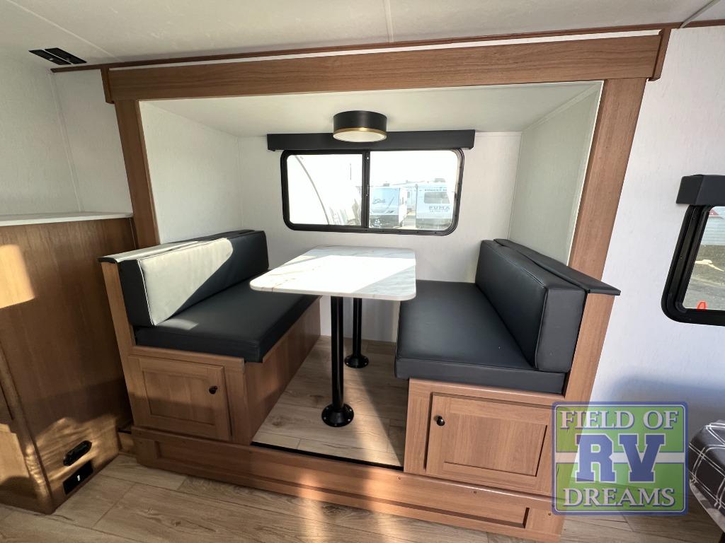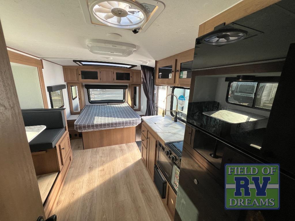When you camp at RV parks, state parks or local campgrounds, you will love the easy setup after towing the trailer to your destination! The booth dinette slide and the power awning with LED lighting can quickly be set up so you can relax and unwind with your favorite person or people. You will have the choice of cooking inside with full amenities or outdoors on the outside kitchen, inside you will have a pantry to store all your dry goods and an air fryer microwave to heat up items. The rear bathroom includes a wardrobe and allows you privacy when inside, and the front walk-around queen-size bed or the Murphy bed option, allows you to sleep comfortably after hiking, walking or fishing. There are wardrobes at either side to allow for storing your clothes and essentials. And you will find more storage throughout for your clothing, plates, games and such, plus outside in the pass-through compartment.