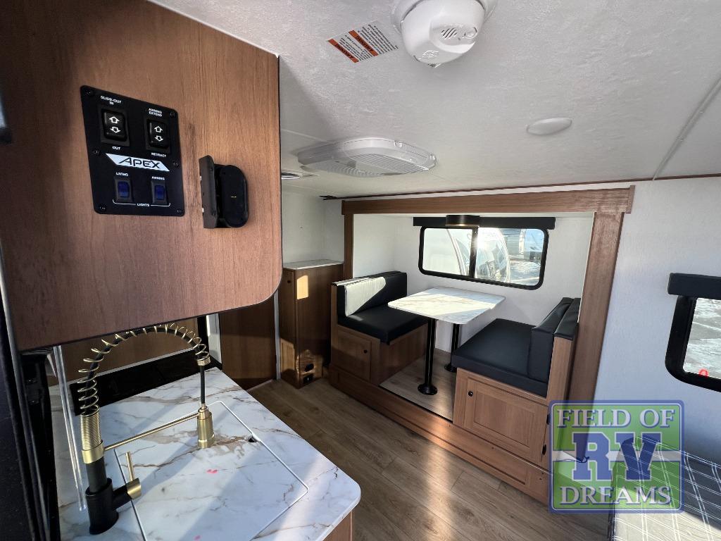 You will find comfort, convenience, and a sturdy construction with each of these Coachmen RV Apex Nano travel trailers! They are held together with an aluma-cage construction, an I-beam chassis, plus vacuum-bonded laminated dual Azdel fiberglass walls for double the protection against the elements. The 400-watt solar panel with a 30 amp control charger is included, along with two 20 lb. LP tanks, a high velocity power roof vent, plus 12V outlets to keep you powered up. More exterior features include a hot/cold shower, four stabilizer jacks, a power awning with LED lighting, and radius thumb latch baggage doors to easily pack and unload your gear. You will love the interior of your Apex Nano with Congoleum residential flooring, one-piece seamless edge countertops, matte black hardware in the galley, and a hand-crafted wood medicine cabinet in the bath.