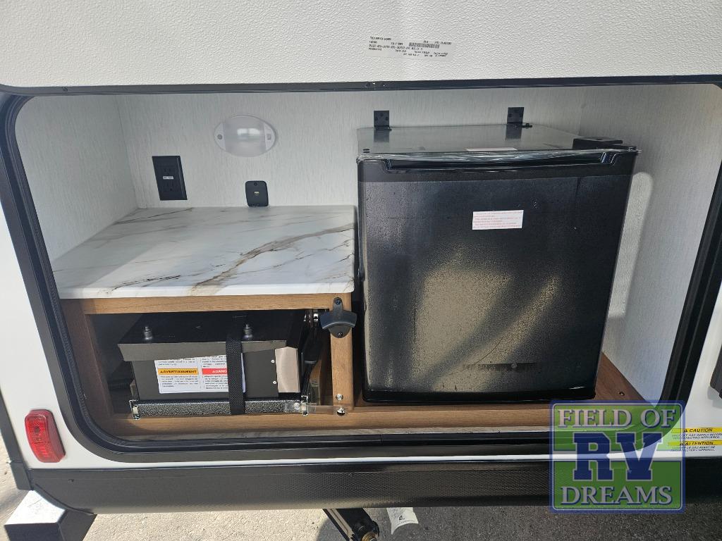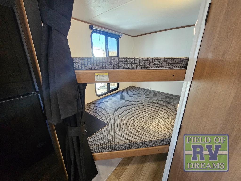 You and a few friends or family members can camp comfortably in this travel trailer! It features a front queen bed with wardrobes on either side to keep your clothes out of the way or you can switch it out for the optional Murphy bed for more versatility. Two others can sleep on the rear corner upper double bed and lower flip up double bed. After you have fried up some eggs on the two burner cooktop and heated up a piece of banana bread in the microwave, you can head to the booth dinette slide to enjoy it. There is even a pantry to store your coffee grounds and snacks. Now that your bellies are full, you can freshen up in the rear corner bathroom with the tub/shower.