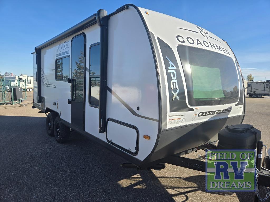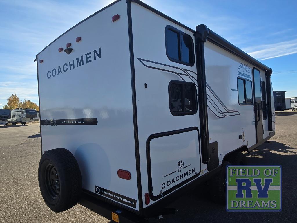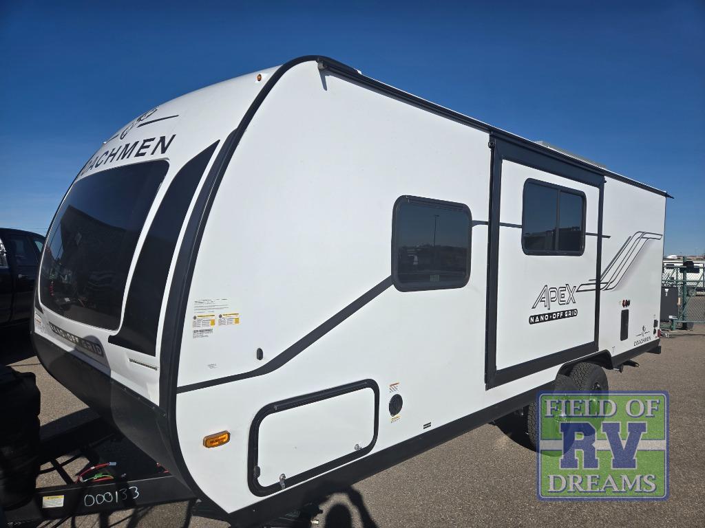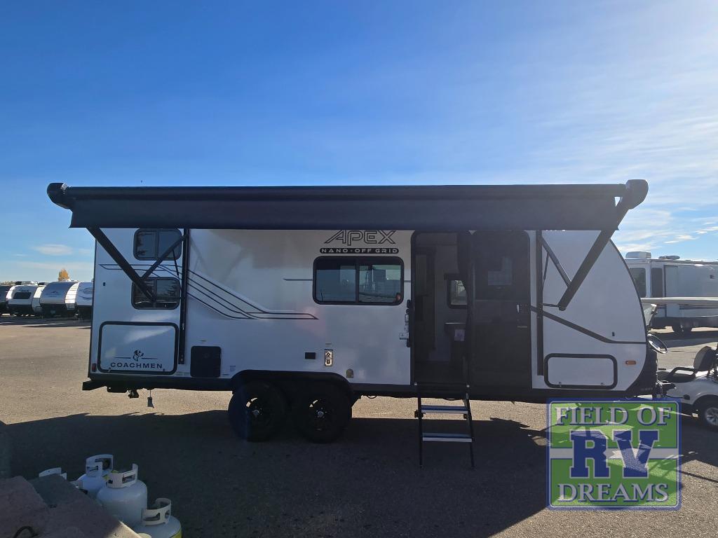 You will find comfort, convenience, and a sturdy construction with each of these Coachmen RV Apex Nano travel trailers! They are held together with an aluma-cage construction, an I-beam chassis, plus vacuum-bonded laminated dual Azdel fiberglass walls for double the protection against the elements. The 400-watt solar panel with a 30 amp control charger is included, along with two 20 lb. LP tanks, a high velocity power roof vent, plus 12V outlets to keep you powered up. More exterior features include a hot/cold shower, four stabilizer jacks, a power awning with LED lighting, and radius thumb latch baggage doors to easily pack and unload your gear. You will love the interior of your Apex Nano with Congoleum residential flooring, one-piece seamless edge countertops, matte black hardware in the galley, and a hand-crafted wood medicine cabinet in the bath.