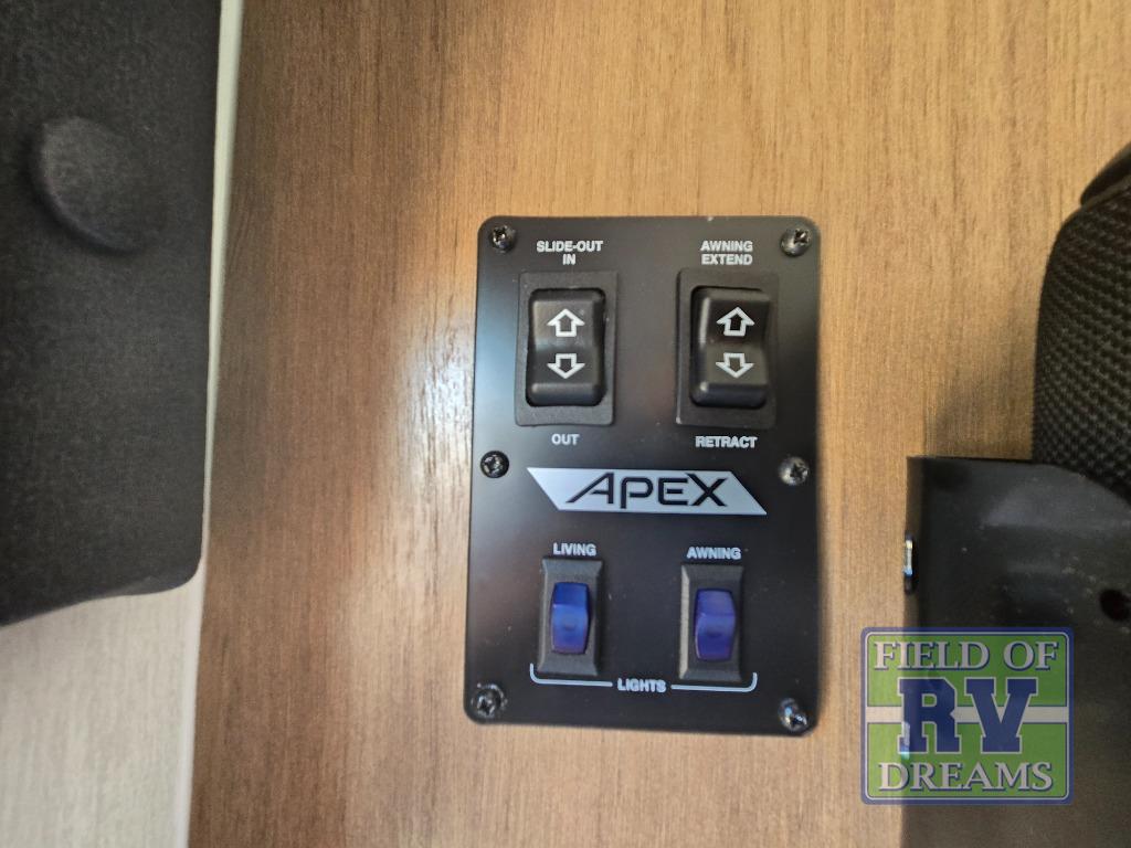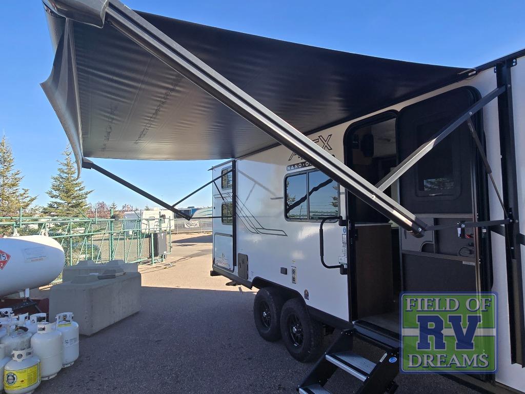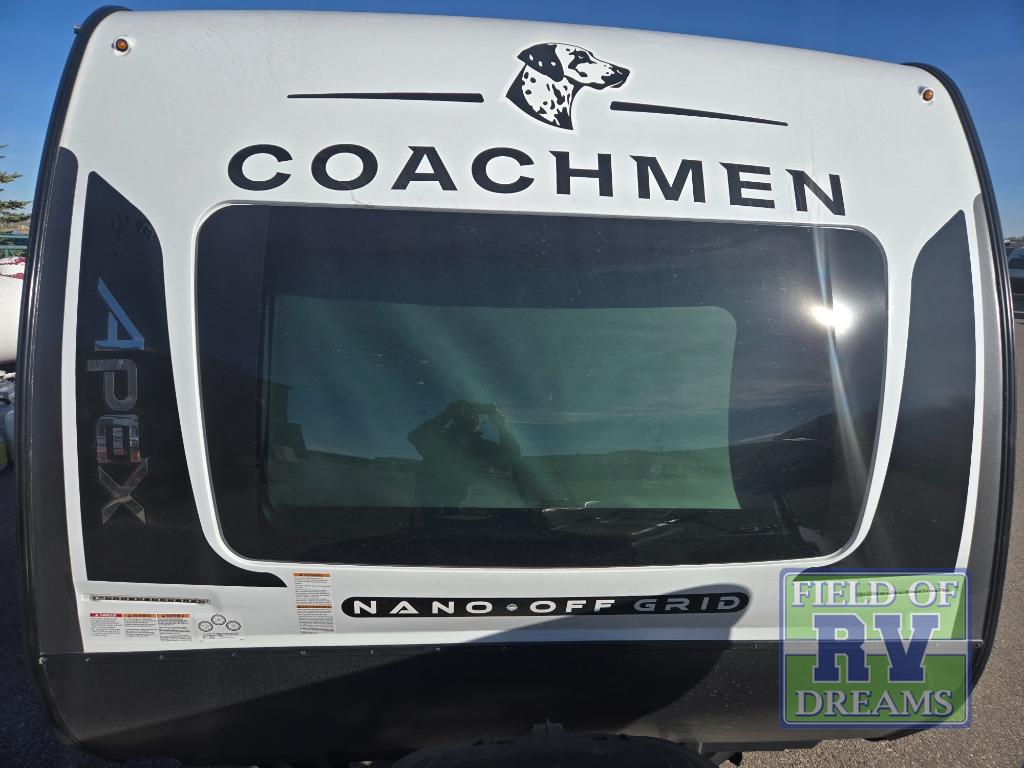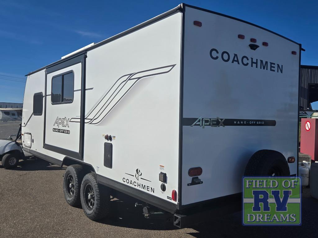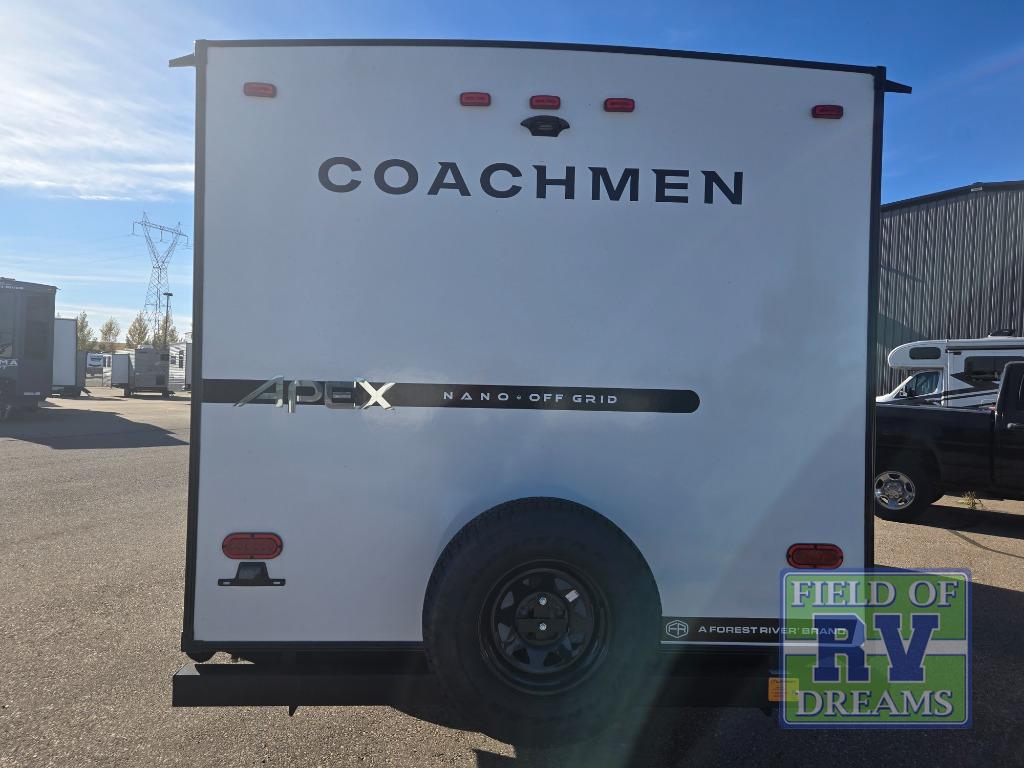You will find comfort, convenience, and a sturdy construction with each of these Coachmen RV Apex Nano travel trailers! They are held together with an aluma-cage construction, an I-beam chassis, plus vacuum-bonded laminated dual Azdel fiberglass walls for double the protection against the elements. The 400-watt solar panel with a 30 amp control charger is included, along with two 20 lb. LP tanks, a high velocity power roof vent, plus 12V outlets to keep you powered up. More exterior features include a hot/cold shower, four stabilizer jacks, a power awning with LED lighting, and radius thumb latch baggage doors to easily pack and unload your gear. You will love the interior of your Apex Nano with Congoleum residential flooring, one-piece seamless edge countertops, matte black hardware in the galley, and a hand-crafted wood medicine cabinet in the bath.