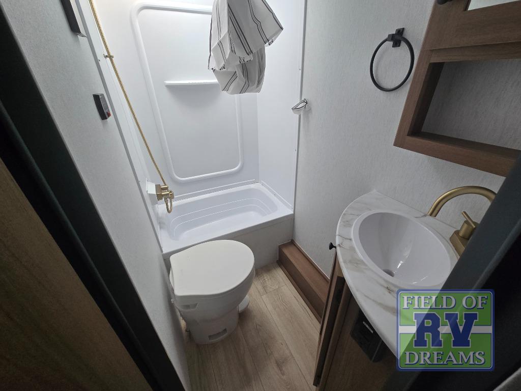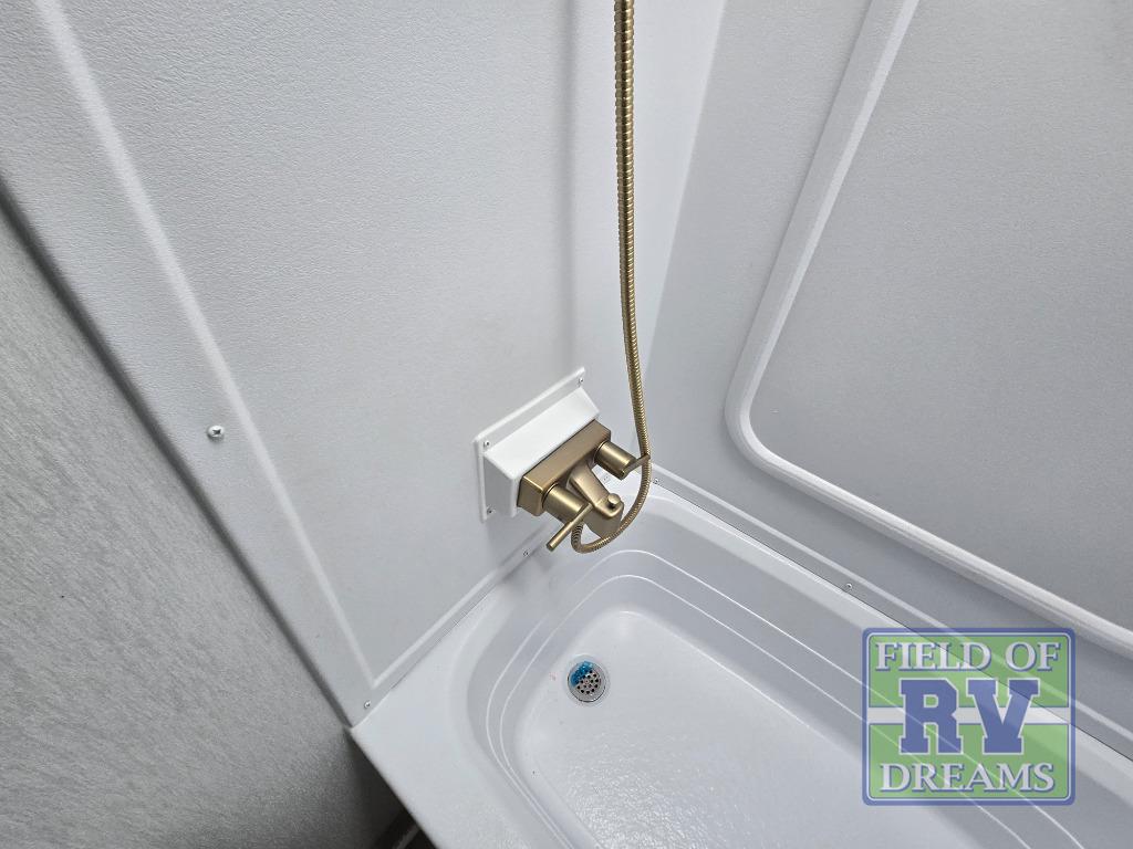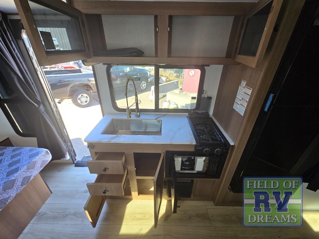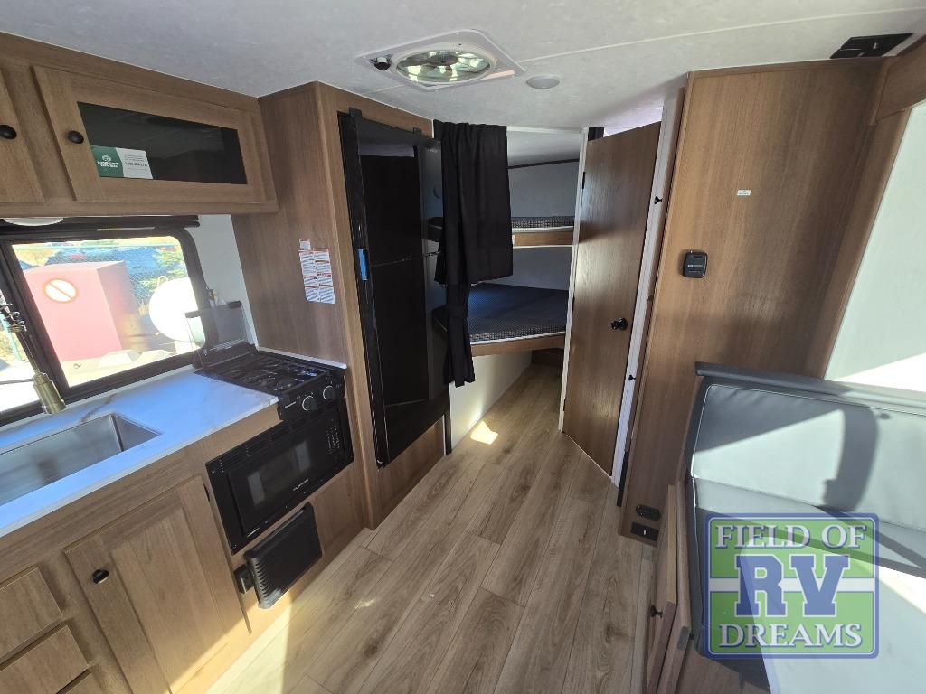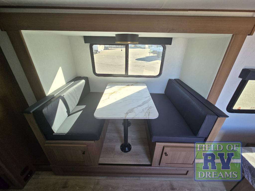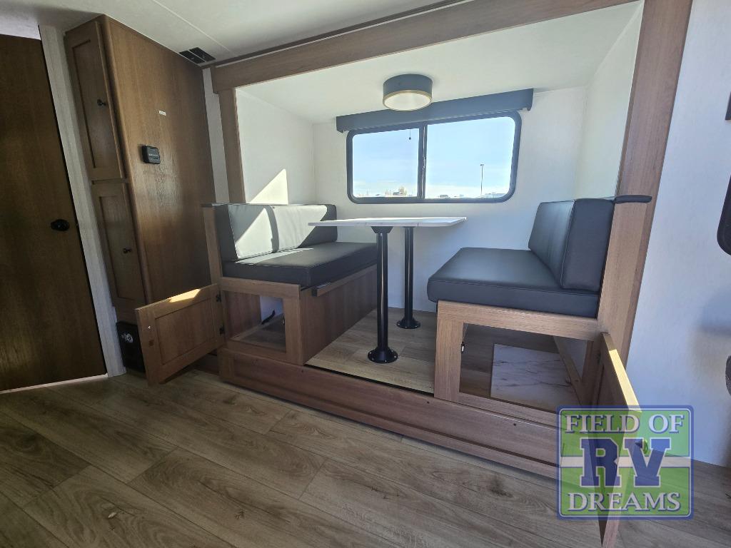 You and a few friends or family members can camp comfortably in this travel trailer! It features a front queen bed with wardrobes on either side to keep your clothes out of the way or you can switch it out for the optional Murphy bed for more versatility. Two others can sleep on the rear corner upper double bed and lower flip up double bed. After you have fried up some eggs on the two burner cooktop and heated up a piece of banana bread in the microwave, you can head to the booth dinette slide to enjoy it. There is even a pantry to store your coffee grounds and snacks. Now that your bellies are full, you can freshen up in the rear corner bathroom with the tub/shower.