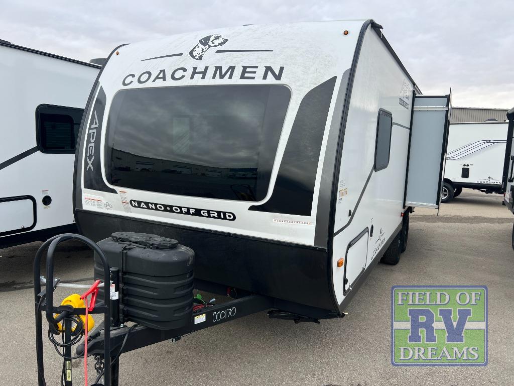 You will find comfort, convenience, and a sturdy construction with each of these Coachmen RV Apex Nano travel trailers! They are held together with an aluma-cage construction, an I-beam chassis, plus vacuum-bonded laminated dual Azdel fiberglass walls for double the protection against the elements. The 400-watt solar panel with a 30 amp control charger is included, along with two 20 lb. LP tanks, a high velocity power roof vent, plus 12V outlets to keep you powered up. More exterior features include a hot/cold shower, four stabilizer jacks, a power awning with LED lighting, and radius thumb latch baggage doors to easily pack and unload your gear. You will love the interior of your Apex Nano with Congoleum residential flooring, one-piece seamless edge countertops, matte black hardware in the galley, and a hand-crafted wood medicine cabinet in the bath.