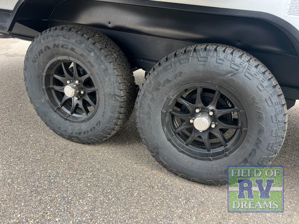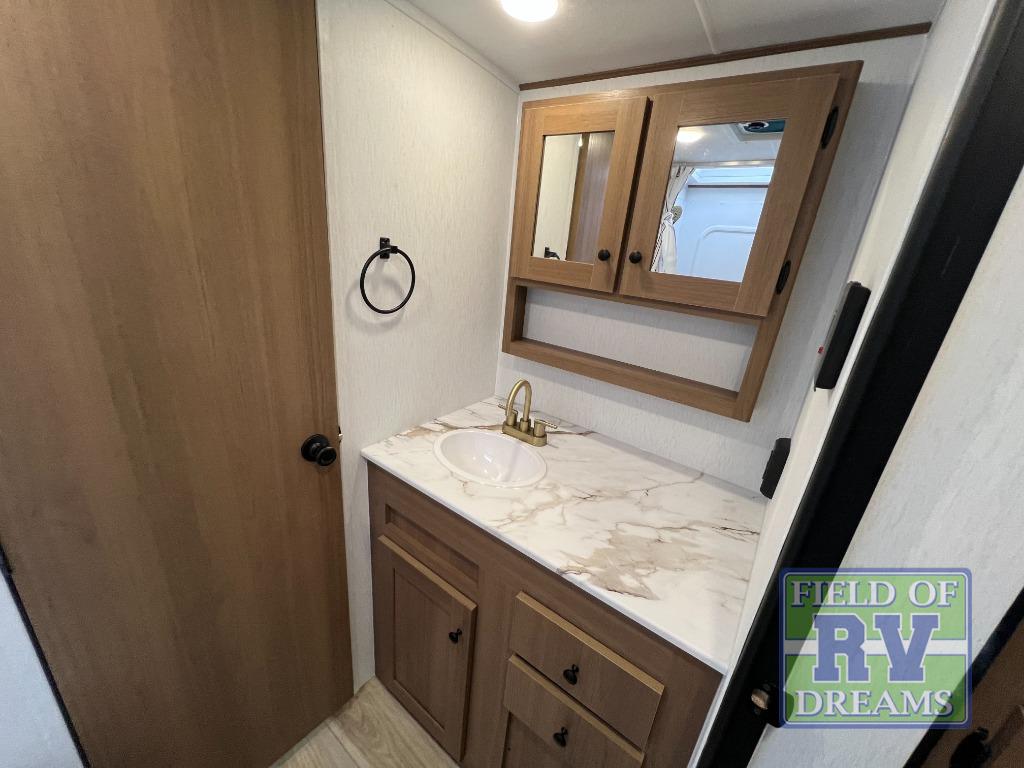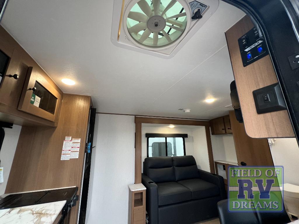 As you step inside, you’re welcomed by a spacious rear kitchen that spans the full width of the trailer, making meal prep both convenient and enjoyable. The kitchen is equipped with a stainless-steel sink featuring a flush mount cover for added counter space, a 2-burner cooktop, an air fryer microwave, and a 10 cu. ft. refrigerator, perfect for storing all your groceries. A pantry adds even more storage for dry goods and kitchen essentials. Just in front of the kitchen, a Bar-V counter with chairs offers a great spot to dine, work, or relax with company. Across from the counter, a comfortable sofa slide provides a cozy lounging area and can also convert into an extra sleeping space when needed. Moving forward, the walk-through bathroom features a shower, a skylight for natural light, and a foot flush toilet for added convenience. At the front of the trailer, the private bedroom includes a queen bed flanked by wardrobes on each side, offering both comfort and practical storage for all your essentials.