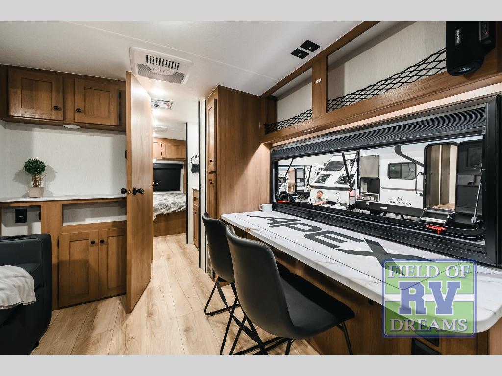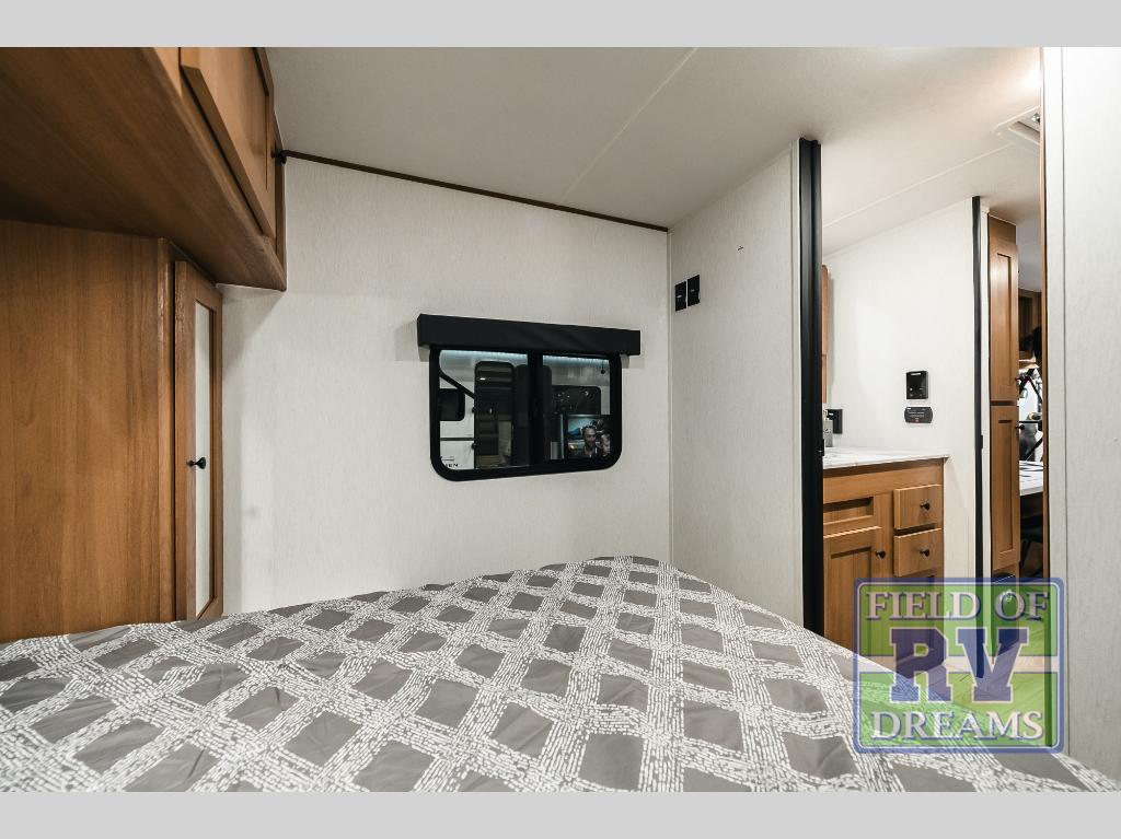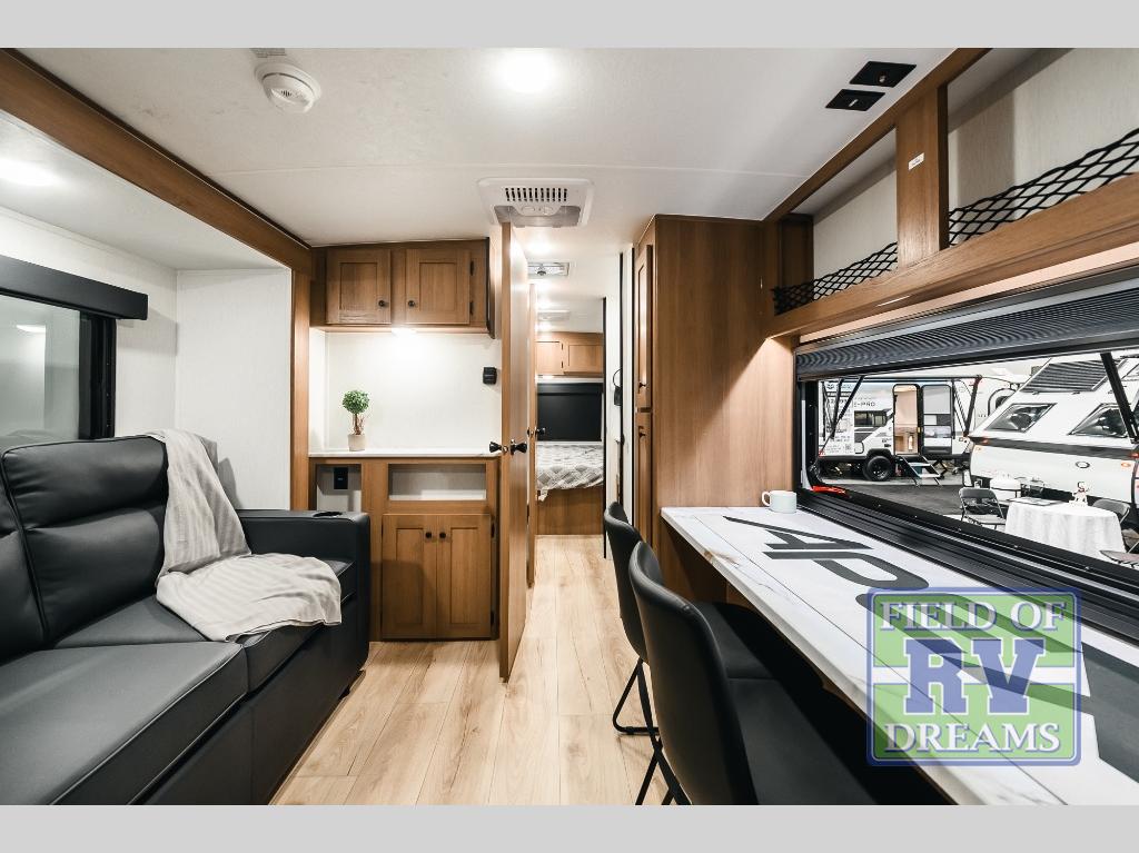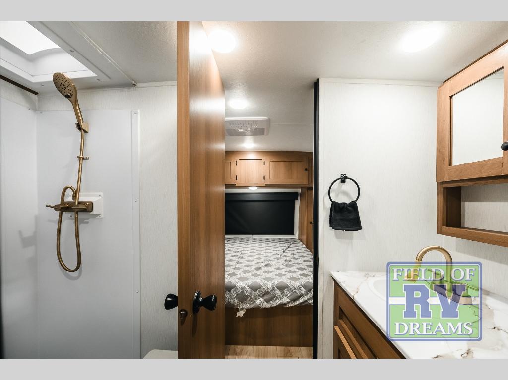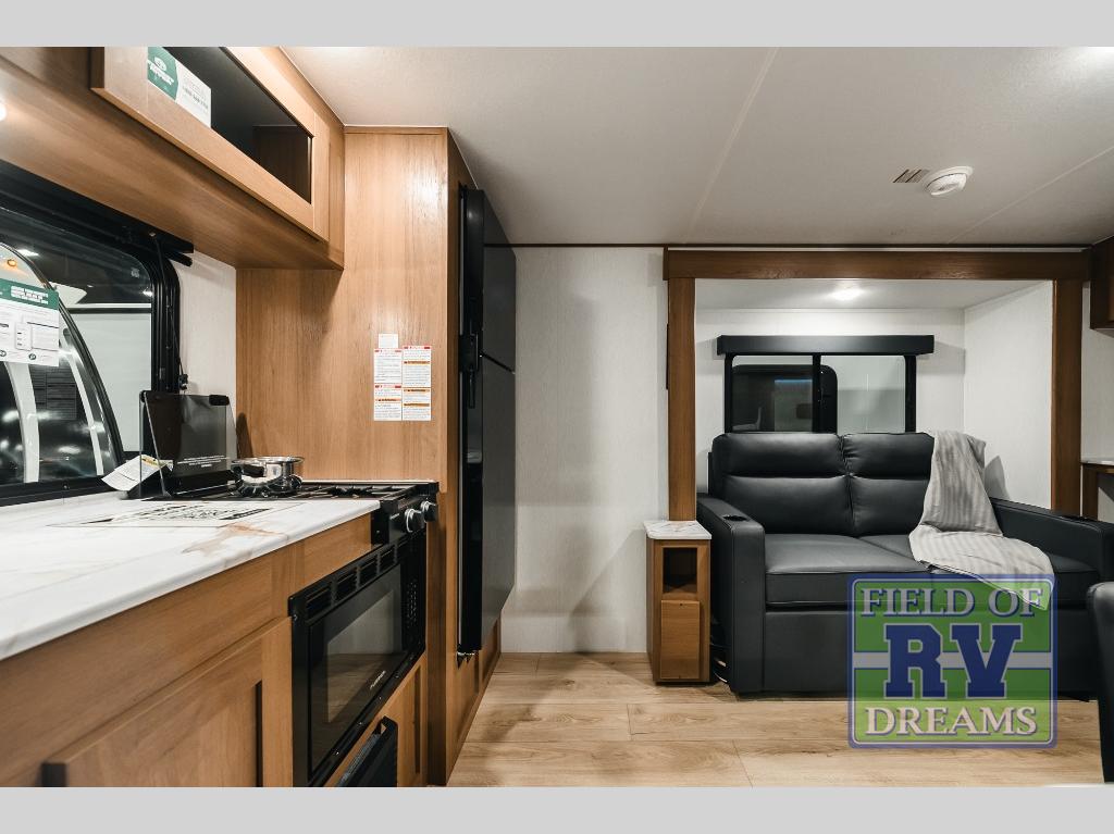 As you step inside, you’re welcomed by a spacious rear kitchen that spans the full width of the trailer, making meal prep both convenient and enjoyable. The kitchen is equipped with a stainless-steel sink featuring a flush mount cover for added counter space, a 2-burner cooktop, an air fryer microwave, and a 10 cu. ft. refrigerator, perfect for storing all your groceries. A pantry adds even more storage for dry goods and kitchen essentials. Just in front of the kitchen, a Bar-V counter with chairs offers a great spot to dine, work, or relax with company. Across from the counter, a comfortable sofa slide provides a cozy lounging area and can also convert into an extra sleeping space when needed. Moving forward, the walk-through bathroom features a shower, a skylight for natural light, and a foot flush toilet for added convenience. At the front of the trailer, the private bedroom includes a queen bed flanked by wardrobes on each side, offering both comfort and practical storage for all your essentials.