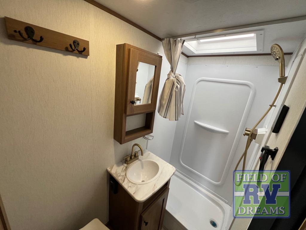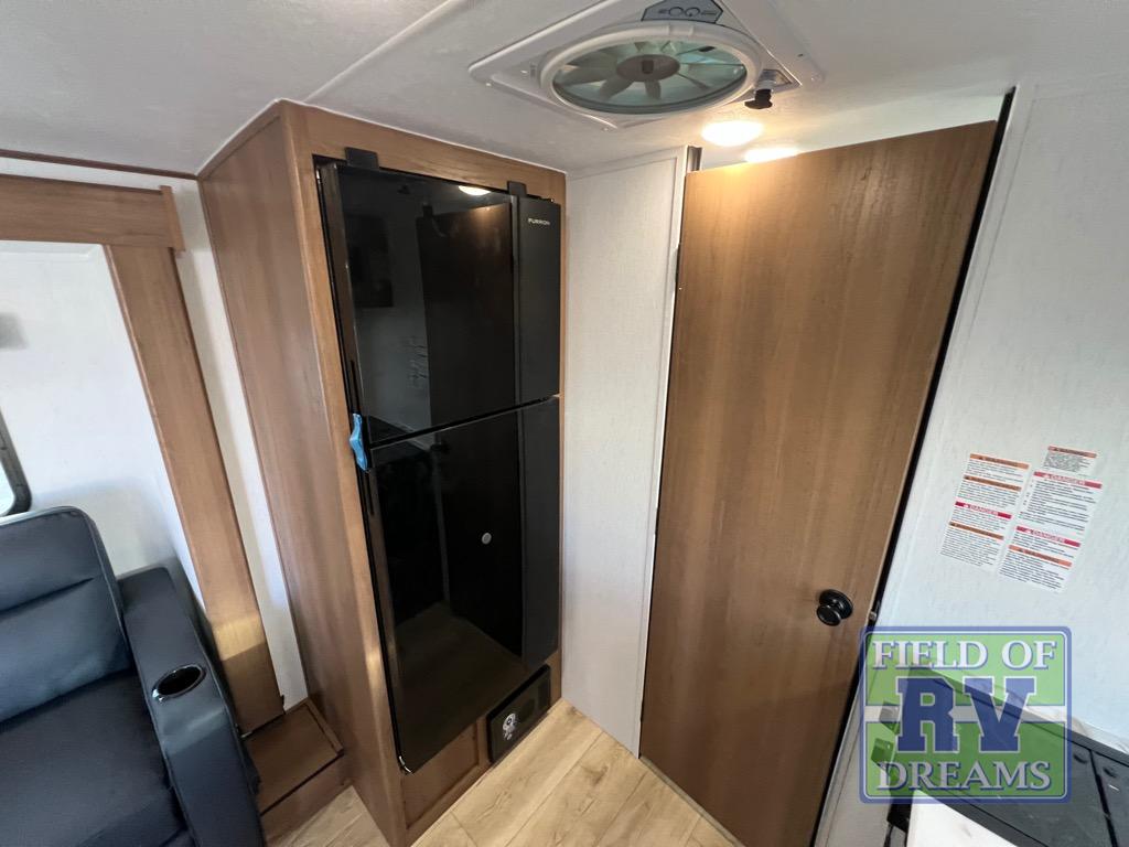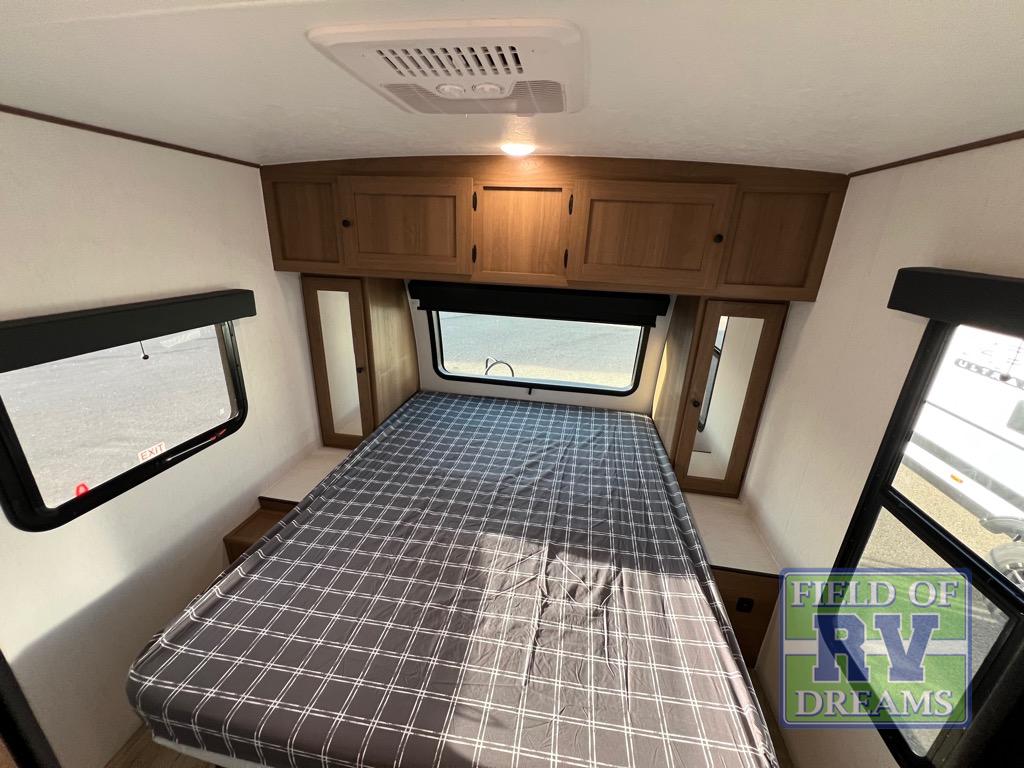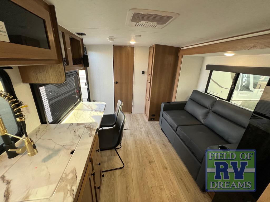 As you enter this travel trailer, you'll find the full rear bathroom designed for comfort and convenience. It features a shower, a skylight for natural light, and an on-demand tankless water heater, ensuring hot showers whenever you need them. A foot flush toilet and a wardrobe offer added practicality and storage for your essentials. Moving to the middle of the trailer, the main living area includes a sofa slide-out nestled between a pantry, perfect for storing snacks and dry goods, and a 10-cu. ft. refrigerator to keep your groceries fresh. Opposite the slide, the kitchen is fully equipped with a 2-burner cooktop and an air fryer microwave, allowing you to prepare meals with ease. Beside the kitchen is a counter with chairs, offering a cozy spot to dine or relax. At the front of the trailer, the private bedroom features a comfortable queen bed and dual wardrobes on either side, giving you a restful retreat with plenty of storage for your clothes and personal items.