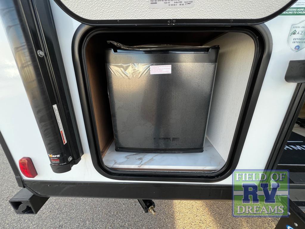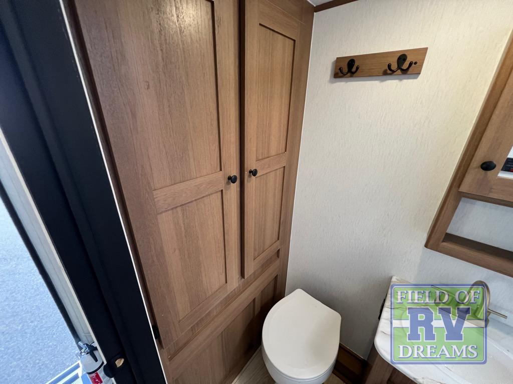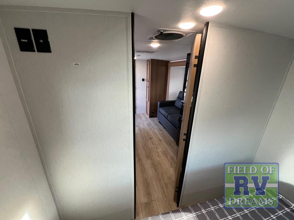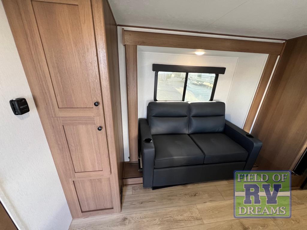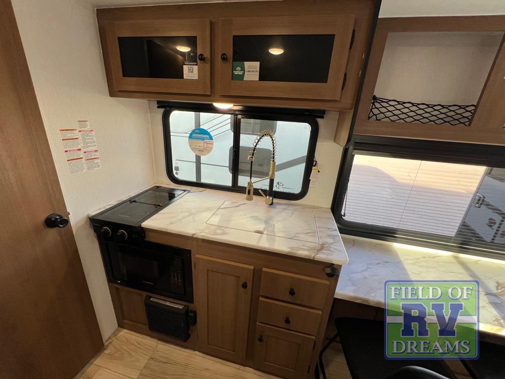 As you enter this travel trailer, you'll find the full rear bathroom designed for comfort and convenience. It features a shower, a skylight for natural light, and an on-demand tankless water heater, ensuring hot showers whenever you need them. A foot flush toilet and a wardrobe offer added practicality and storage for your essentials. Moving to the middle of the trailer, the main living area includes a sofa slide-out nestled between a pantry, perfect for storing snacks and dry goods, and a 10-cu. ft. refrigerator to keep your groceries fresh. Opposite the slide, the kitchen is fully equipped with a 2-burner cooktop and an air fryer microwave, allowing you to prepare meals with ease. Beside the kitchen is a counter with chairs, offering a cozy spot to dine or relax. At the front of the trailer, the private bedroom features a comfortable queen bed and dual wardrobes on either side, giving you a restful retreat with plenty of storage for your clothes and personal items.