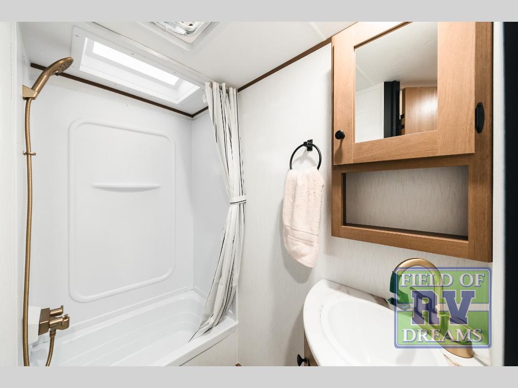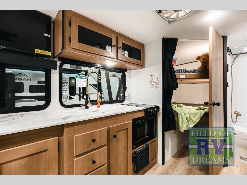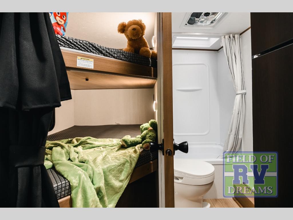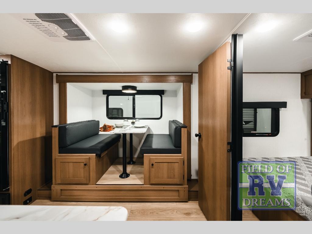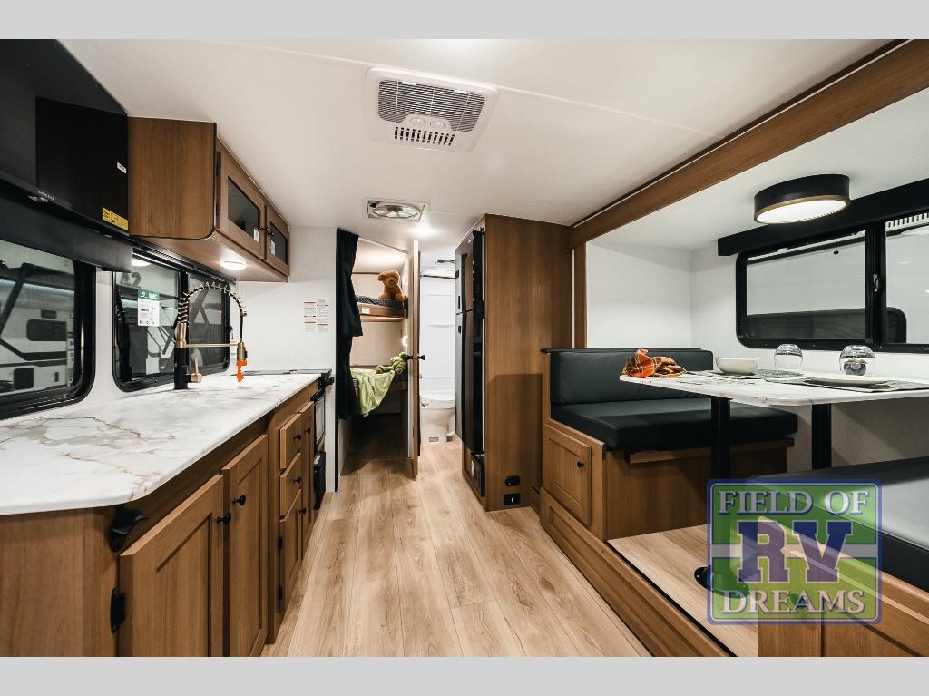 As you step into this trailer, you're welcomed by a private front bedroom featuring a comfortable queen bed, perfect for a restful night's sleep, in between dual wardrobes to neatly store your clothes and essentials. Moving to the center of the space, the dinette nestled in the slide-out offers a cozy spot to dine, gather, or convert into an extra-sleeping area if needed. Just beside it, the 10-cu. ft. refrigerator provides ample space to keep your groceries fresh. Opposite the dinette, the fully equipped kitchen makes cooking on the road a breeze, complete with a stainless-steel sink with a flush-mount cover, an air fryer microwave, and a two-burner cooktop. Toward the rear, you’ll find 48" x 74" double bed bunks, with the lower bunk able to flip up for added flexibility, perfect for accommodating the whole crew. Adjacent to the bunks, a full bathroom adds extra convenience, eliminating the need to rely on campground facilities.