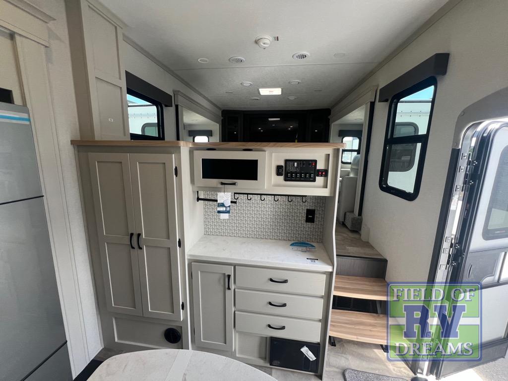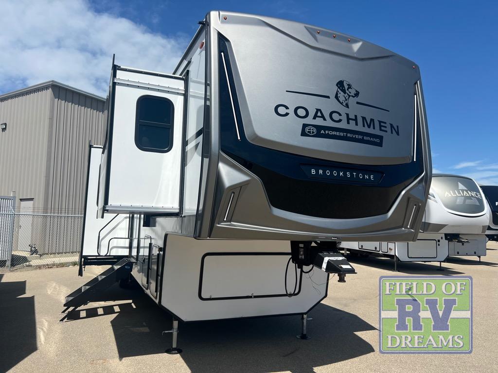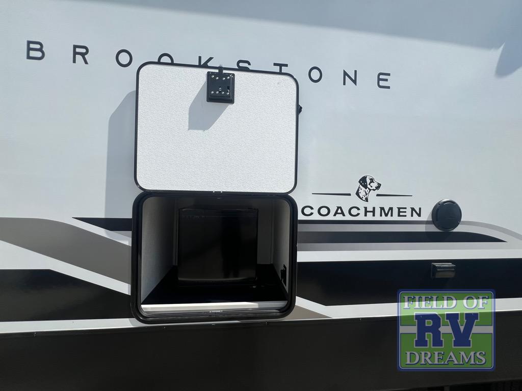The Brookstone fifth wheels by Coachmen are coming to you with wide-body comfort, home-like amenities, and unique designs for a truly luxurious RV. The Weather Shield+ consists of a 6X double Azdel aluminum cage sidewall system, a Radiant Pro weather barrier system, and more that will help you extend your camping season or go full-time. Head inside to find solid surface countertops in the kitchen, an 4K Smart LED TV in the living room, slow rise roller night shades, and the list of comforts goes on! The Brookstone also includes 6-point electric auto-leveling, four Solid Step entry steps, an electric awning with LED lights, and many more exterior conveniences!
