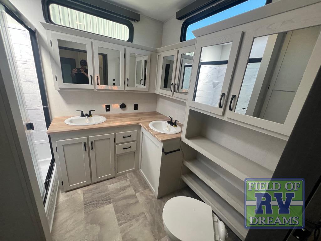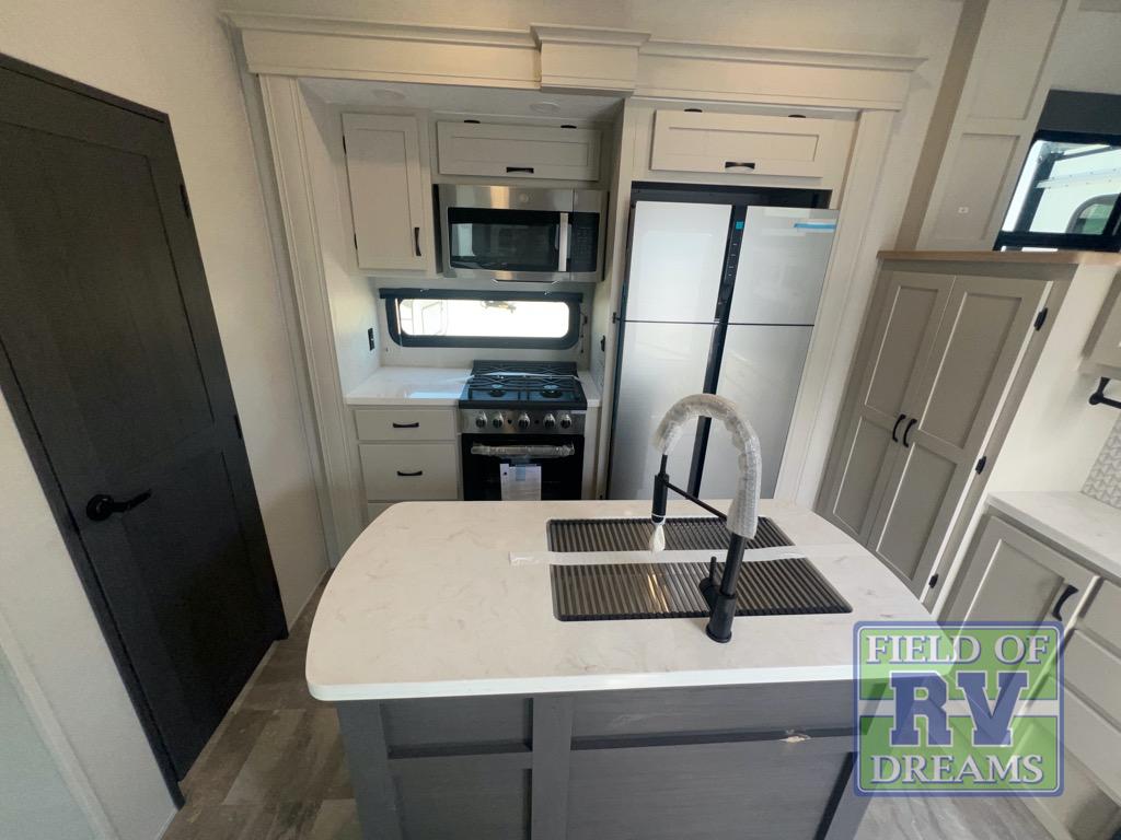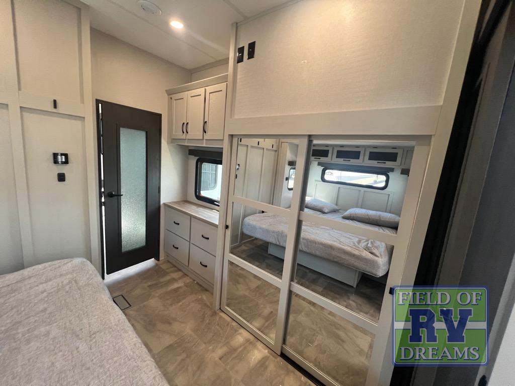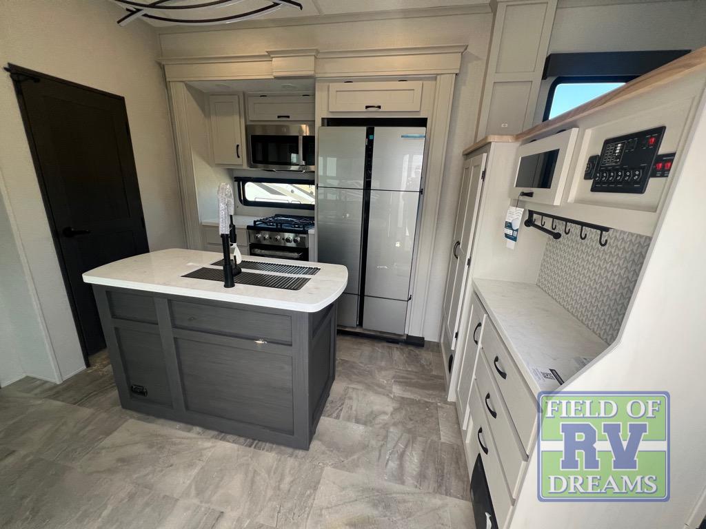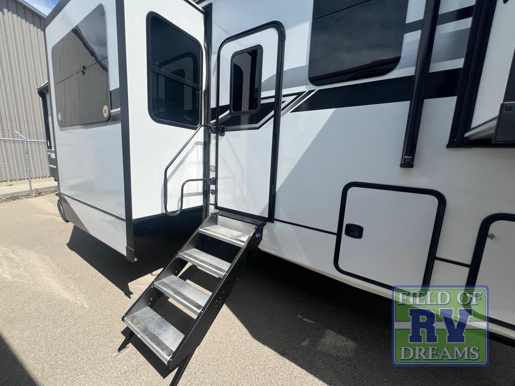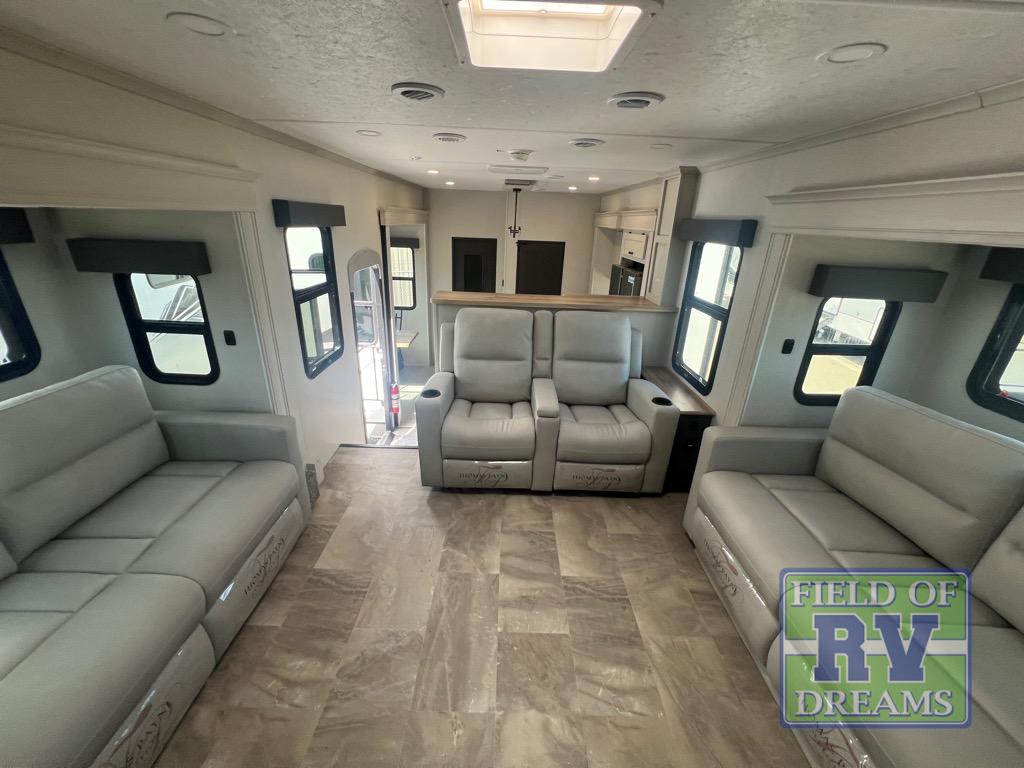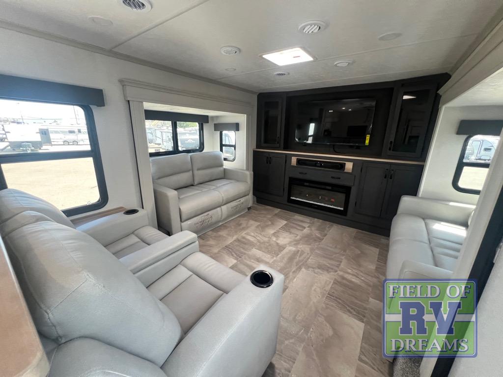 If you're looking for a luxury fifth wheel with more space and a larger sleeping capacity, you've found it! There are an impressive five slides, including dual opposing slides in the front living area and kitchen so you can really stretch out. Everyone will love to gather in the front living area on the two tri-fold sofas and theatre seating, and this room can become your guests' bedroom at night. The little ones will love to play a game at the free-standing table while the chef cooks dinner on the residential cooktop with a stainless steel oven. You'll also find a pantry here for dry goods and a 12V refrigerator for perishables. The feature that really stands out in this model is the master suite, take a look! A king bed slide and you'll have a dresser and a wardrobe for your clothes, plus access to the full bathroom. The spacious full rear bath includes a large shower with a seat, a large dual sink vanity, and a wardrobe with washer and dryer prep. And we didn't even mention the outside refrigerator that will be perfect for cold drinks under the 14' power awning!